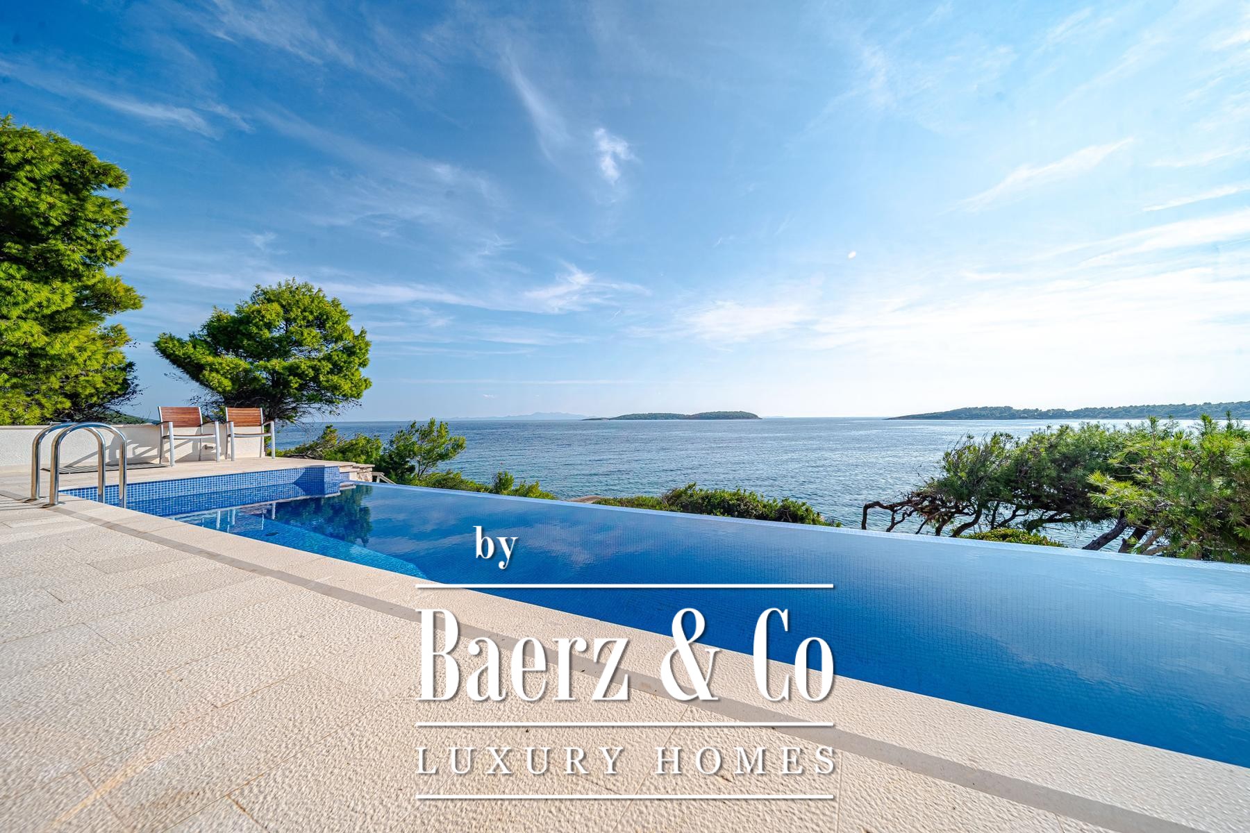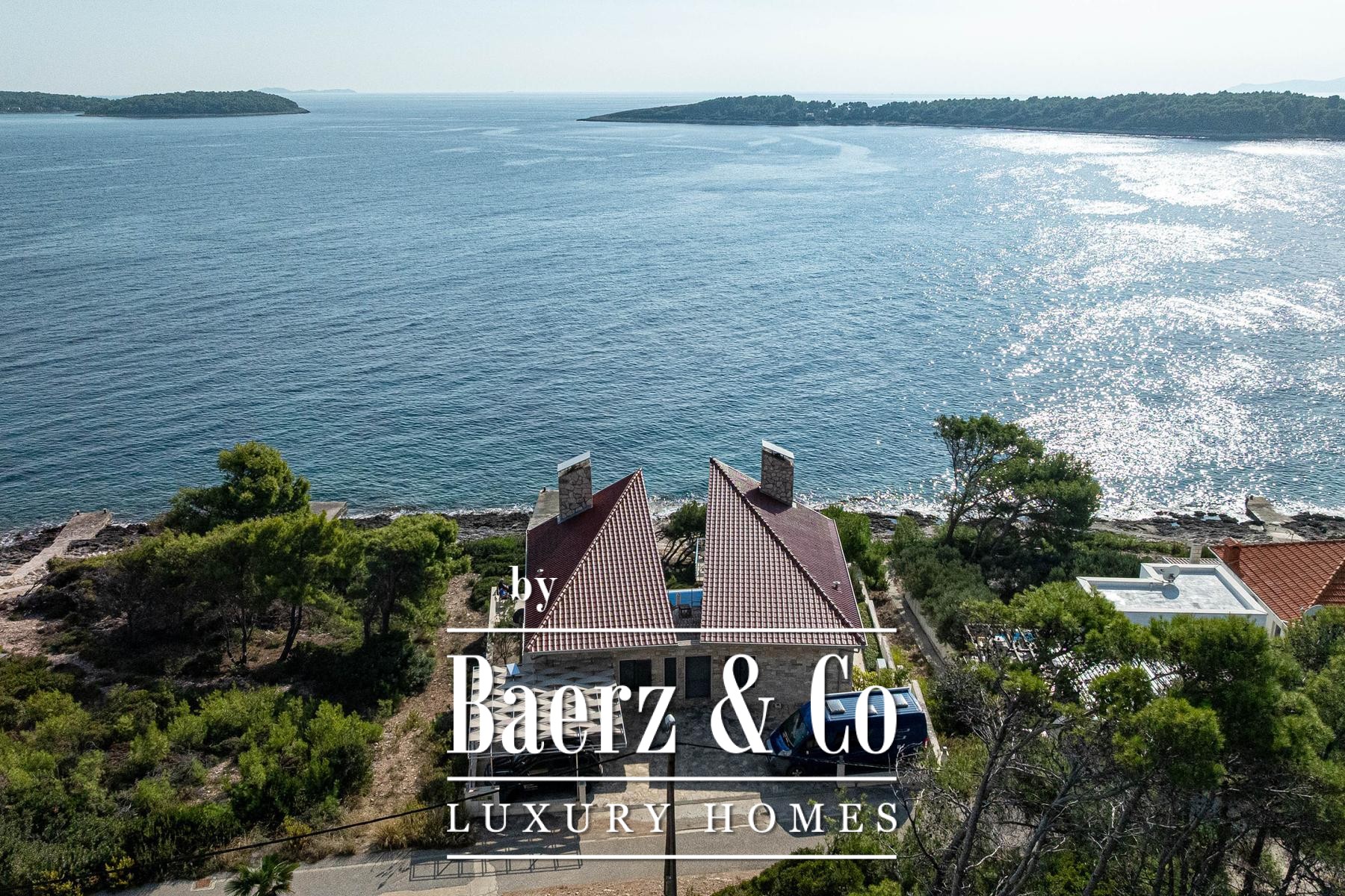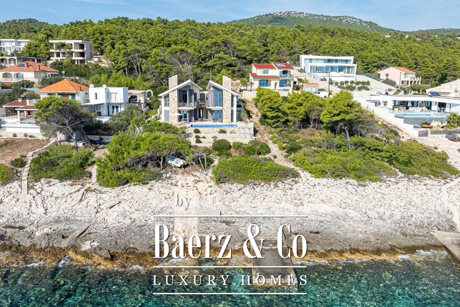 Het landschap voor de villa is vormgegeven met licht natuursteen, een zwembad en specifieke zones voor zonnebaden, alles ontworpen voor moeiteloos wonen aan zee. Via een voetpad bereikt u binnen 15 meter het water, waar een kleine aanlegsteiger ruimte biedt voor het afmeren van een boot en een eigen plek om tot rust te komen. Overal in de villa zijn hoogwaardige materialen en verfijnde afwerkingen gekozen die getuigen van een subtiele exclusiviteit.
