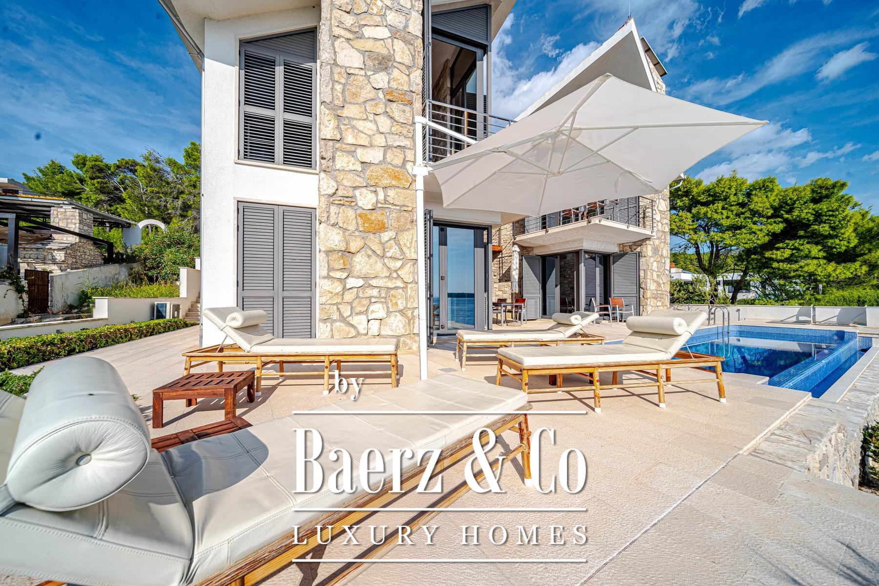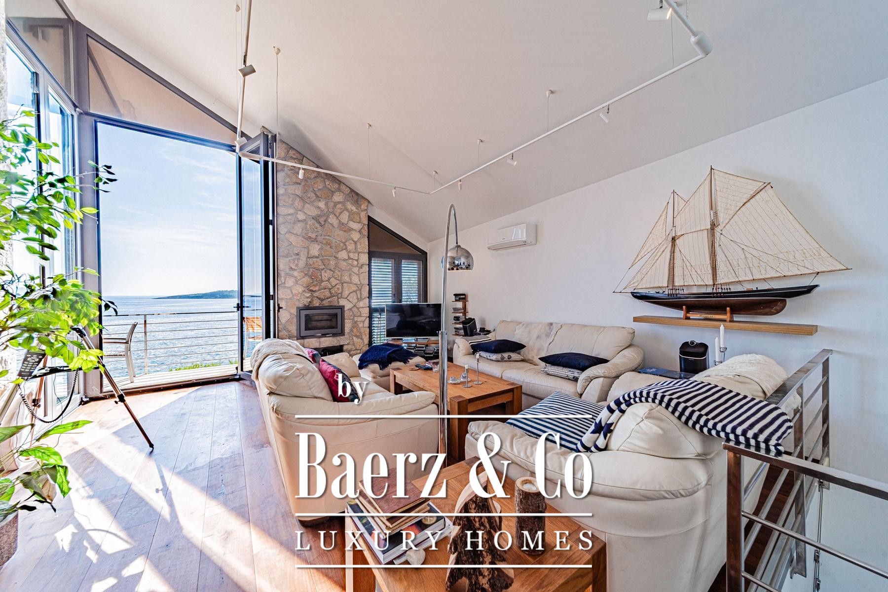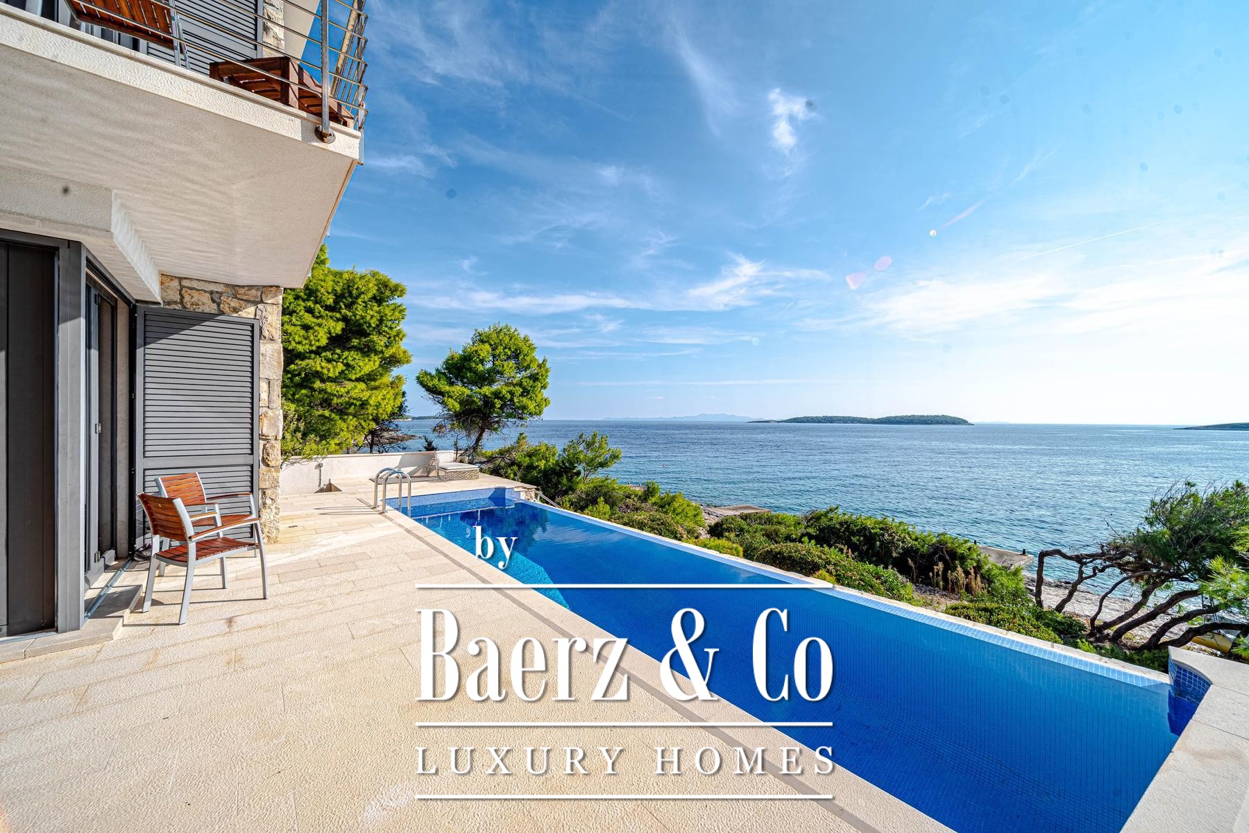 Het landschap voor de villa is vormgegeven met licht natuursteen, een zwembad en specifieke zones voor zonnebaden, alles ontworpen voor moeiteloos wonen aan zee. Via een voetpad bereikt u binnen 15 meter het water, waar een kleine aanlegsteiger ruimte biedt voor het afmeren van een boot en een eigen plek om tot rust te komen. Overal in de villa zijn hoogwaardige materialen en verfijnde afwerkingen gekozen die getuigen van een subtiele exclusiviteit.