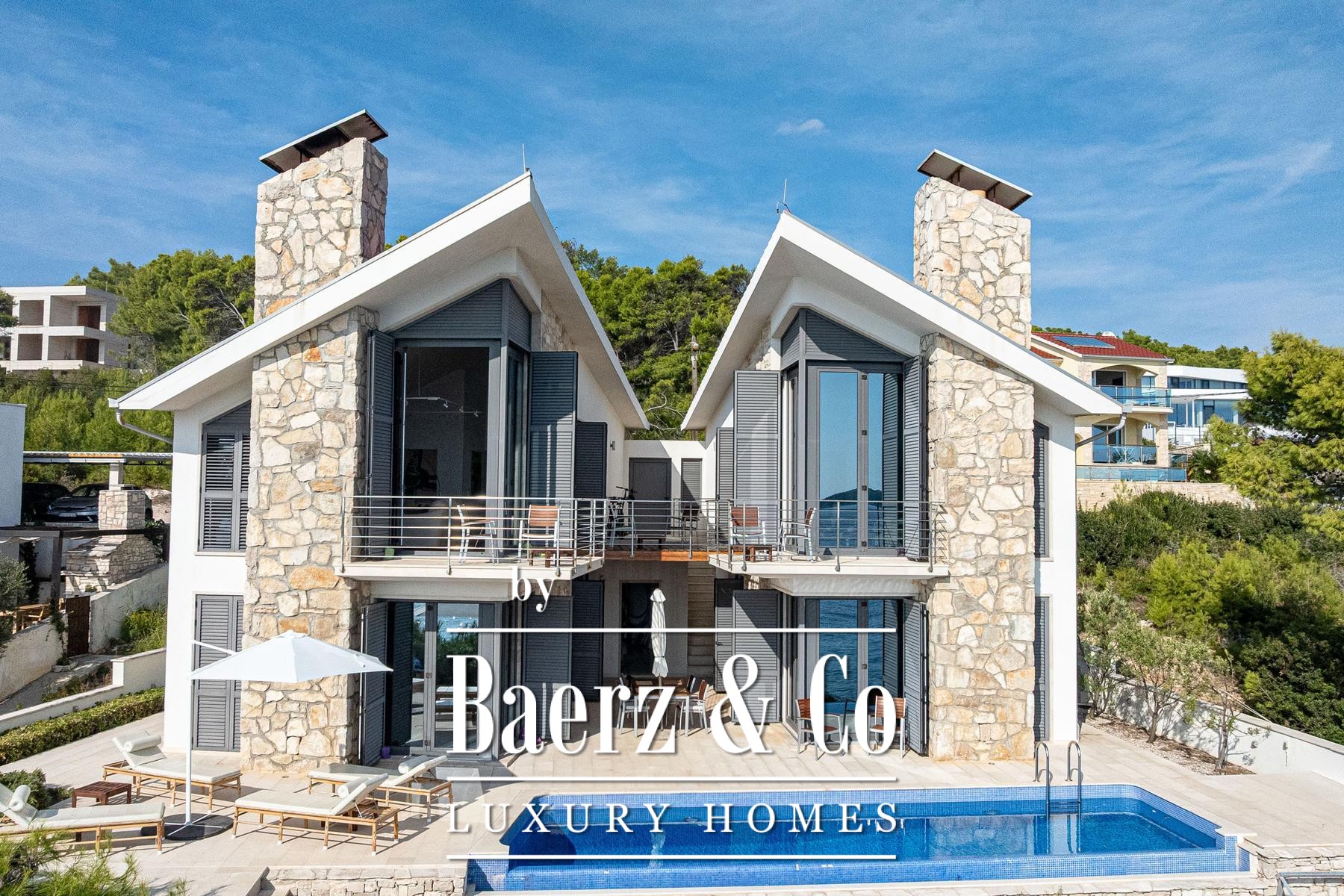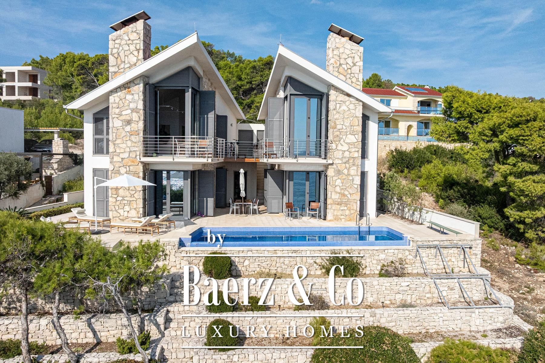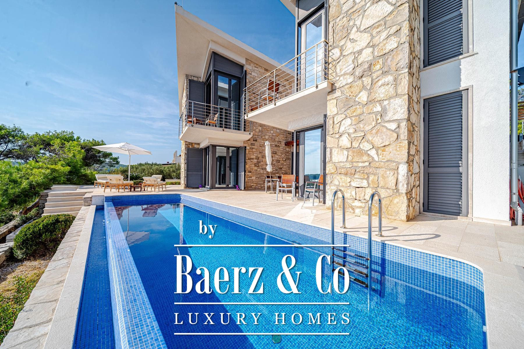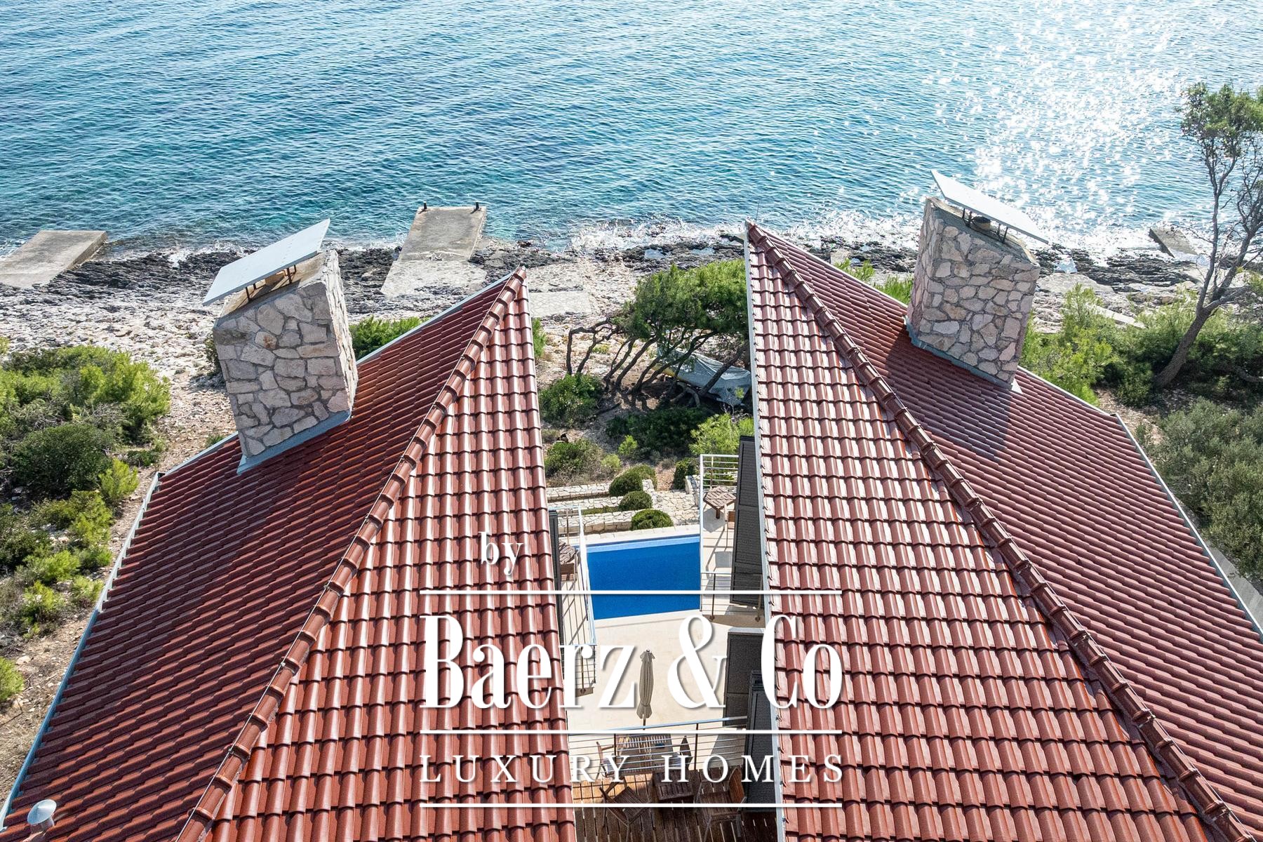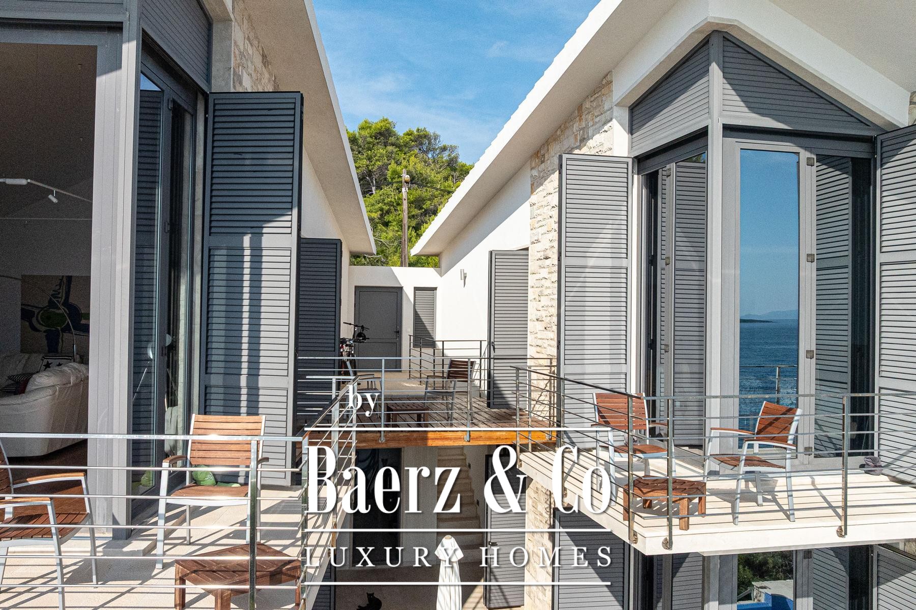 Deze villa Blato ligt direct aan de kust van Kroatië en biedt 260 m² aan binnenruimte op een perceel van 500 m². Architectonische helderheid kenmerkt de residentie, die bestaat uit twee zelfstandige units verbonden door ruime terrassen, waarbij elke unit functioneert als een volwaardig huis. Op de begane grond bevinden zich in beide units gecombineerde leef-, eet- en keukenzones; op de verdieping beschikt elke unit over twee slaapkamers, allen met en suite badkamers en een privéterras.