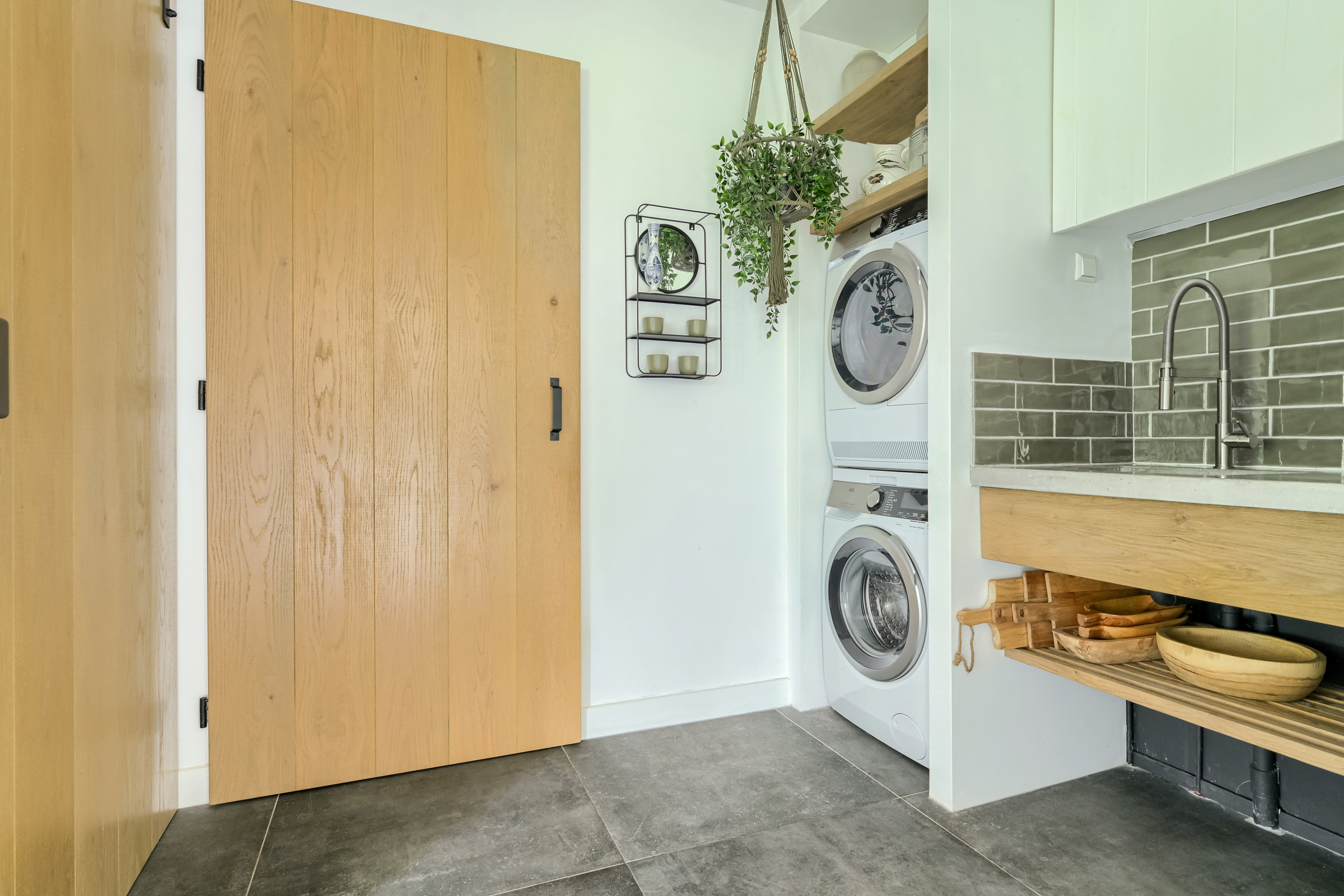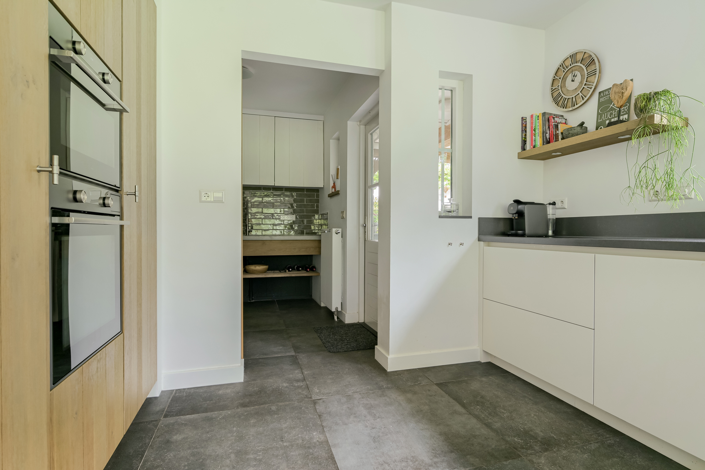 Bijkeuken met modern keukenblokje met spoelbak. In deze ruimte zijn ook de aansluitpunten t.b.v. de wasapparatuur gesitueerd. Daarnaast tref je hier een aparte trapkast.