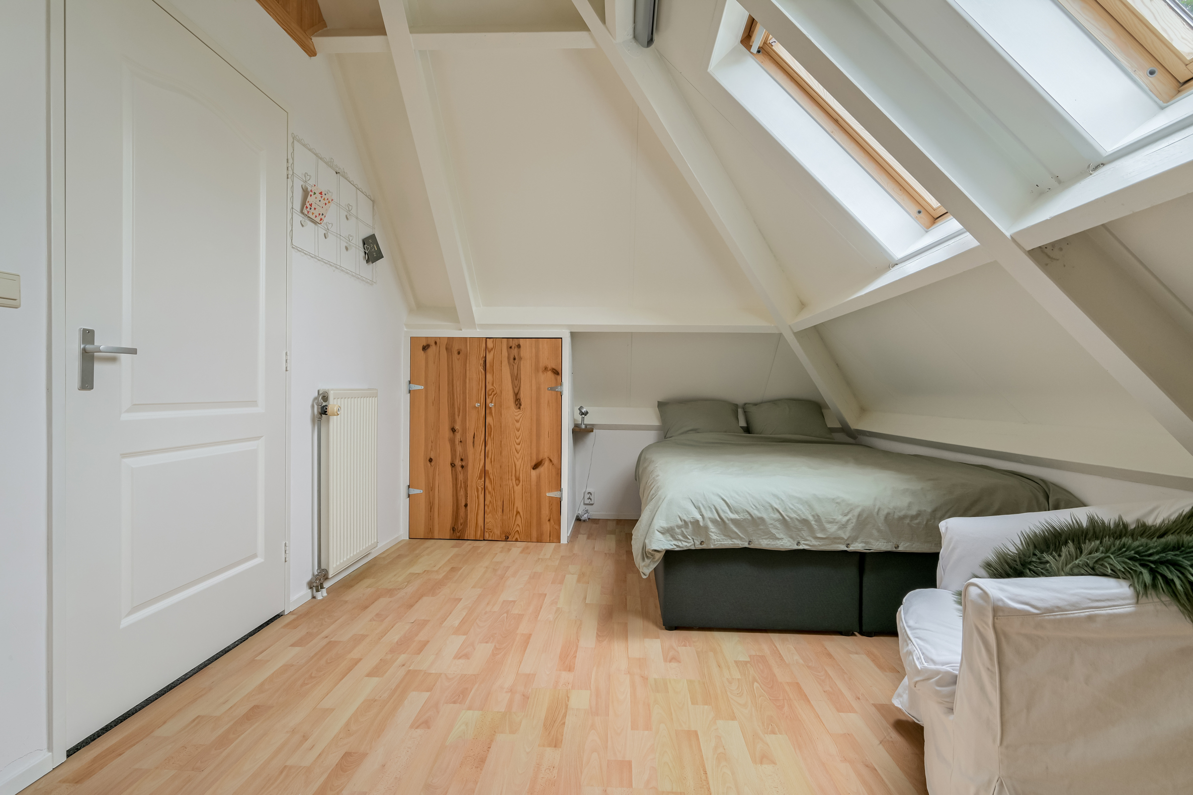 Zijslaapkamer met 2 Velux dakvensters en 2 vaste kasten. Vanuit deze kamer toegang tot een berging waarin de HR cv-combiketel (ca. 2018) en mechanisch ventilatiesysteem-unit geplaatst zijn.