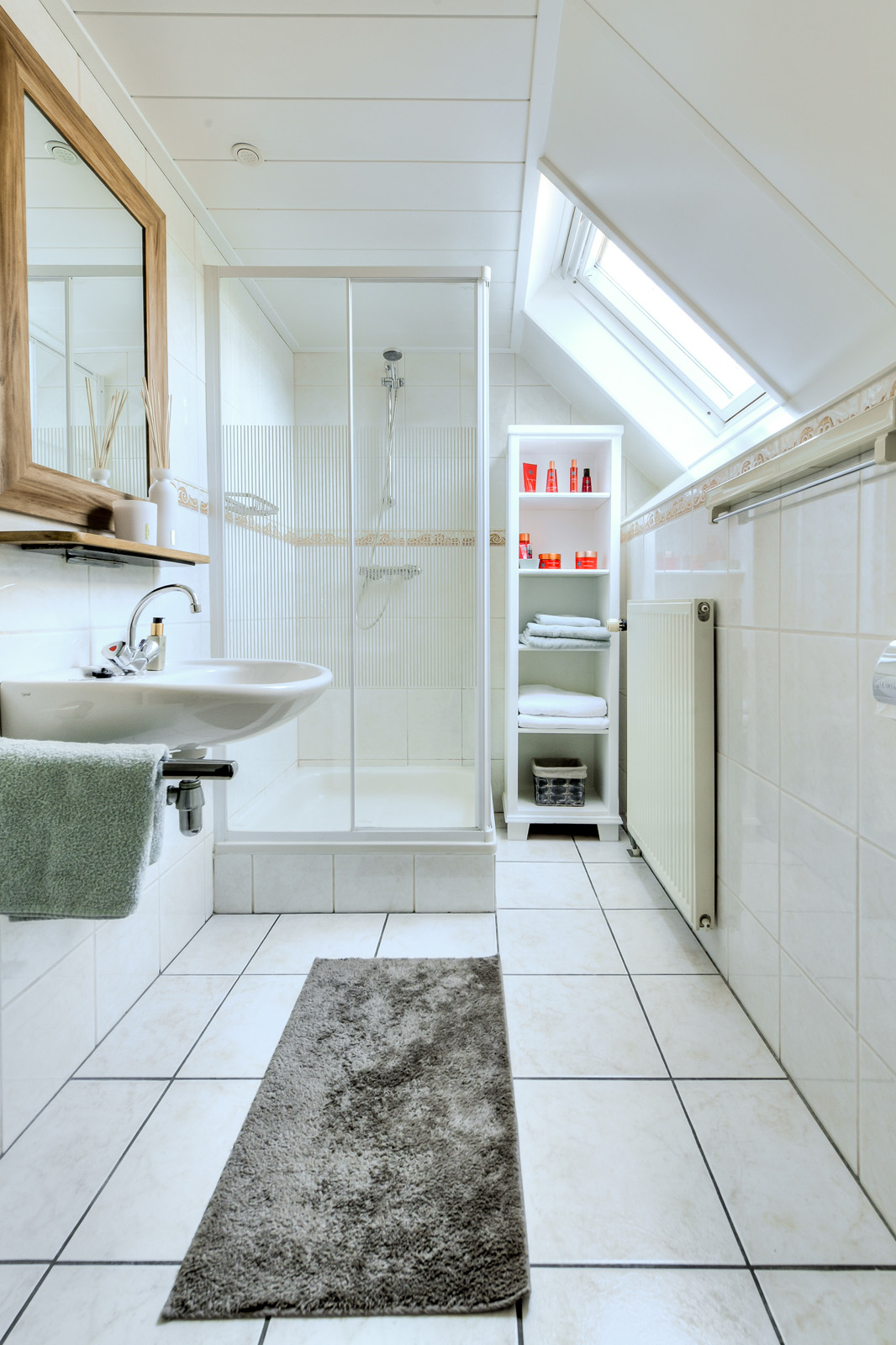 Badkamer met inrichting, bestaand uit een douchecabine met thermostaatkraan, een wastafel en een wandcloset met inbouwreservoir. Daglichttoetreding middels een Velux dakvenster.