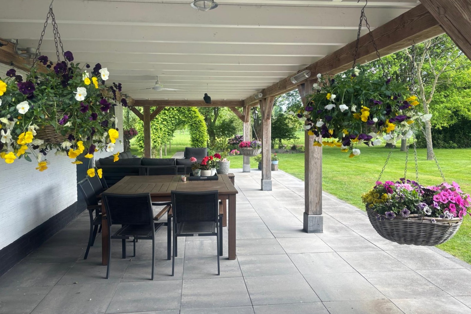 De riante tuin met achtergelegen grasland biedt optimale privacy. Achter de woning én naast het bijgebouw is een prachtige veranda gerealiseerd, waaronder het heerlijk genieten is van de prachtige tuin.