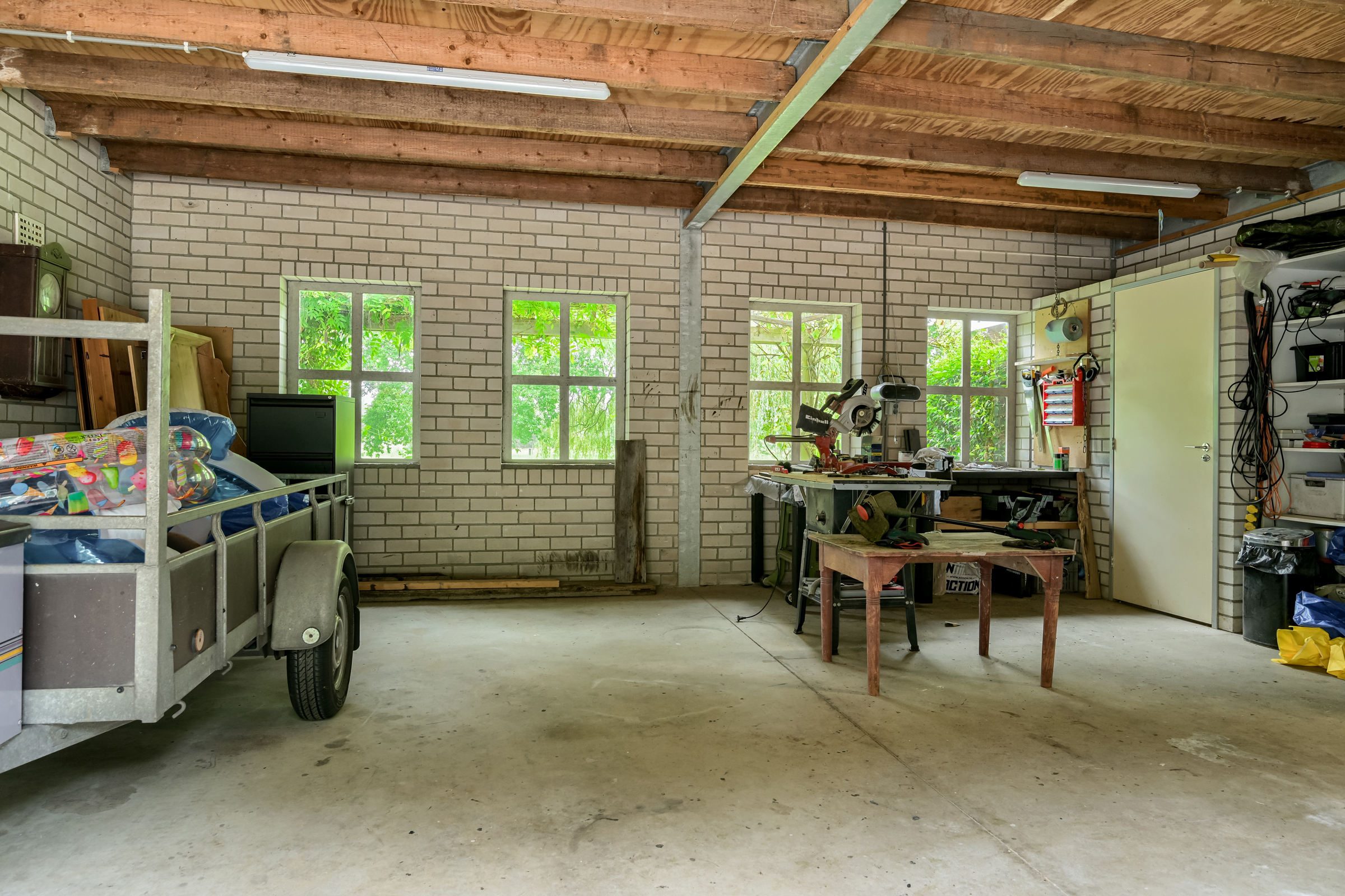 Het bijgebouw bestaat uit 2 delen. De rechterzijde is een multifunctionele berging/hobbyruimte waarboven een volwaardige zolderetage. De linkerzijde, nu in gebruik als hobbyruimte, biedt ruim plaats aan 2 auto’s.