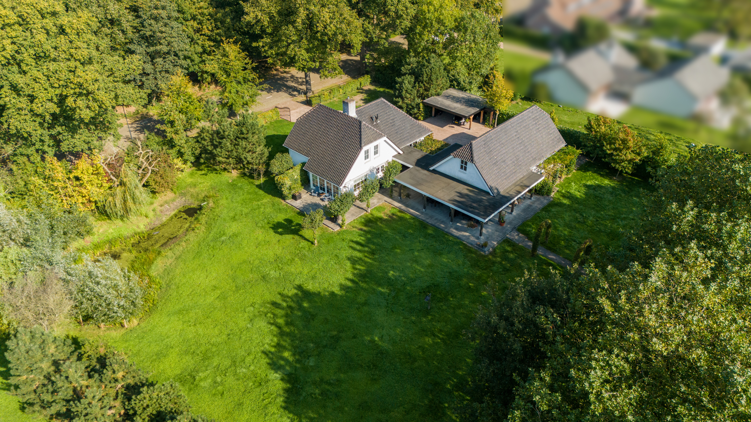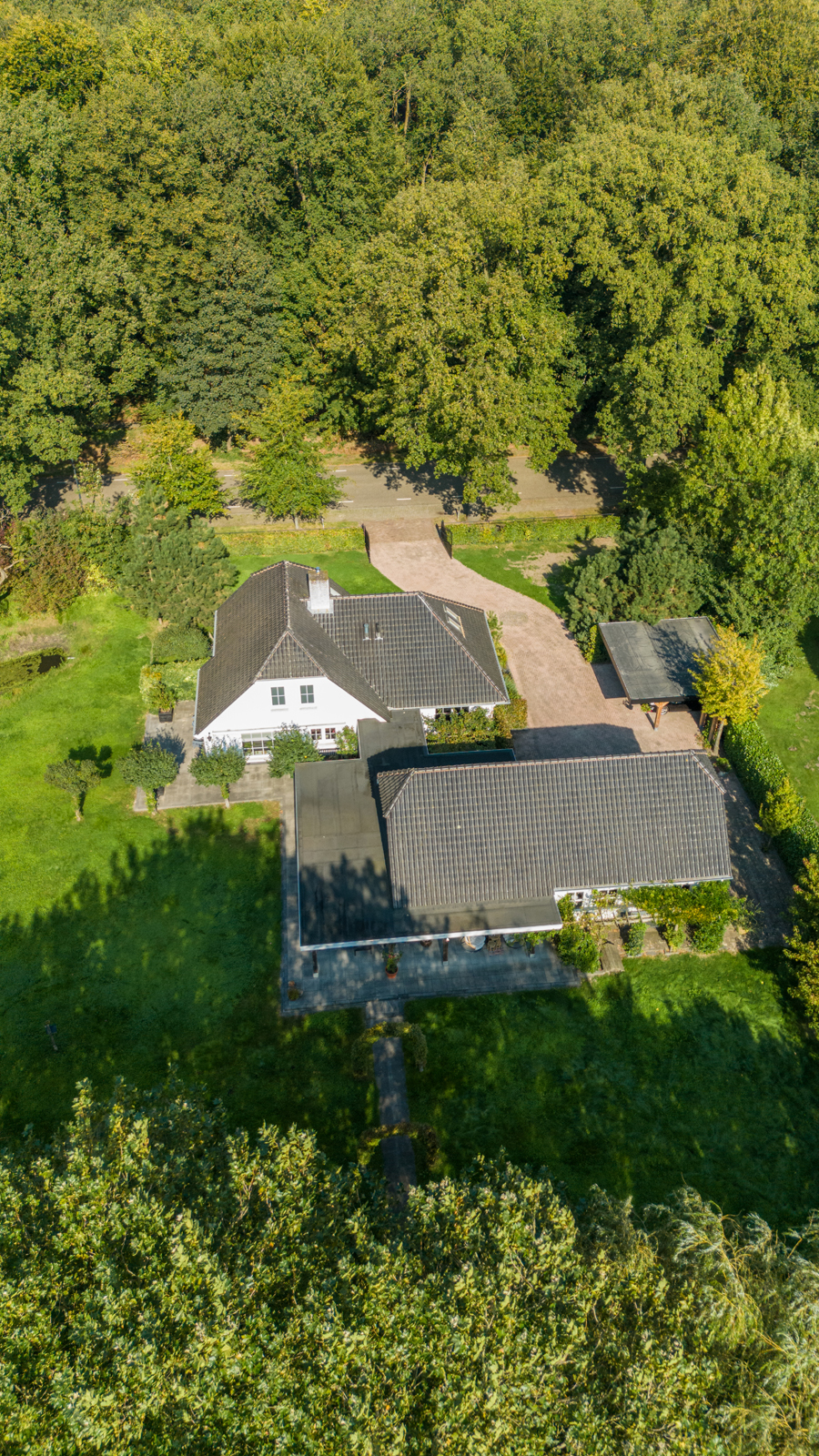 De prachtige, volledig omheinde tuin omringt de woning, biedt optimale privacy en gaat als het ware op in de omgeving. Rondom de woning zijn diverse terrassen aangelegd in strakke betontegels. Er is een veranda gesitueerd tussen de woning en het bijgebouw, deze is ook naast het bijgebouw doorgetrokken en biedt prachtig zicht op de tuin. Ook achter het bijgebouw is deze veranda aanwezig. De veranda is deels voorzien van terrasverwarming. In de tuin tref je o.a. een groot gazon, een fruitboomgaard en diverse bomen en hagen. Naast de woning ligt een prachtige vijver. De oprit is voorzien van sierbestrating en leidt o.a. naar de carport (plaats voor 2 auto’s) en de grote schuur.