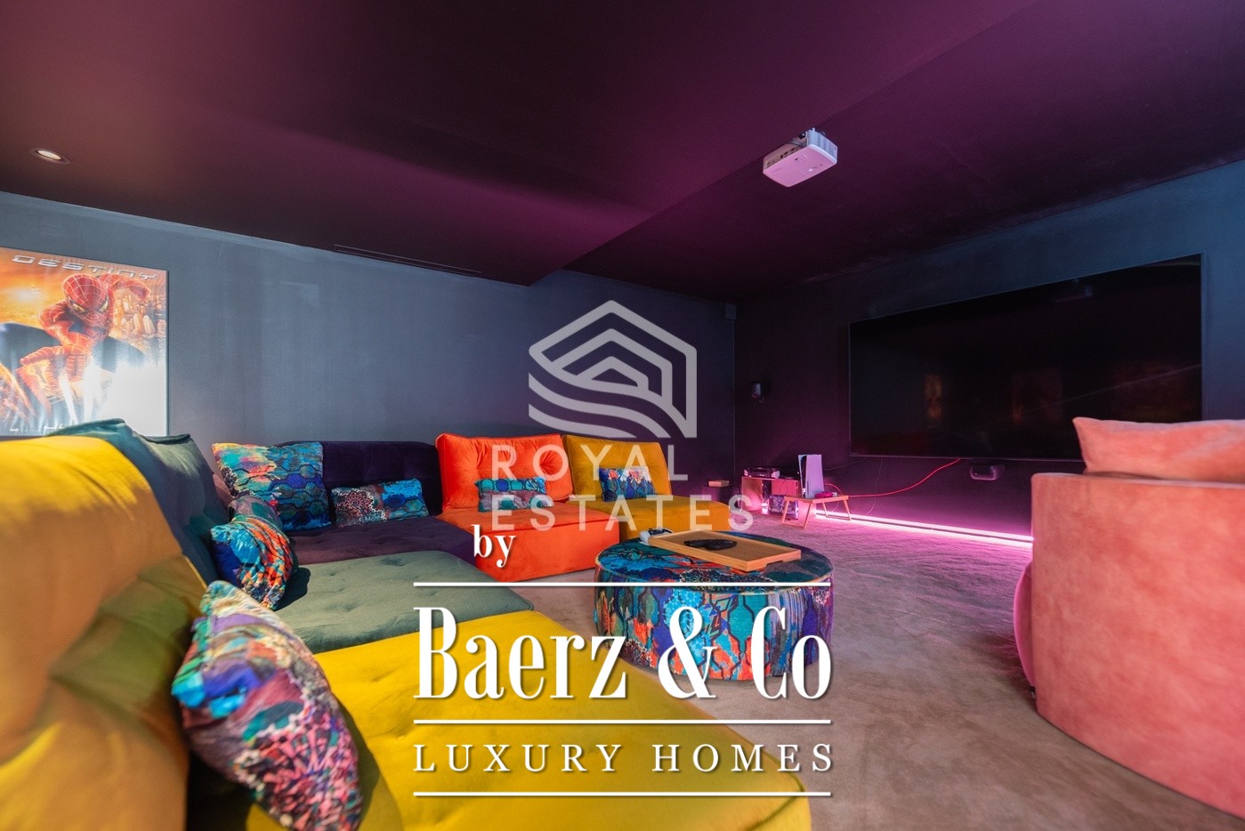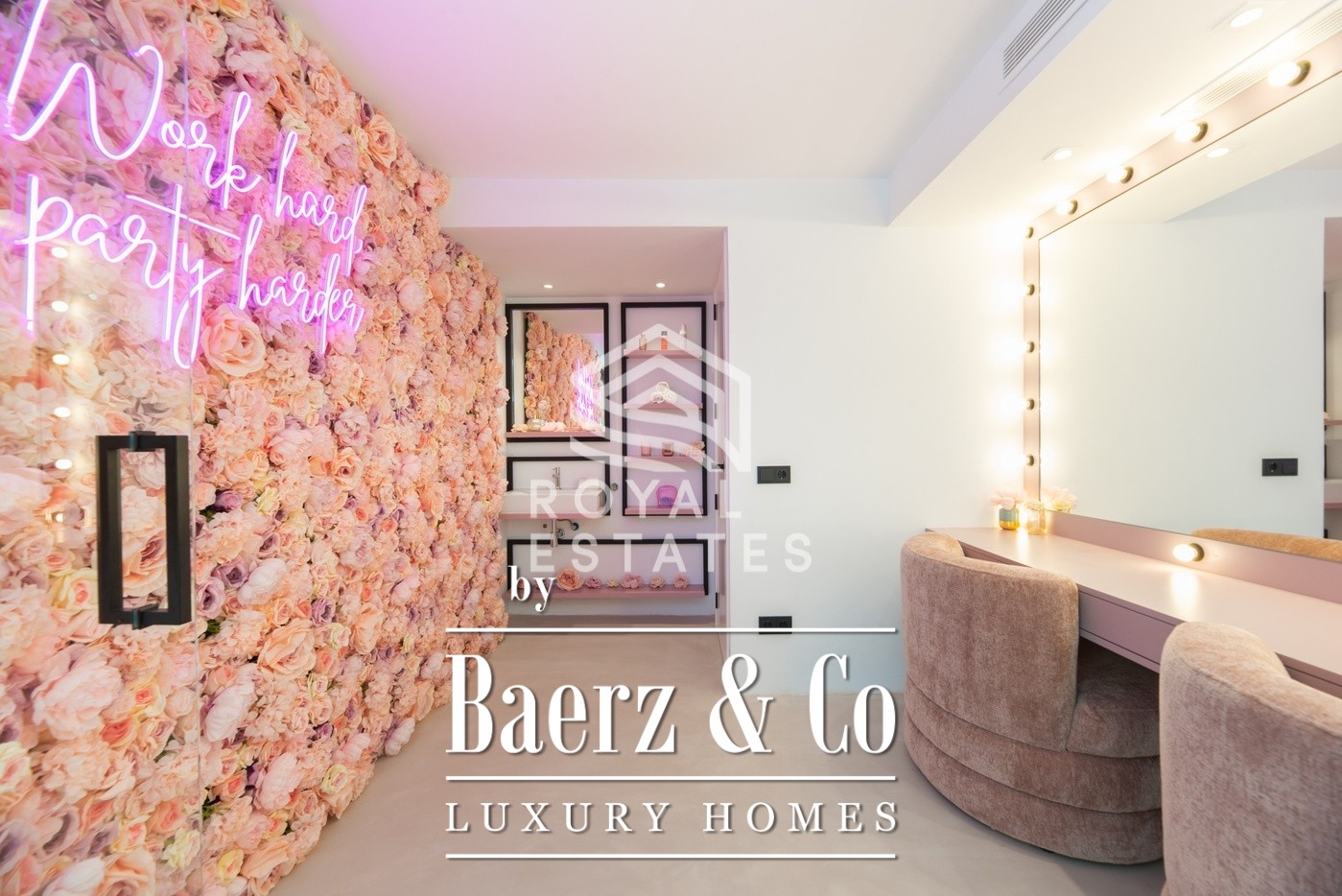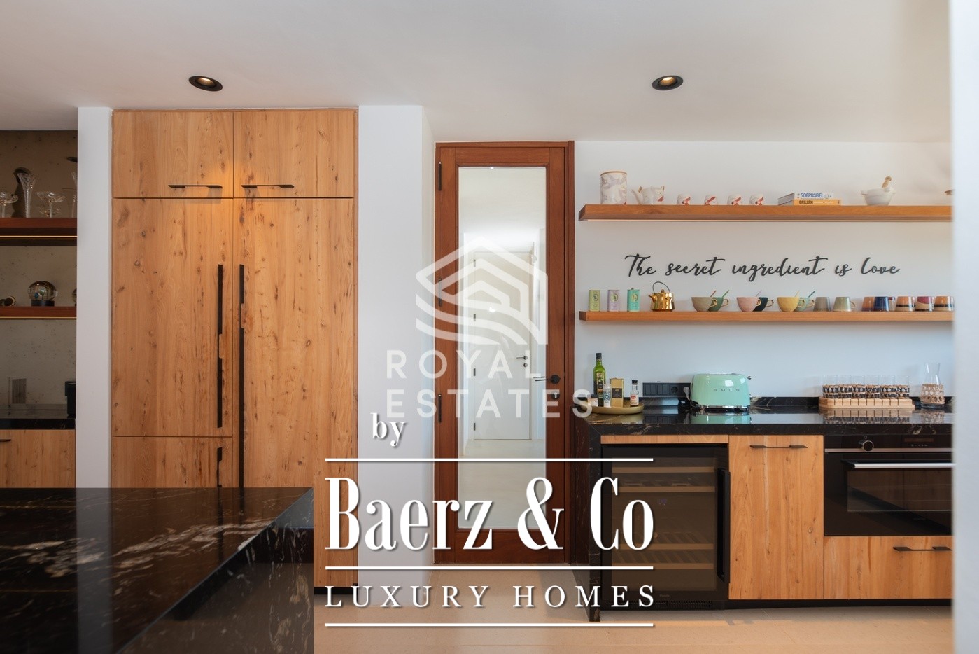 Royale terrassen grenzen aan fraai aangelegde tuinen, volgroeide palmen en een lagunezwembad, ideaal voor ontspannen thuis of sociale bijeenkomsten. Buitenspel, een vuurplaats en zonnige lounges creëren plekken voor feestelijke of juist rustige momenten. Welzijn krijgt prioriteit, met een eigen gym, thuisbioscoop en glam room op de begane grond. Natuurlijke materialen—hout, steen, luxueuze stoffen—vormen een minimalistisch, tijdloos interieur, versterkt door vloerverwarming, geïntegreerde airconditioning en dimbare verlichting.