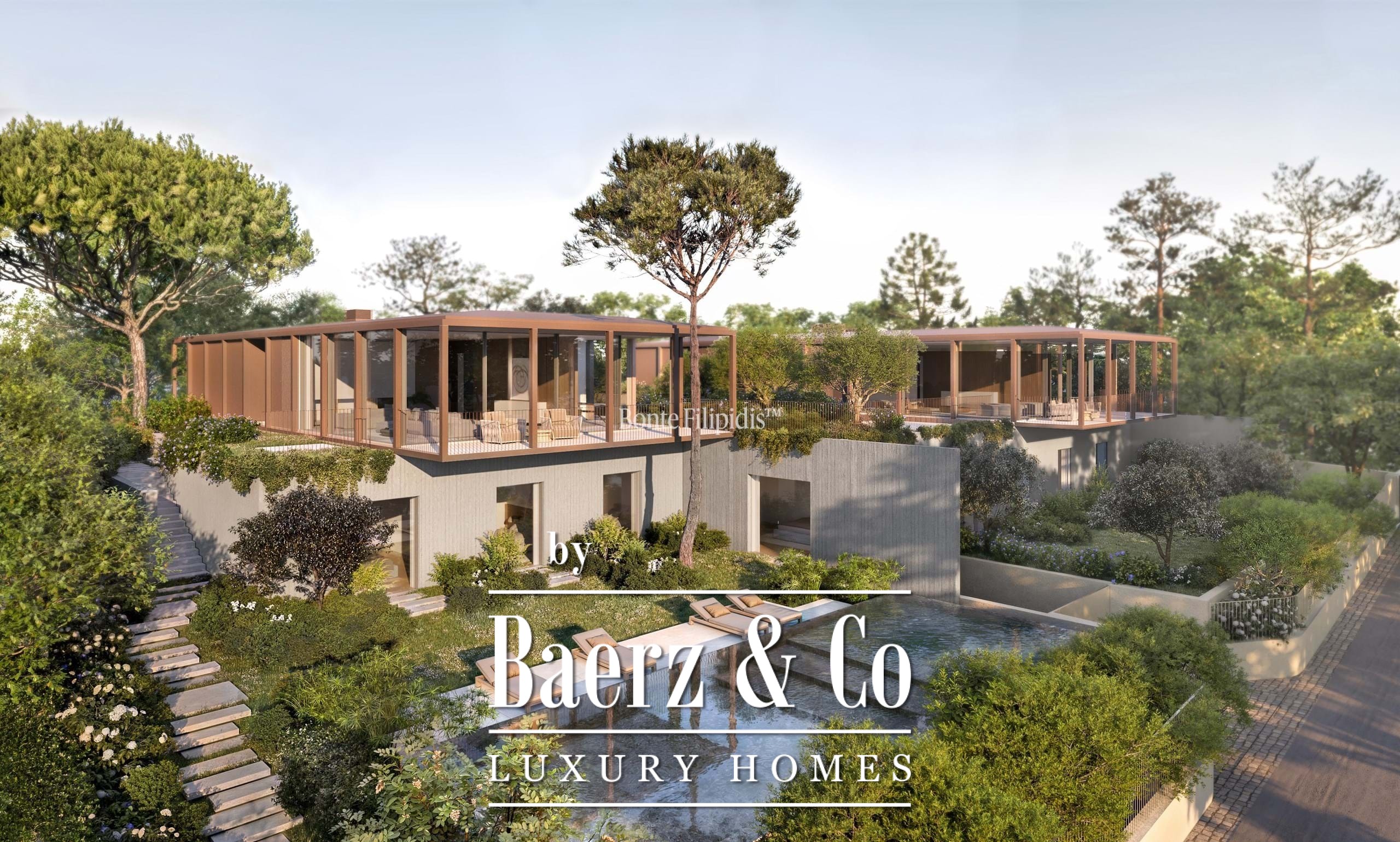 Licht stroomt op alle drie de woonlagen binnen via aluminium kozijnen van vloer tot plafond, wat zorgt voor thermisch en akoestisch comfort in combinatie met een ingetogen, serene uitstraling. Vier slaapkamers en vijf badkamers bieden privacy en ruimte, waaronder een primaire suite van 52 m² met inloopkast en directe toegang tot de tuin en het zwembad. De woon- en ontvangstruimten lopen vloeiend over in 727 m² aangelegde terrassen, schaduwrijke patio’s en een verwarmd zwembad van 63 m², wat zorgt voor een soepele overgang tussen binnen en buiten.