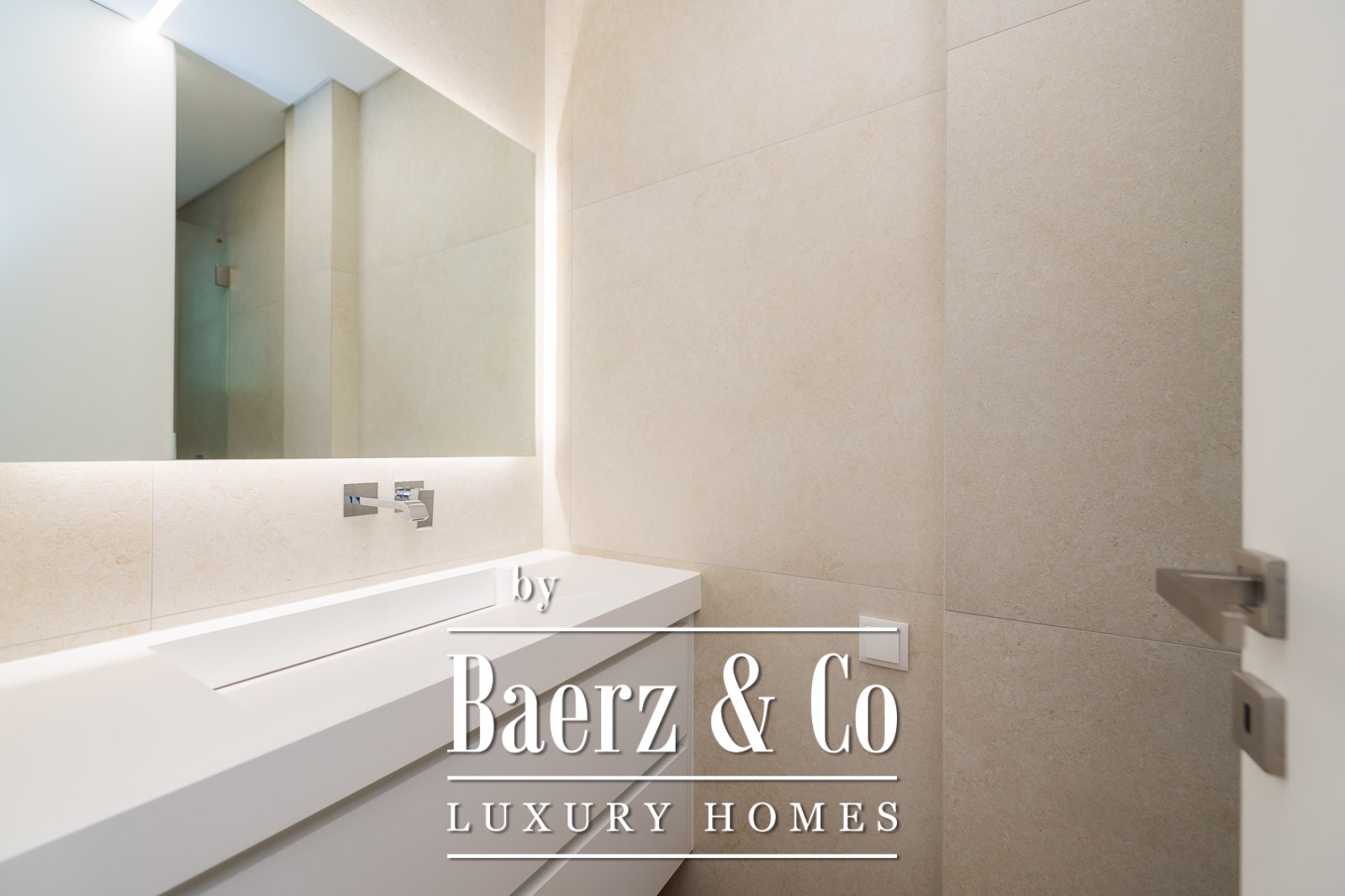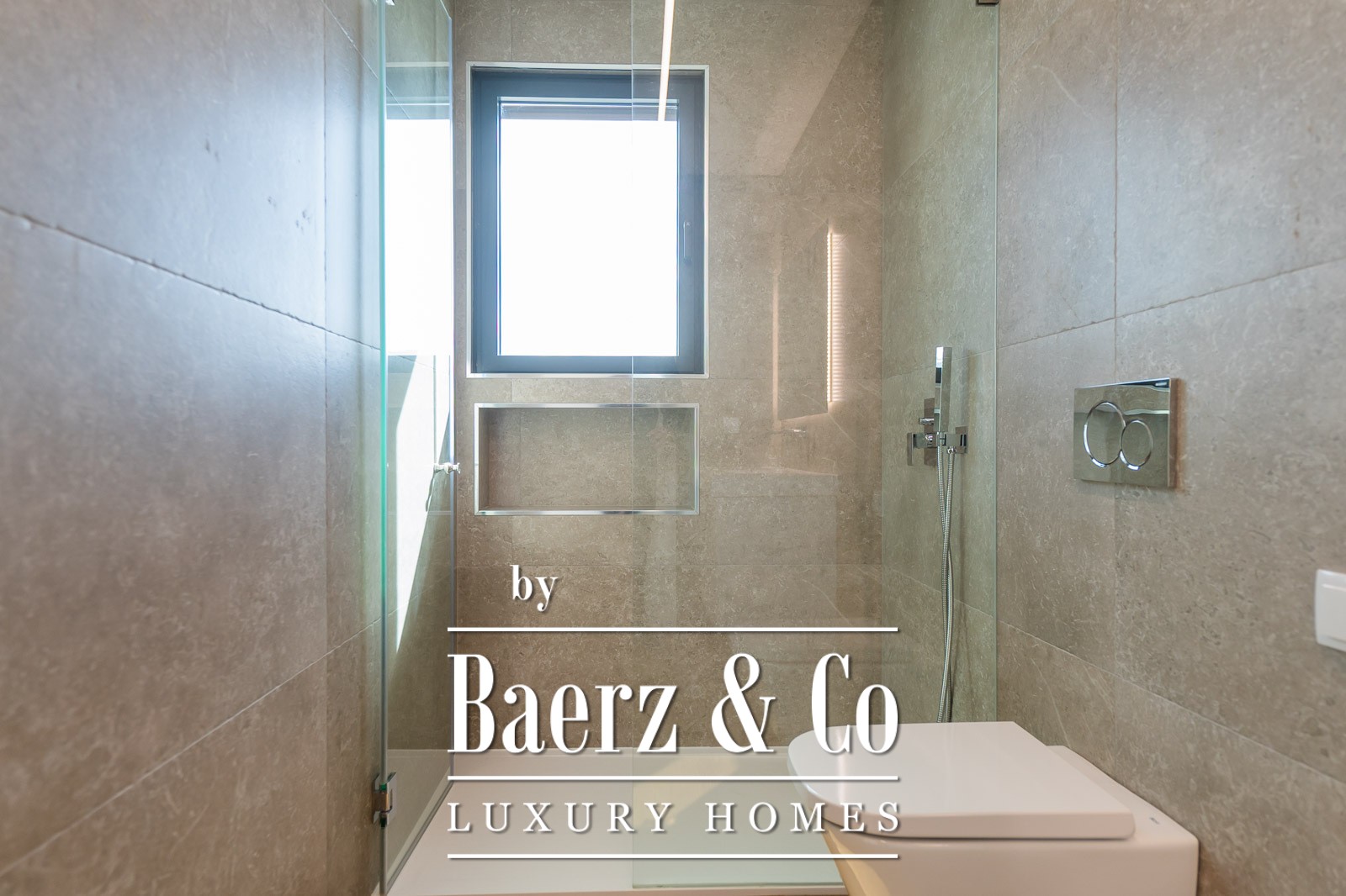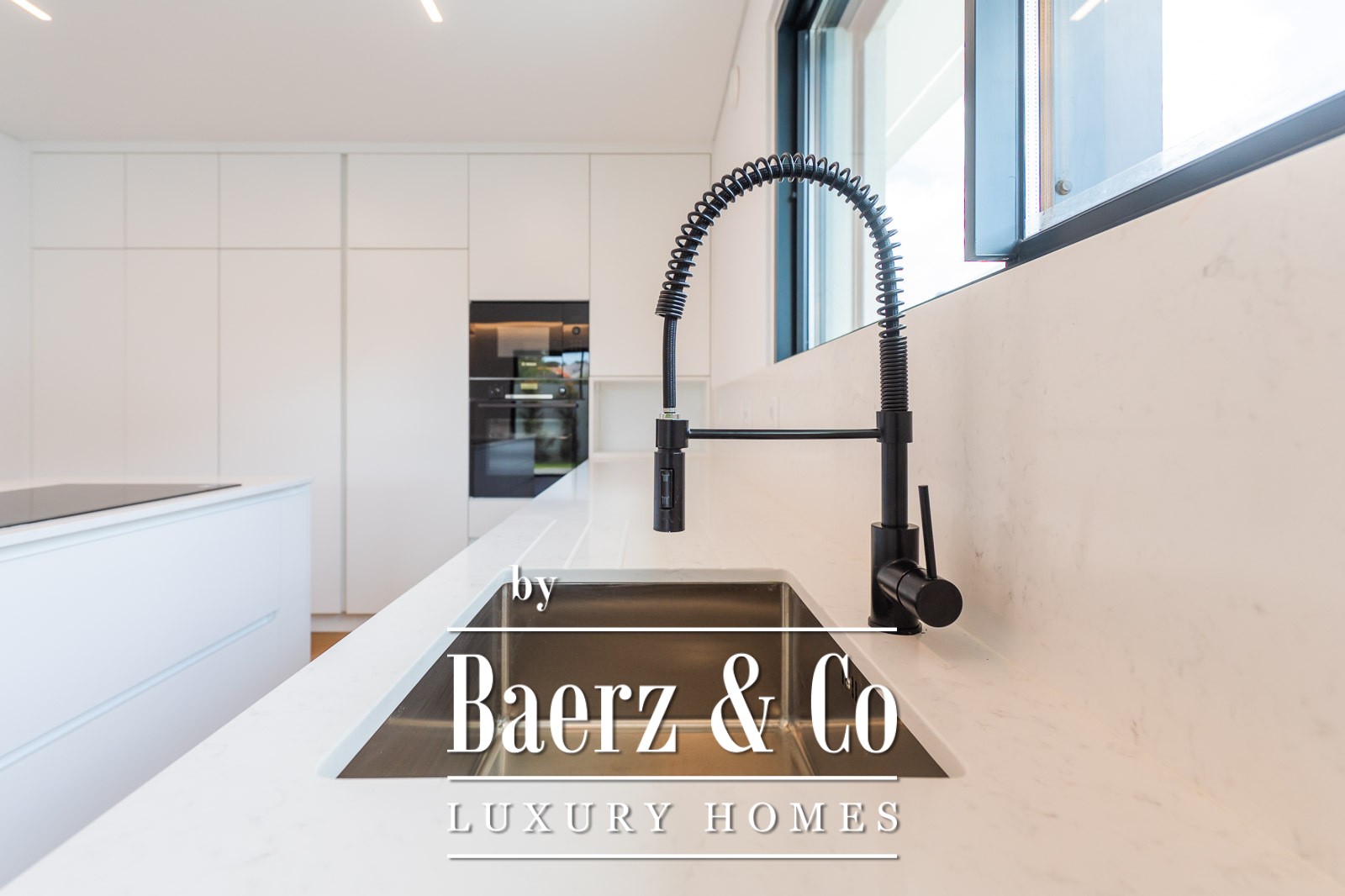 Centraal in de villa ligt de open woon- en keukenruimte van 51 m², royaal voorzien van licht en met directe toegang tot de aangelegde tuin en het verwarmde zwembad. De keuken is volledig uitgerust met Bosch-apparatuur en staat voor discrete prestaties. Vloerverwarming op de eerste en tweede verdieping, elektrische rolluiken, een centraal stofzuigsysteem en een geavanceerde beveiligingsinstallatie zorgen voor een moeiteloze woonbeleving.