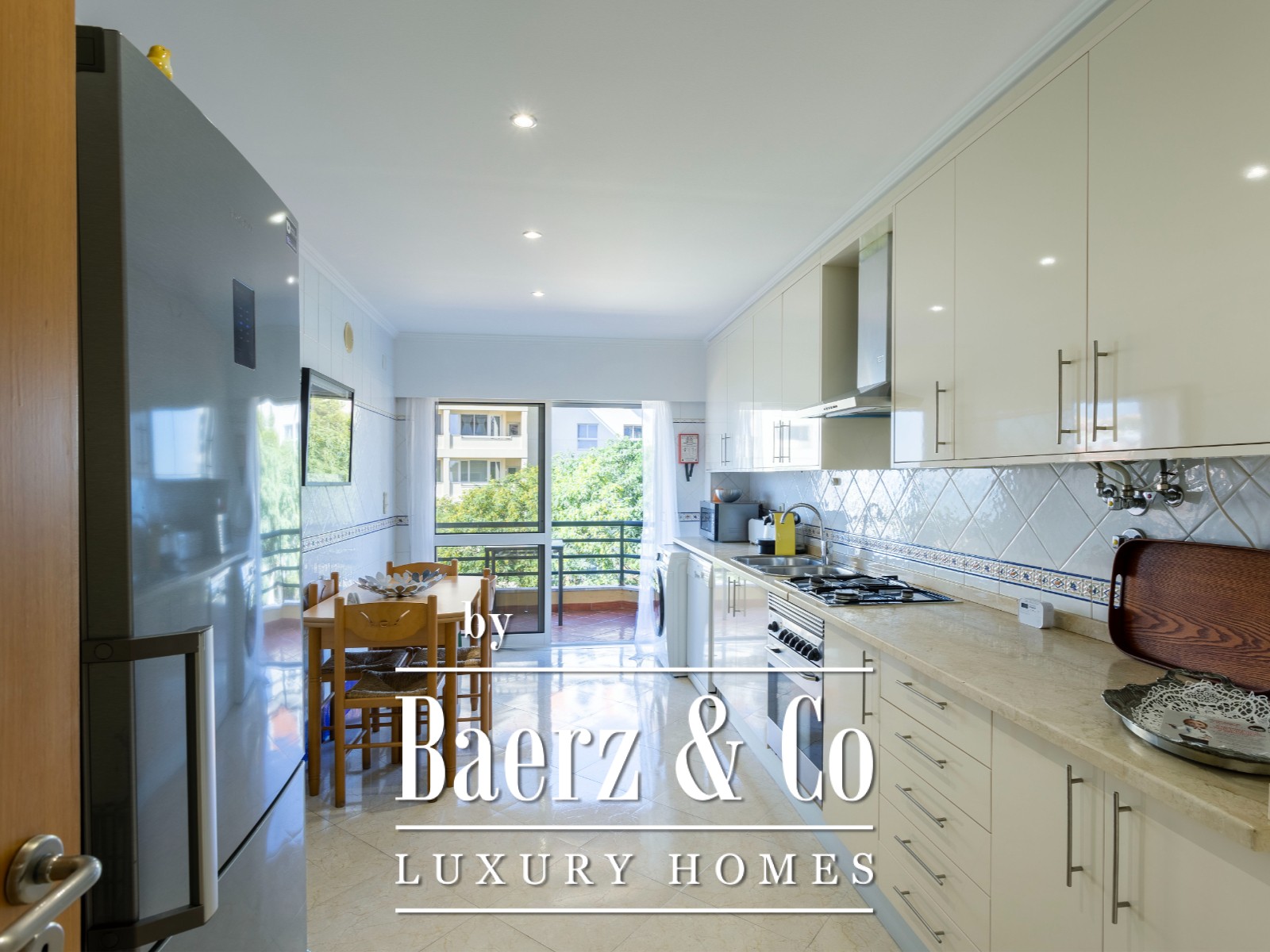 De moderne, volledig uitgeruste keuken grenst aan een balkon. De woning is voorzien van airconditioning, dubbele beglazing en elektrische rolluiken en wordt volledig gemeubileerd en uitgerust aangeboden. Tot de voorzieningen behoren een privézwembad, volwassen tuin, buitenparkeerplaats, 24-uurs beveiliging, lift, garage en een privébergruimte. De ligging biedt direct toegang tot Casa da Guia, de jachthaven van Cascais, belangrijke fietsroutes en gerenommeerde scholen zoals Salesianos do Estoril en Saint Julian's.