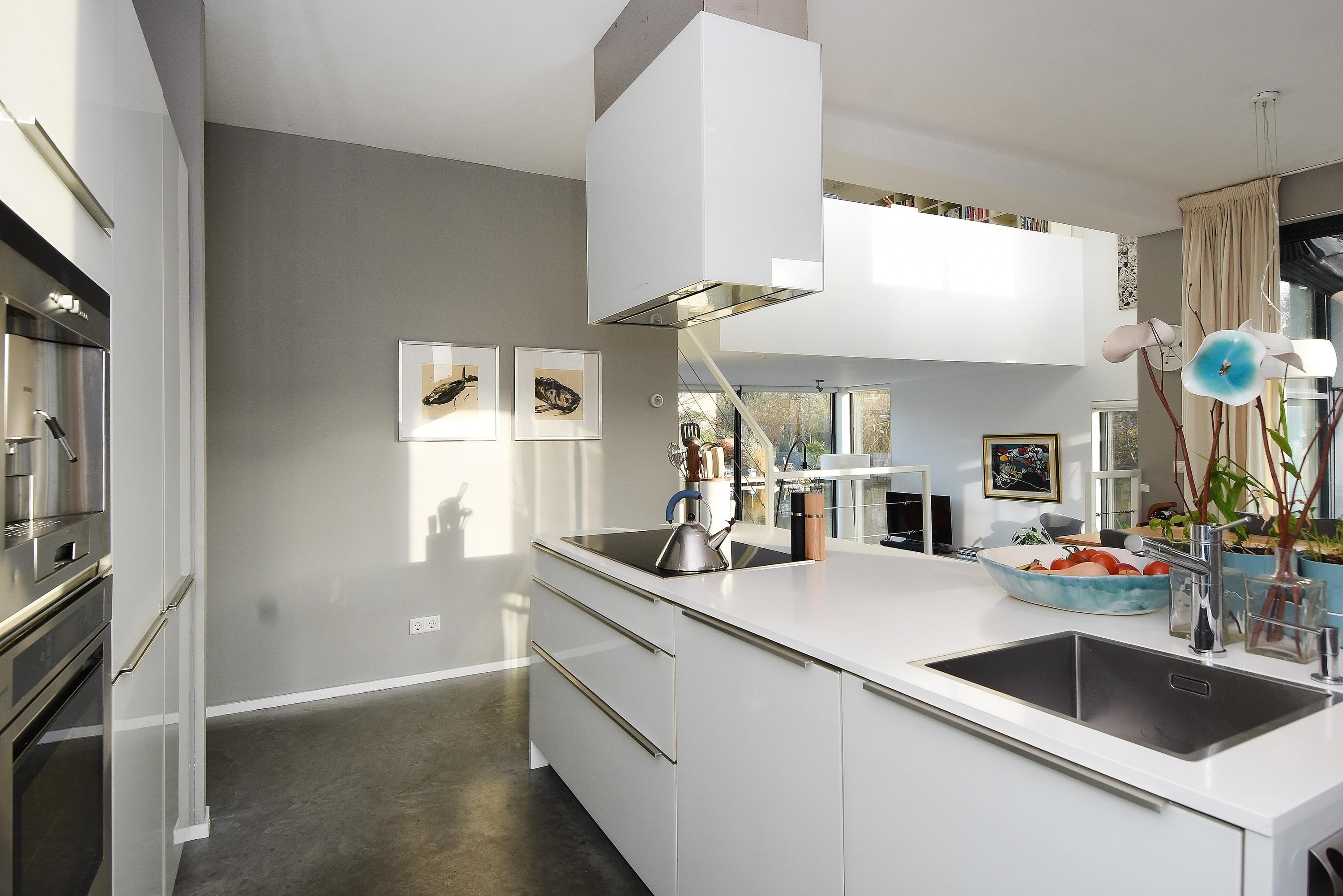 Bij binnenkomst in deze splitlevelwoning word je compleet verrast door de speelse indeling, de ruimte en het vele licht dat binnenvalt door de grote en hoge raampartijen. De comfortabele en fraaie woonkeuken is van alle luxe en gemakken voorzien met een kookeiland, allerlei inbouwapparatuur en een ideale plek voor een ruime eethoek. Vanuit hier bereik je via een trapje naar beneden een lichte, gezellige en royale living met een uniek en vrij uitzicht op het water. Aangrenzend loop je zo door naar een heerlijk zonnig drijvend terras met (buiten) regendouche en zwemtrap, waar je lang kan genieten van alle rust, vrijheid en de zon.