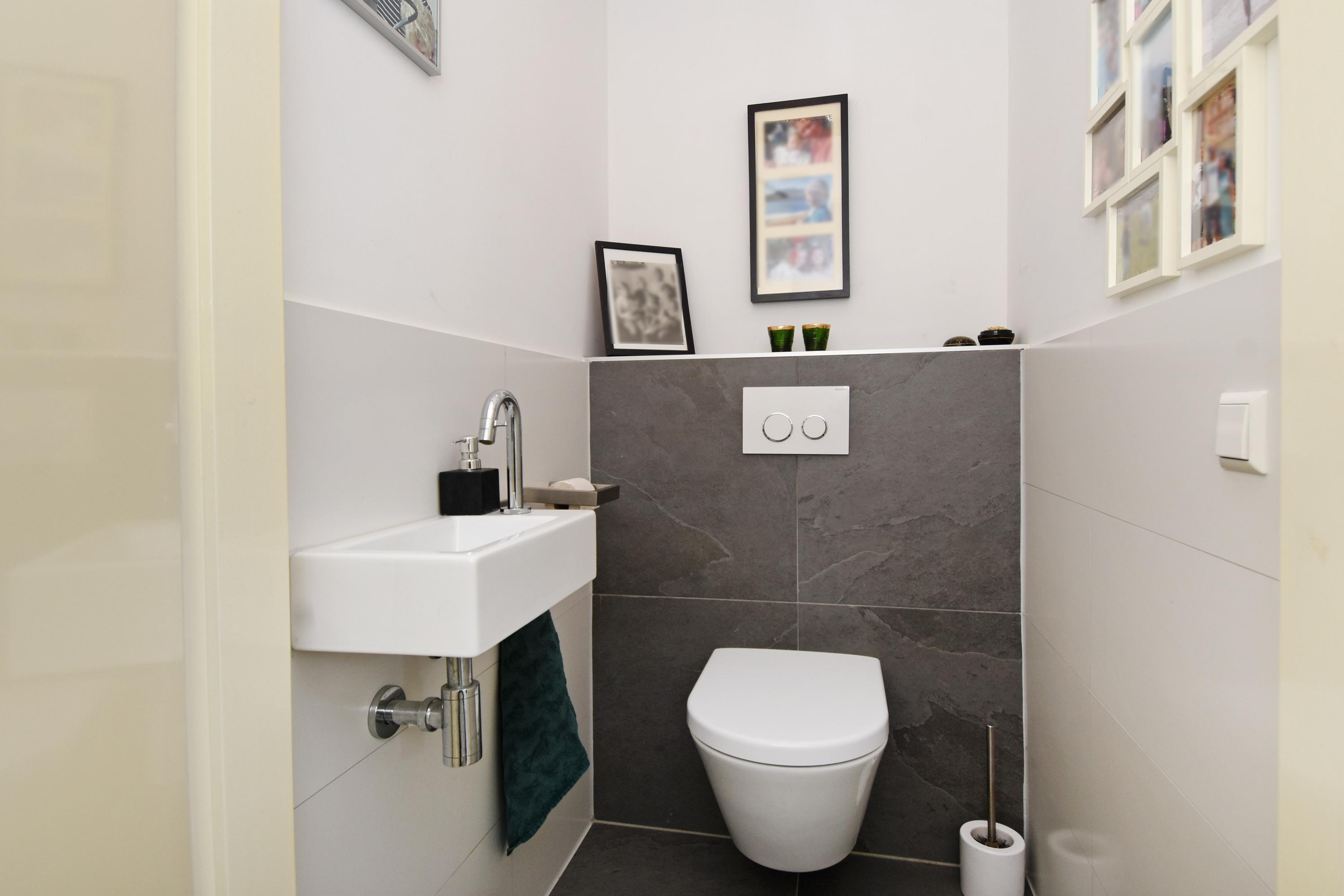 De hal, bij de entree van de woning, biedt toegang tot een bijkeuken met opstelplaats voor een wasmachine/droger/vriezer e.d. en tot een luxe toilet (hangend closet) met fontein. Vanuit hier bereik je ook de master bedroom met een badkamer ensuite, voorzien van een fraaie inloopdouche, ligbad en dubbele vaste wastafel + meubel.