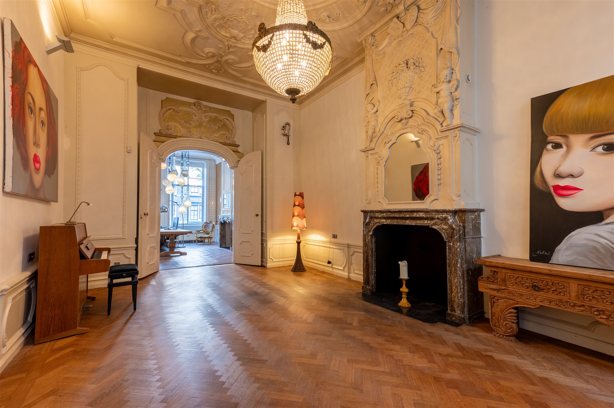 In de woonkamer komt alles samen: hoge plafonds, unieke objecten en een marmeren open haard met Portugese tegels.