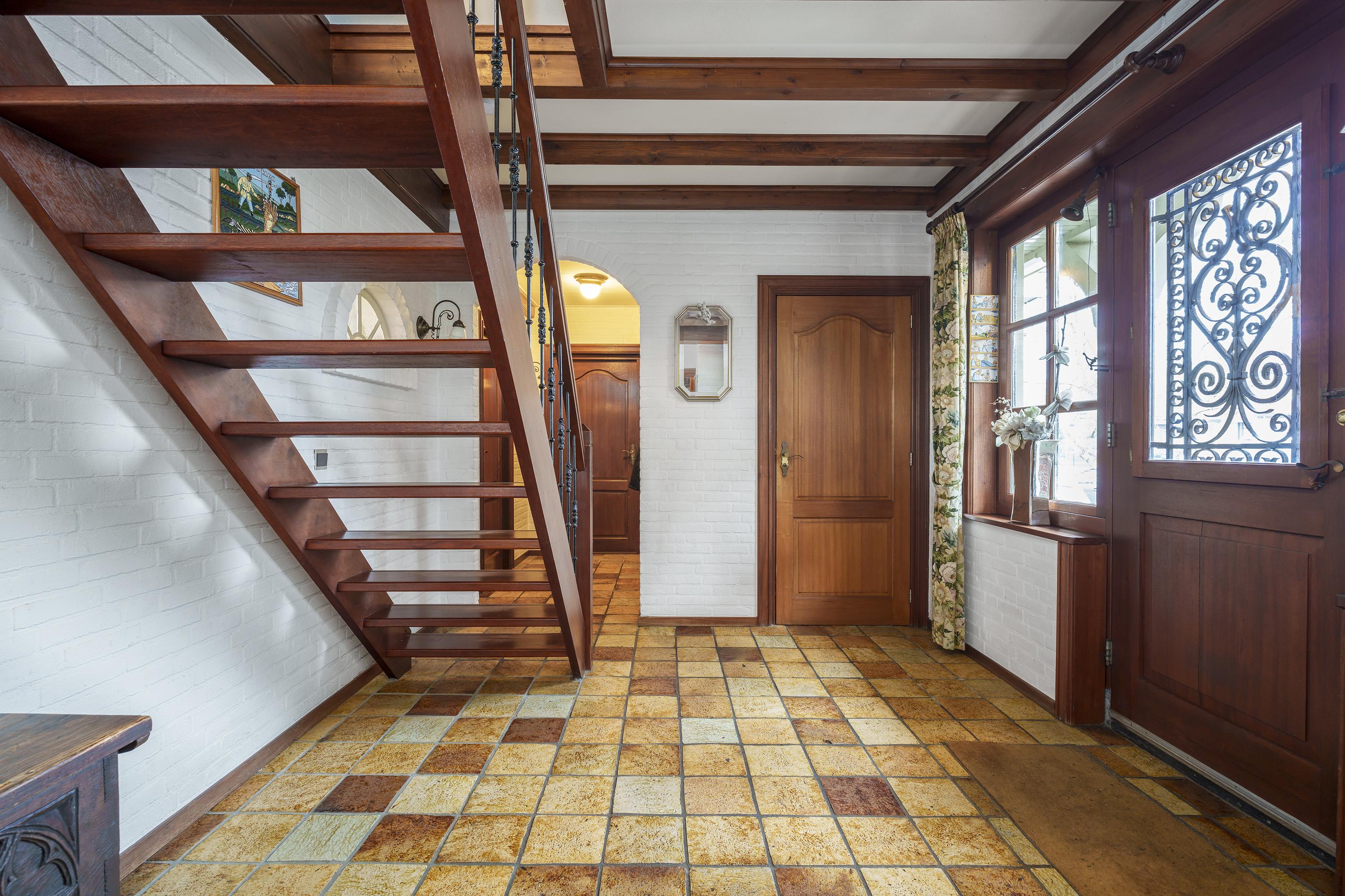 Overkapte entree (porch), royale inkomhal met trapopgang, tussenhal met toilet, garage, keuken, bijkeuken, royale living met gezellige centrale haardpartij, die de living opdeelt in een woongedeelte en eetgedeelte. Toegang vanuit de living naar het terras aan de achterzijde. Vanuit de garage 2e trap naar de etage boven de garage. Ideaal voor het creëren van een extra slaapkamers, een appartement of werkruimte.