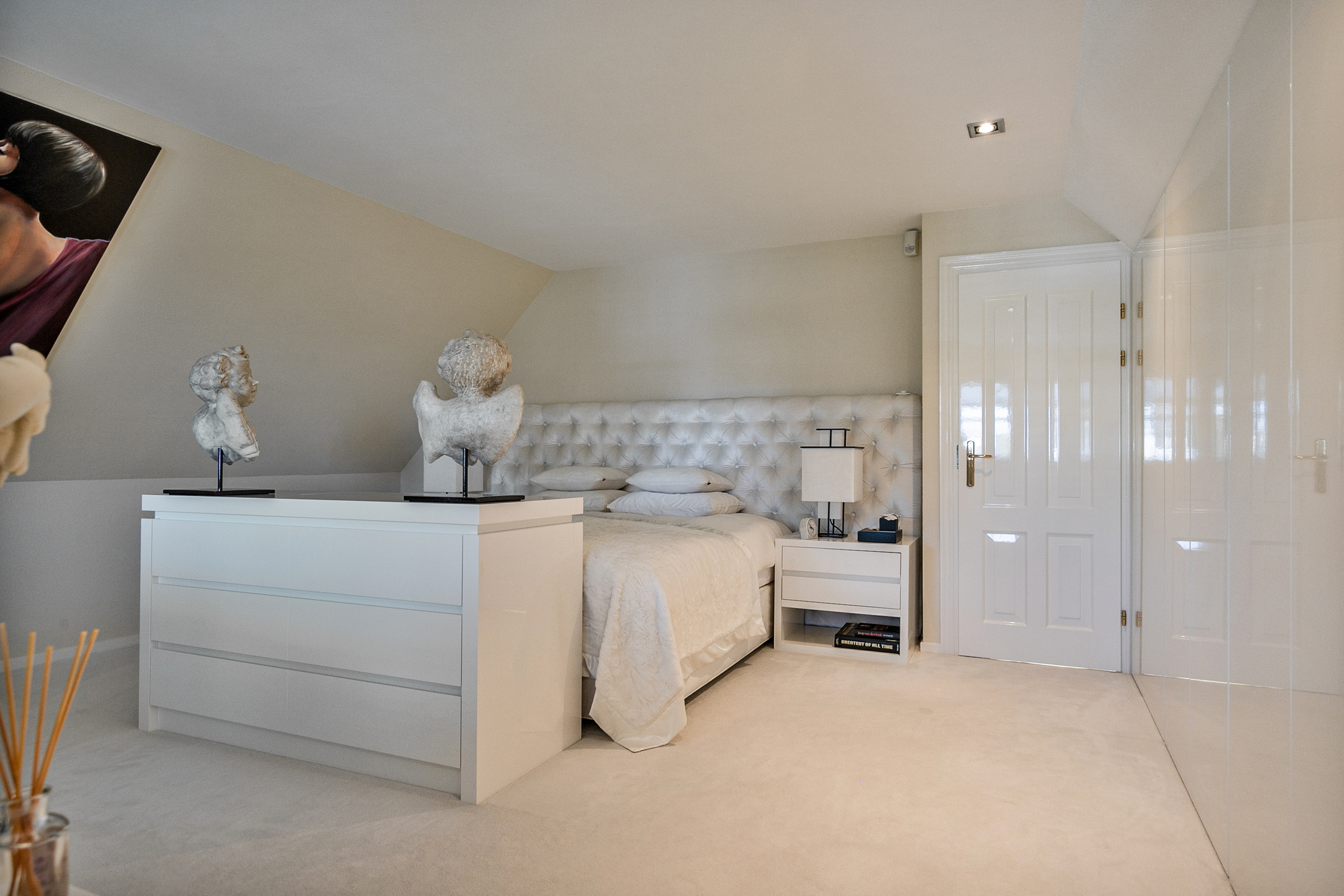 Drie royale slaapkamers, waaronder een elegante masterbedroom met veel kastruimte, en een luxe badkamer met inloopdouche en ligbad.
