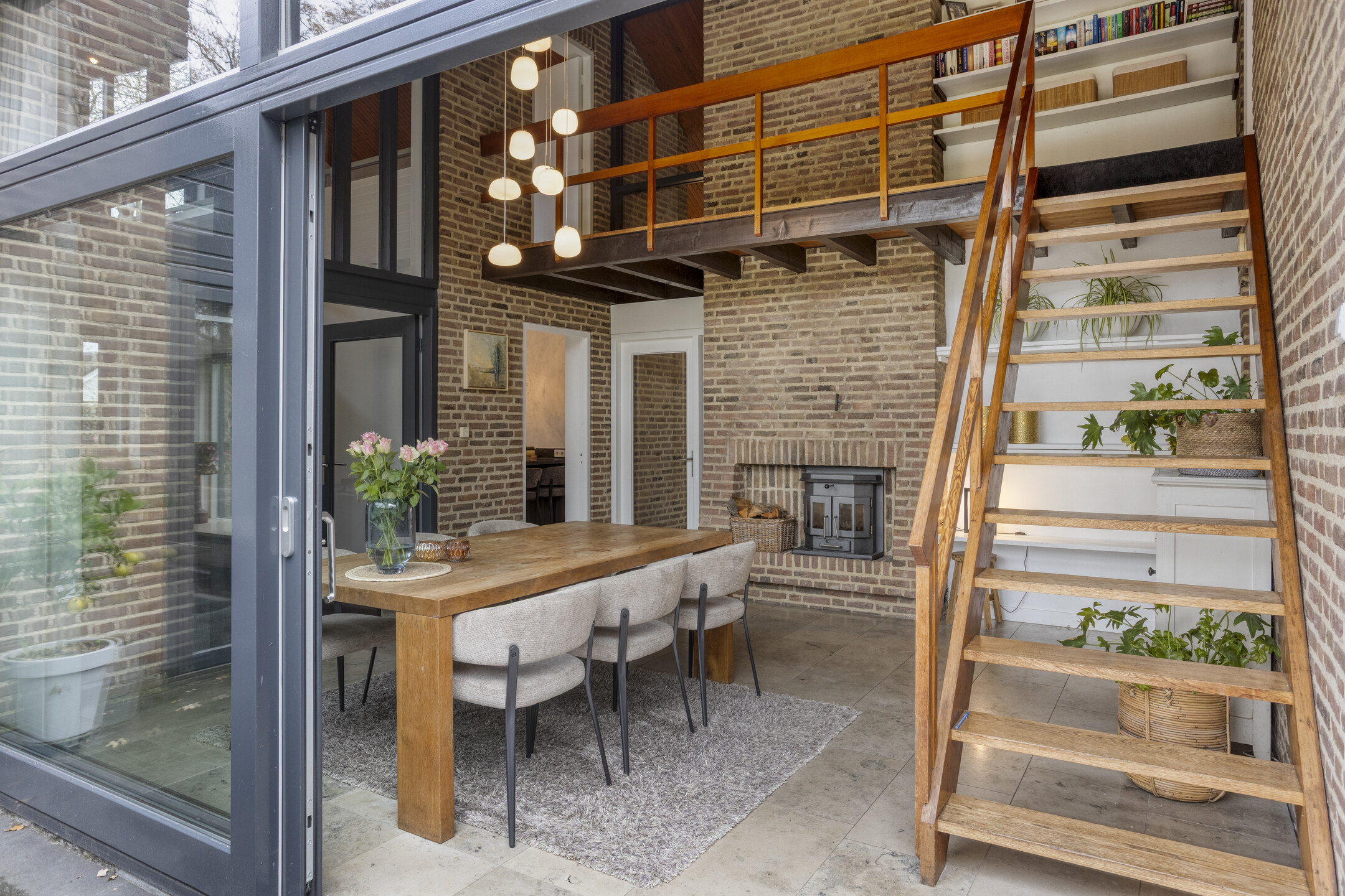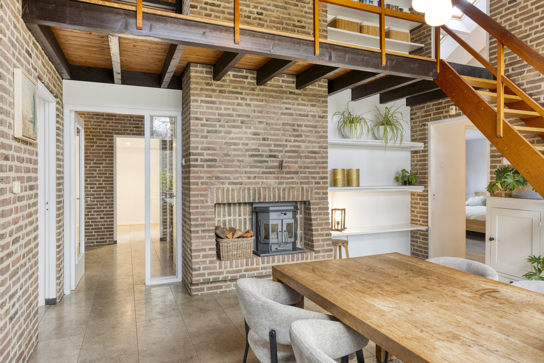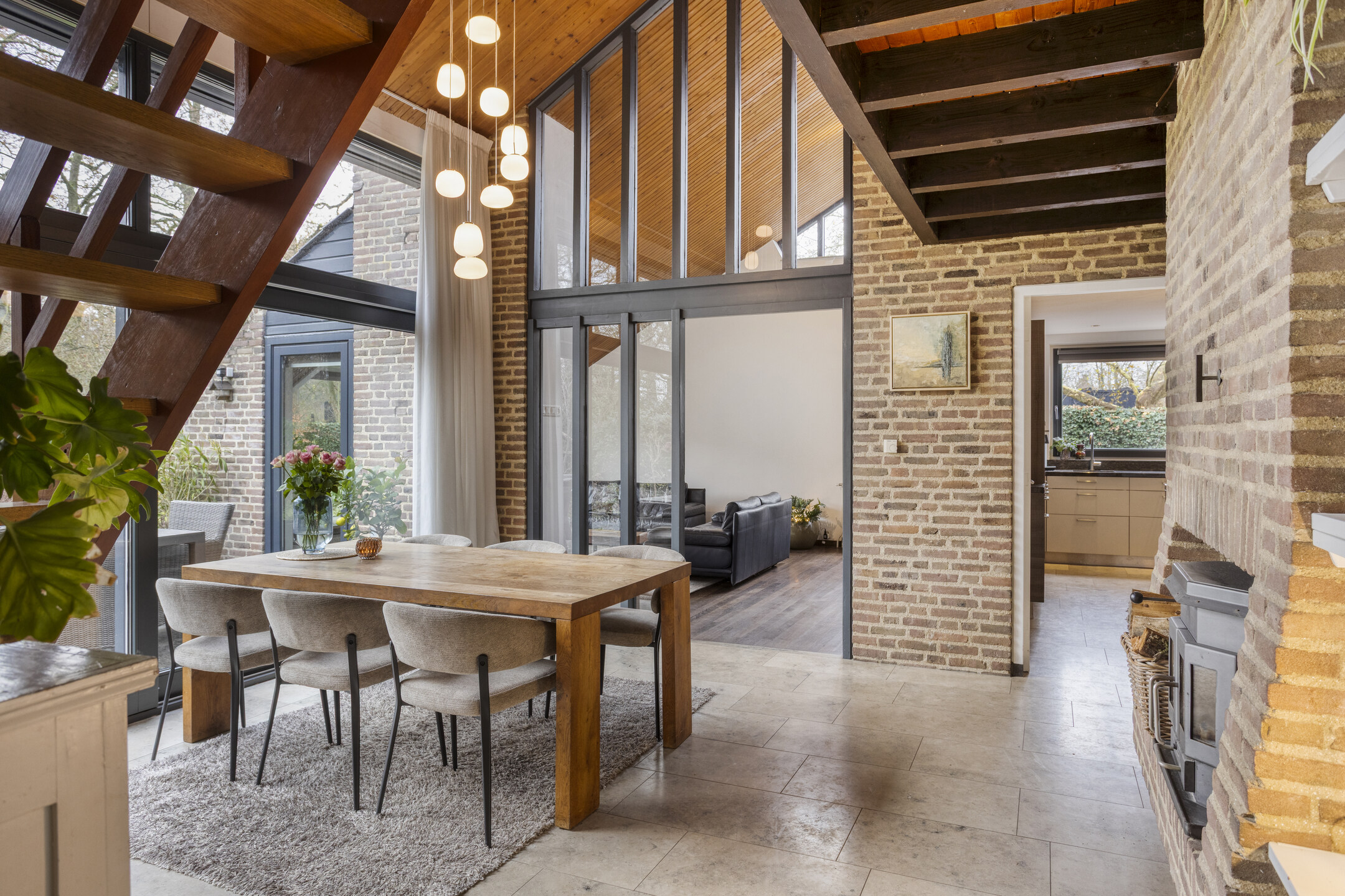 Via de hal kom je in de eetkamer, een lichte en uitnodigende ruimte dankzij de grote schuifpui. De eetkamer is voorzien van een houtkachel. Hier bevindt zich ook de trapopgang naar de eerste verdieping. Vanuit de eetkamer loop je door naar de woonkamer en de keuken. De woonkamer is ook voorzien van een sfeervolle houtkachel. De dichte keuken heeft een speels effect dank zij de bar aan het keukenblad. De keuken is uitgerust met diverse inbouwapparatuur, waaronder een 4-pits inductiekookplaat met afzuigkap, oven, koelkast, vaatwasser, stoomoven, warmhoudlade en een keukenboiler.