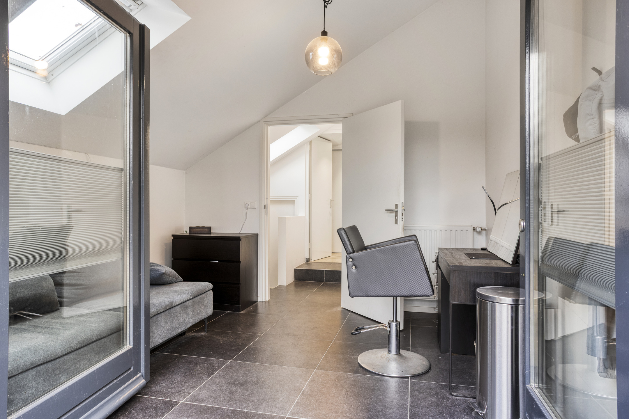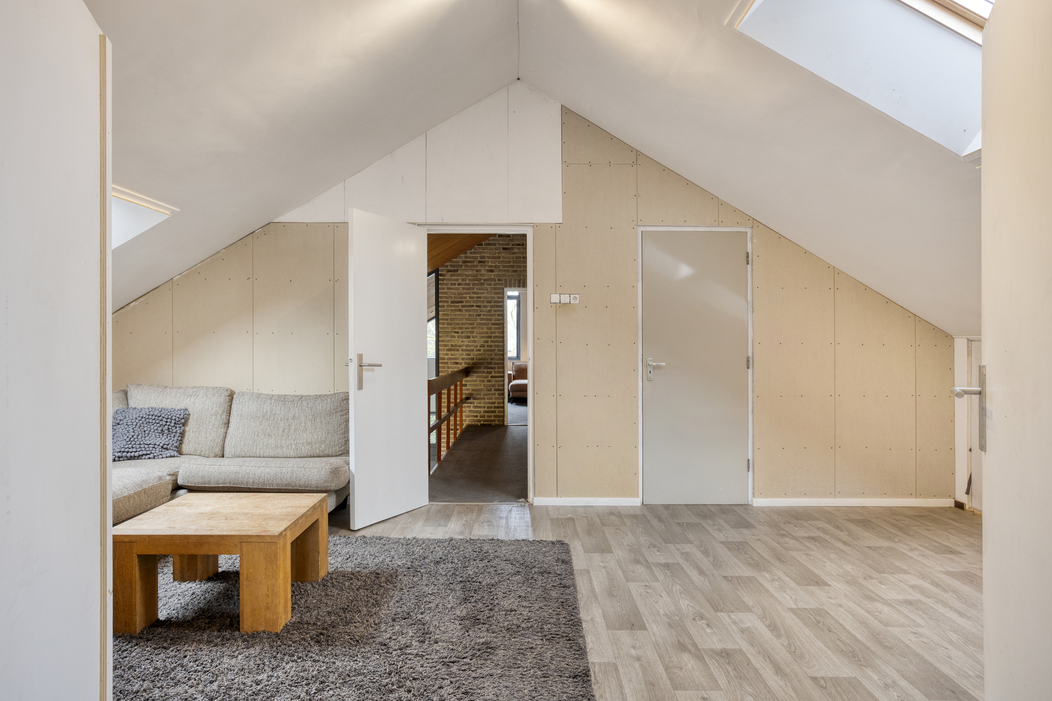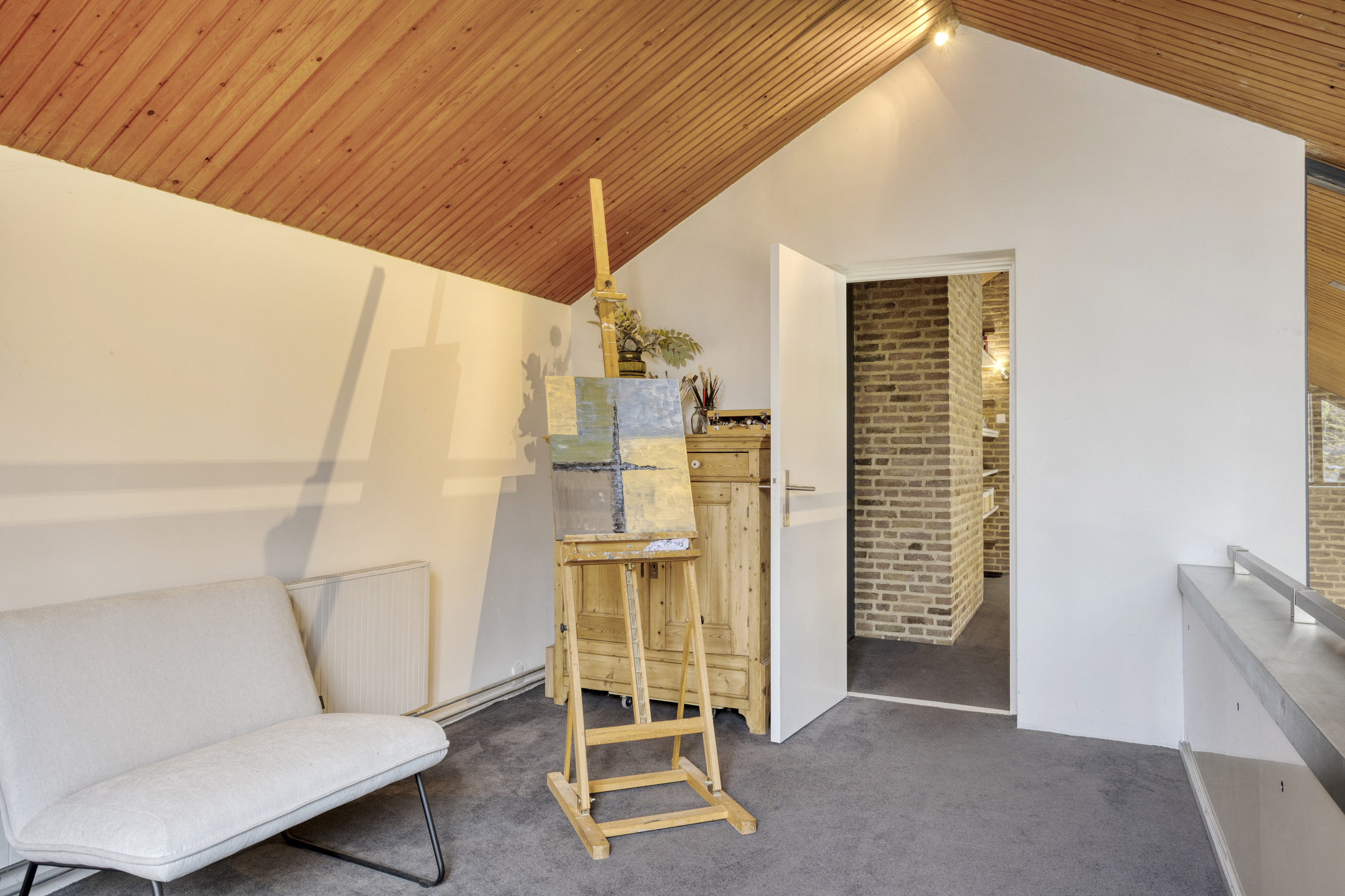 Eerste verdieping: bordes met toegang tot de vide die nu wordt gebruikt als atelier, de berging en de twee hele ruime kamers (30 m²). De berging is voorzien van een wastafel en daar zit tevens de CV-ketel. De ene kamer wordt nu gebruikt als slaapkamer en de ander als extra living. Dit kan uiteraard ook prima gebruikt worden als slaapkamer.