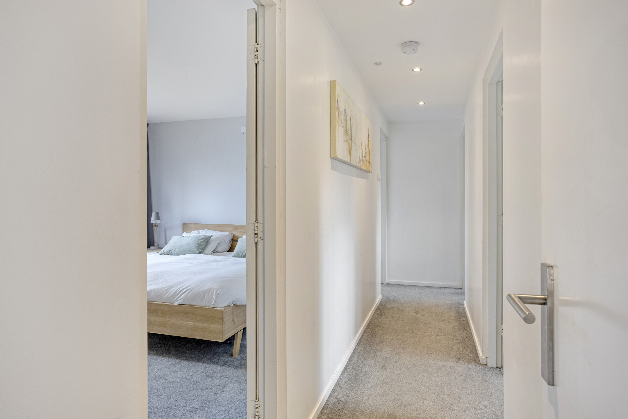 Aansluitend aan de eetkamer ligt een lange gang waaraan vier ruime slaapkamers grenzen. Twee slaapkamers zijn voorzien van een eigen wastafel, de derde slaapkamer heeft wel de aansluiting voor een wastafel. De master bedroom bevindt zich direct naast de badkamer. Deze badkamer is uitgerust met een ligbad, douchecabine, toilet, wastafel met meubel en een designradiator.