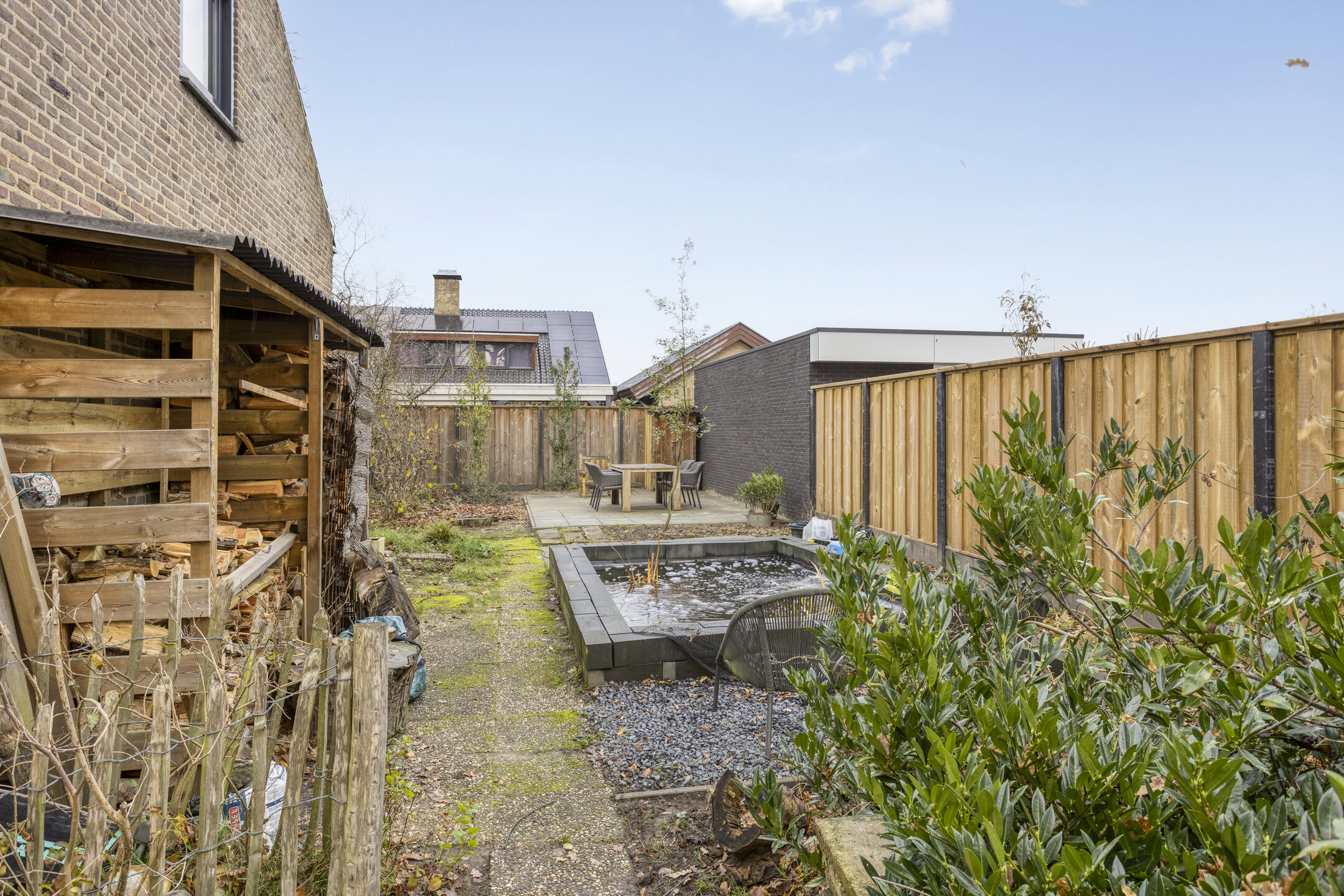 De royale achtertuin loopt volledig rondom de woning en biedt volop groen, meerdere fijne terrassen en zelfs een vijver. In de tuin staat bovendien een vrijstaande tuinkamer, welke is voorzien van een toilet. Deze ruimte is ideaal te gebruiken als kantoor, salon of hobbyruimte. De tuinkamer is in 2023 geheel gerenoveerd en geïsoleerd.