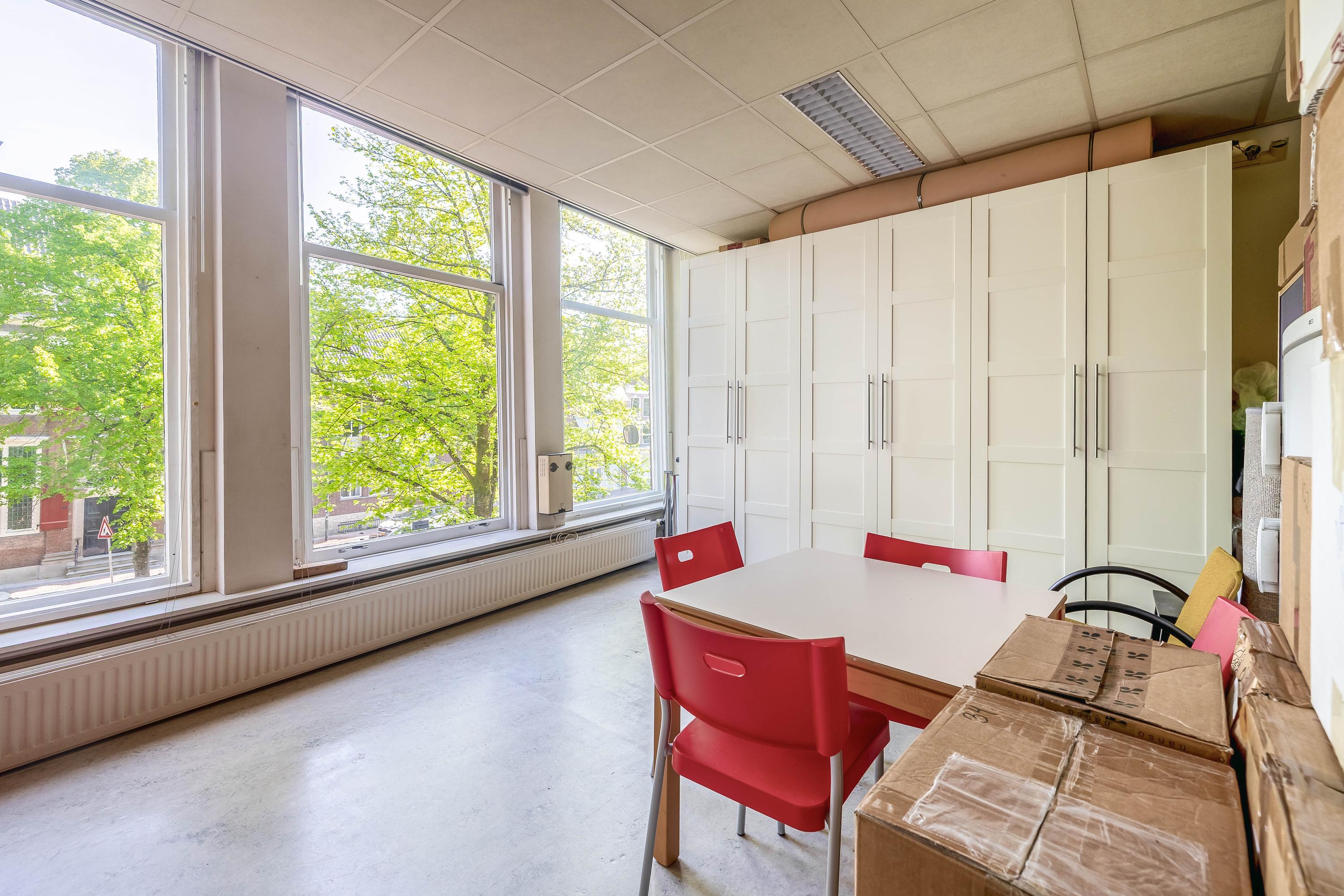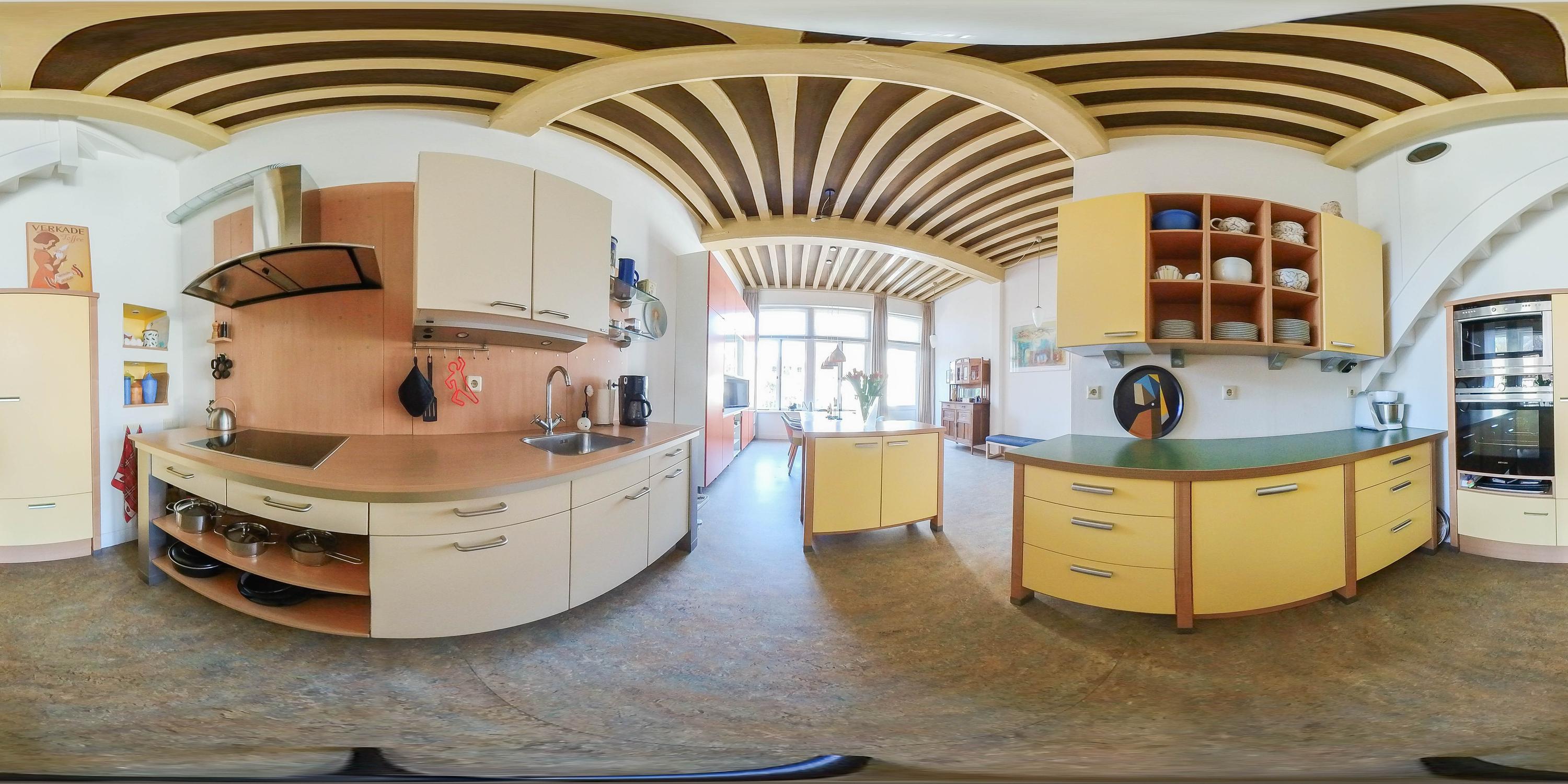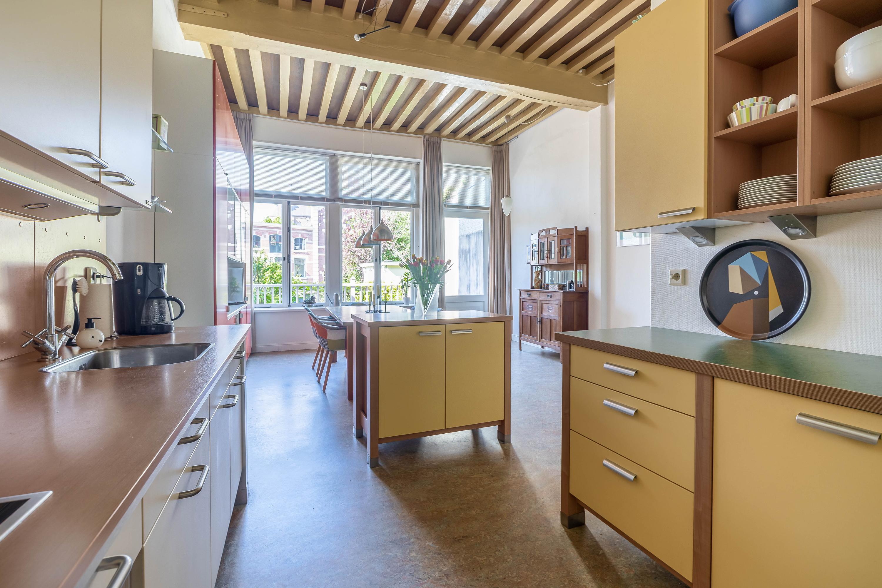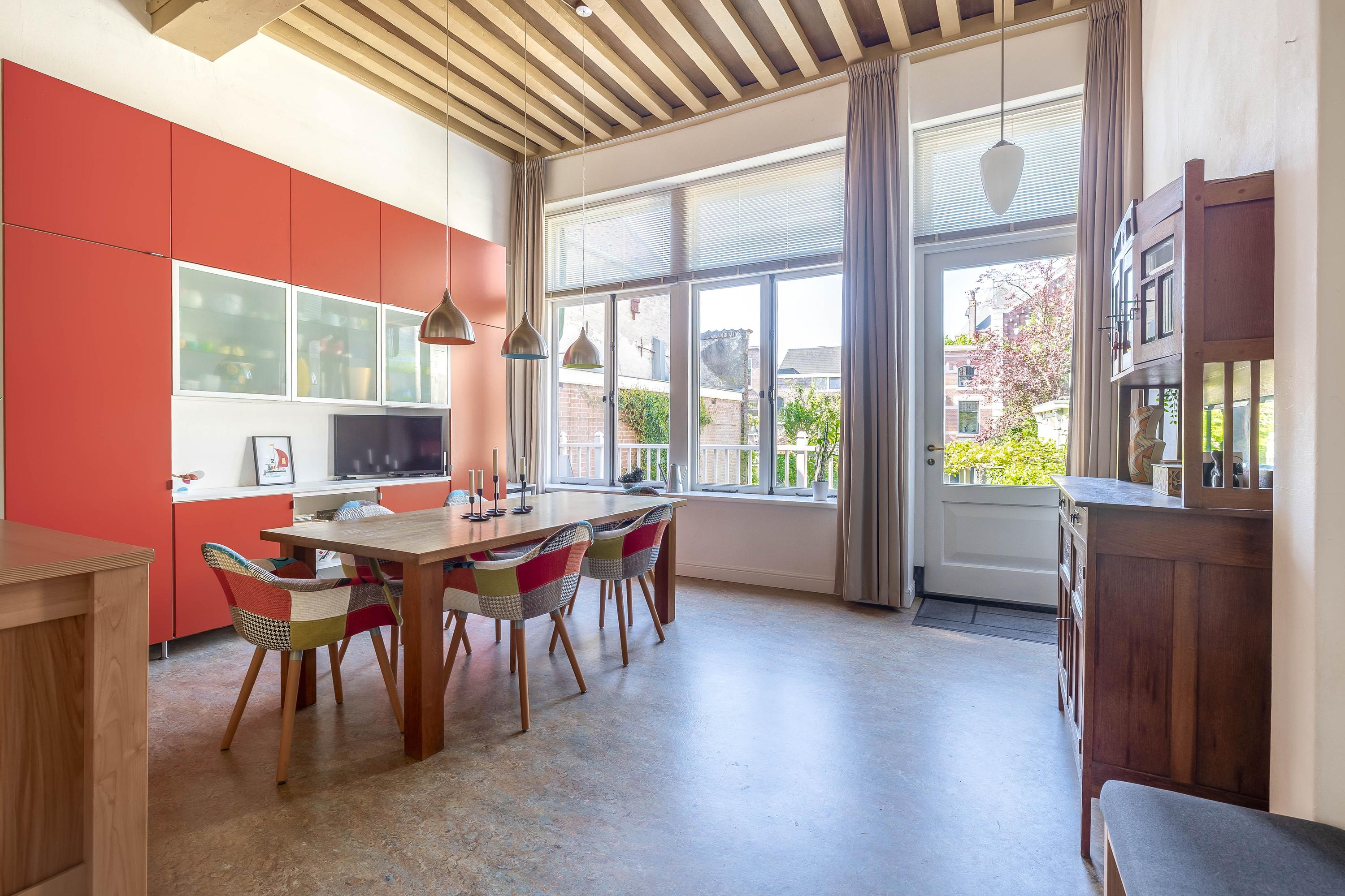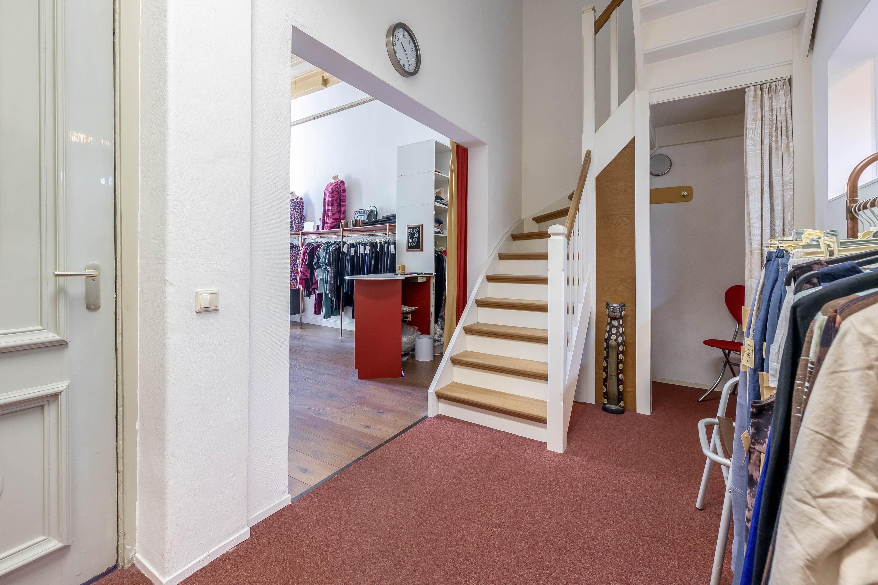 winkelruimte met prachtig houten lijstenplafond, trappartij (geheel vernieuwd), atelier met vlizotrap naar bergvliering, toiletruimte, 2e trappartij (geheel vernieuwd), grote woonkeuken met schitterend uitzicht op de tuin, keukenopstelling met inductiekookplaat, afzuigkap, combi-oven, heteluchtoven, vaatwasser, keukenboiler, marmoleum met vloerverwarming en deur naar het terras op het zuid-westen.
