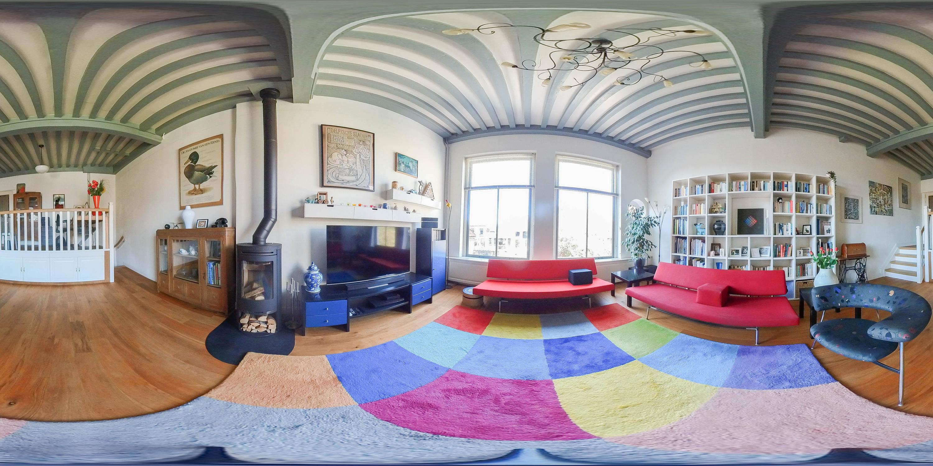 woonkamer met houten vloer, balkenplafond, HR houtkachel met buitenluchttoevoer, speelse verhoogde werkplek,