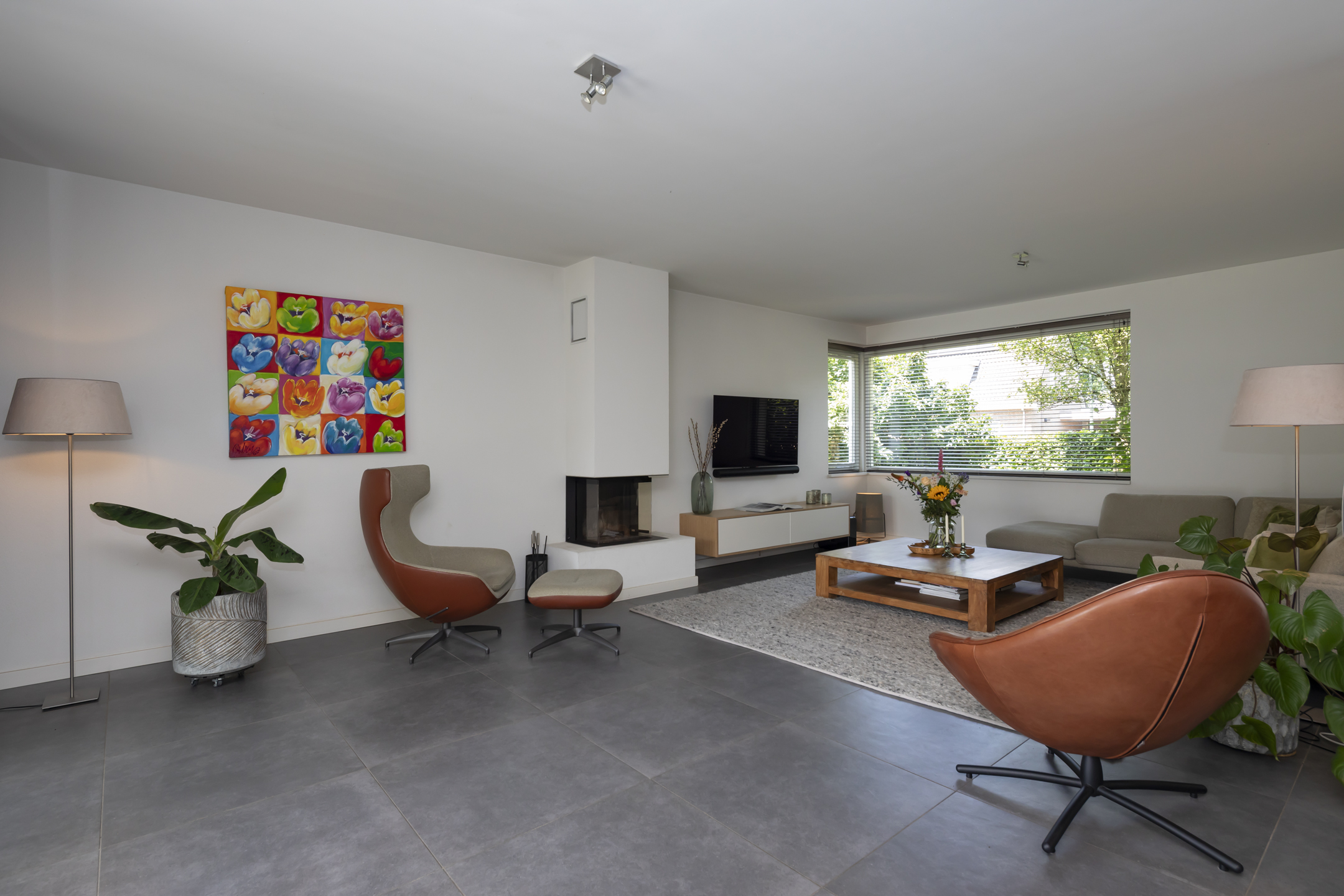 De sfeervolle haard bevindt zich centraal in de woonkamer. Het is een zonnige woonkamer dankzij de grote raampartij aan de voorzijde en de schuifpui aan de achterzijde, welke toegang geeft tot het fijne overdekte terras.