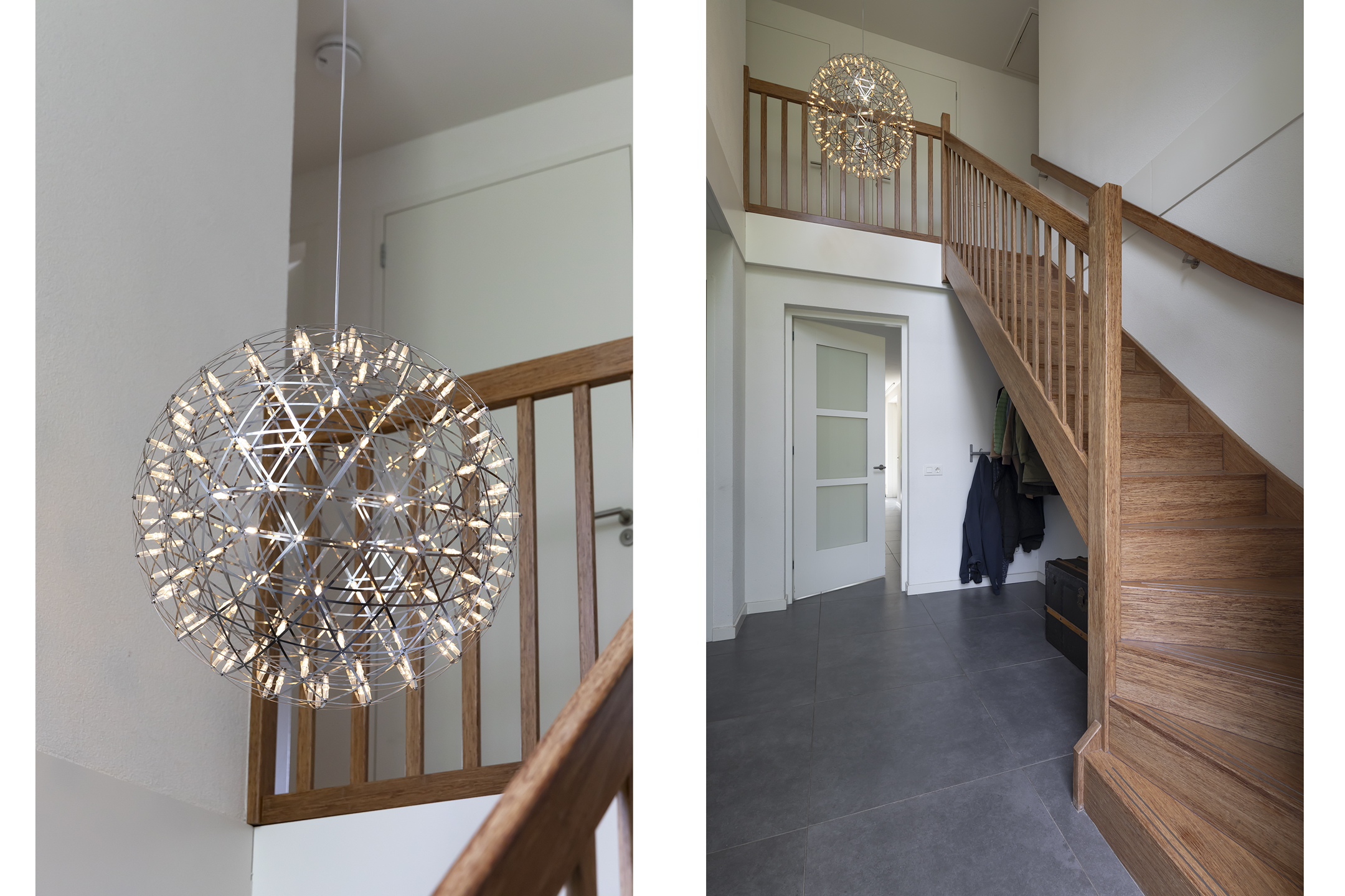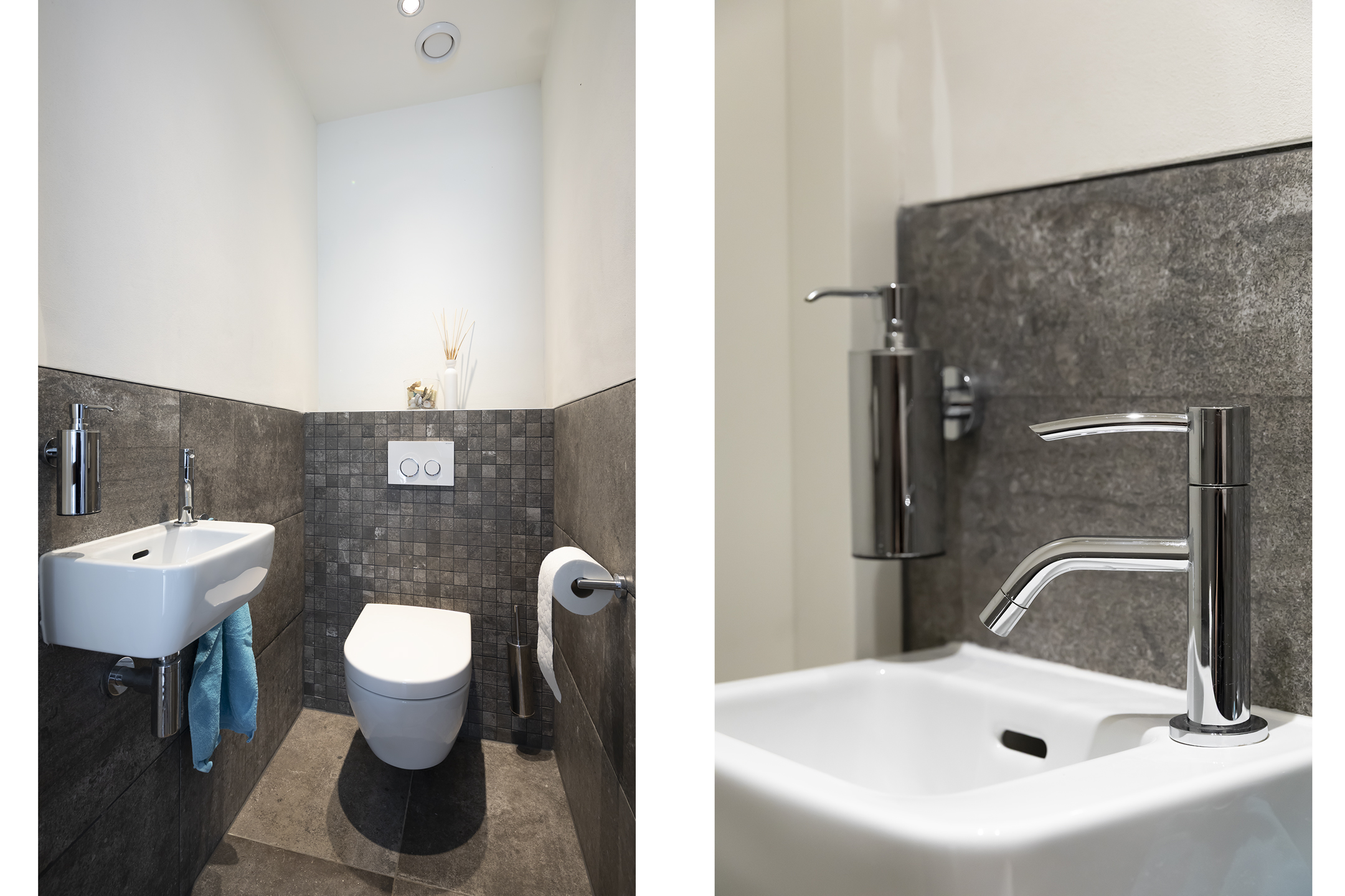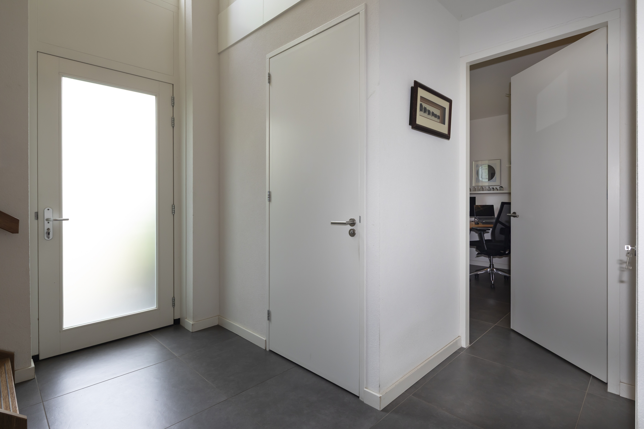 U treedt binnen in de hal, waar zich de meterkast, de toiletruimte met fonteintje, de trapopgang naar de verdieping en de toegangsdeur tot de woonkamer bevinden.