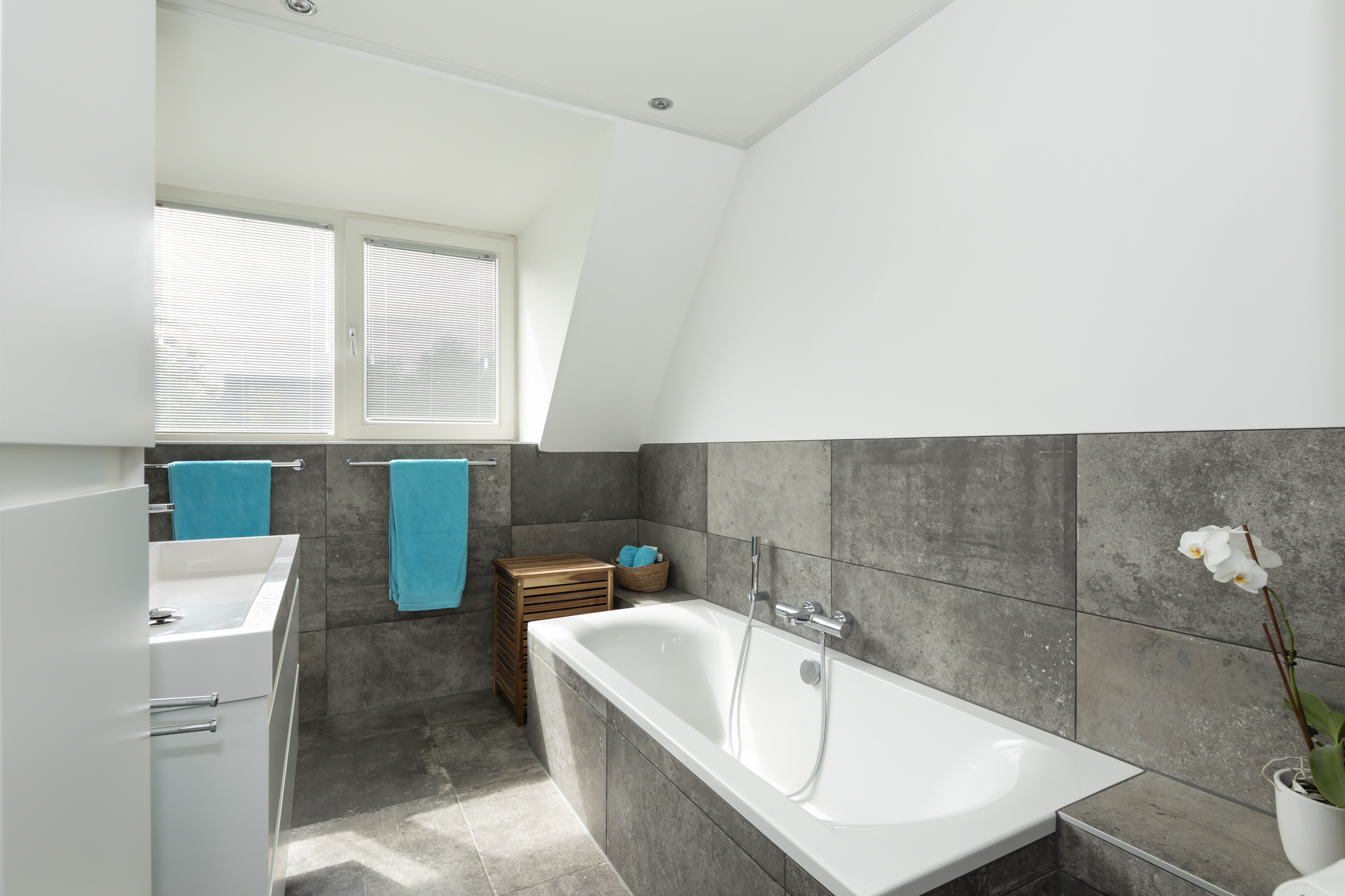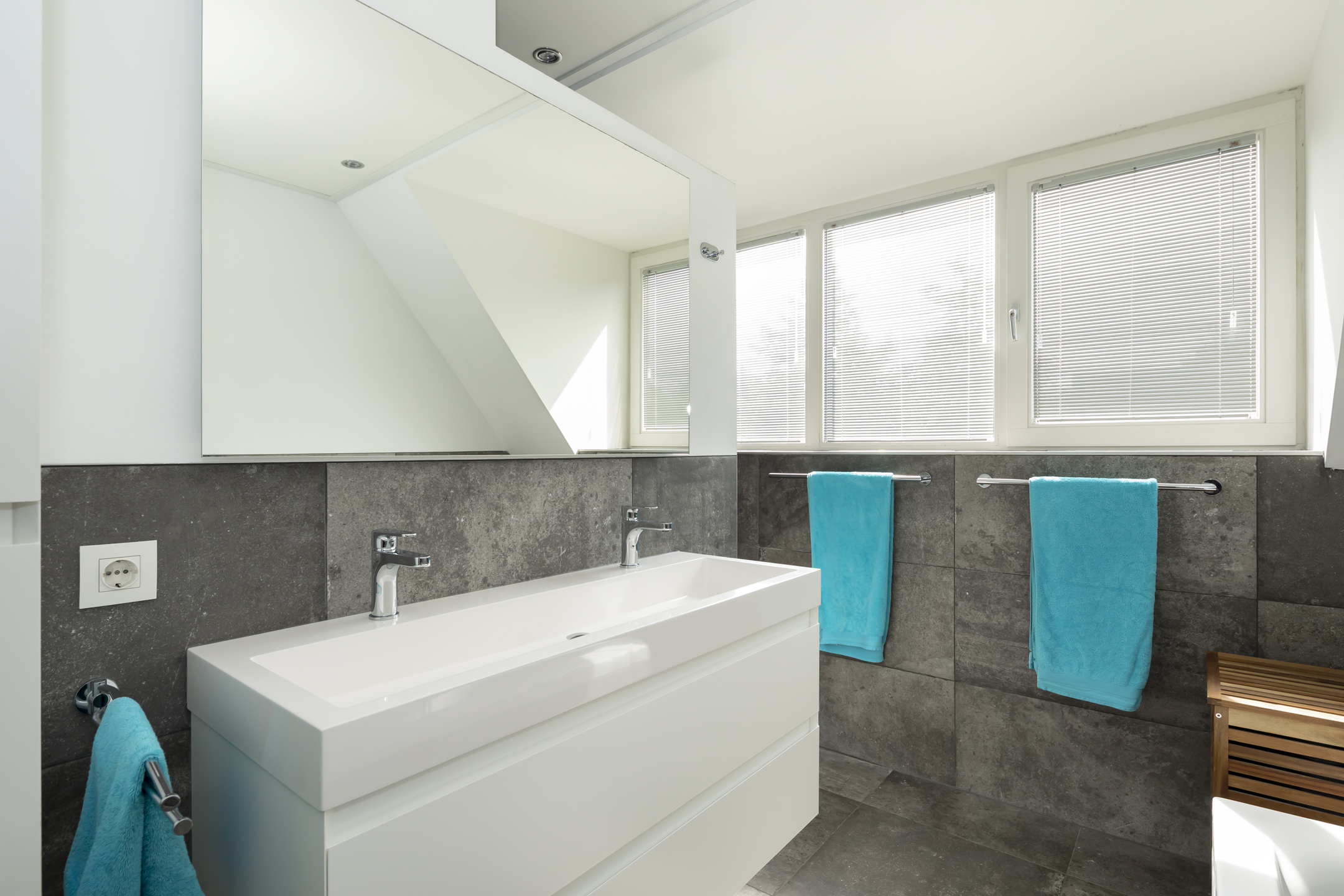 De badkamer is van alle gemakken voorzien, heeft een groot ligbad, een ruime inloopdouche en een dubbele wastafel geïntegreerd in een badkamermeubel. De badkamer beschikt over fijn natuurlijk daglicht, dankzij het grote raamkozijn. Hij is netjes betegeld en is voorzien van aangename vloerverwarming en een designradiator