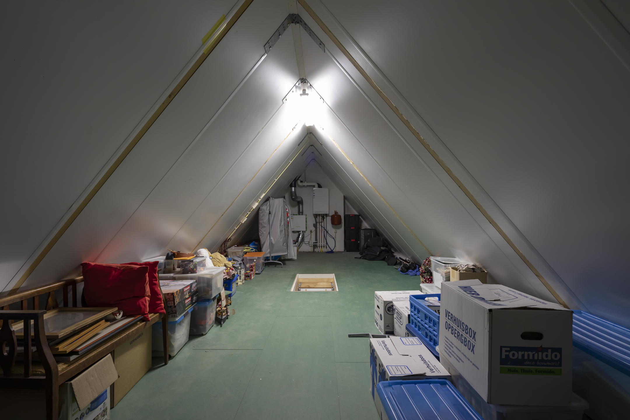Deze fijne, praktische ruimte biedt plaats aan al uw niet dagelijks benodigde spullen. De bergzolder strekt zich uit over de volledige lengte van de woning, ca. 11,5 meter.
