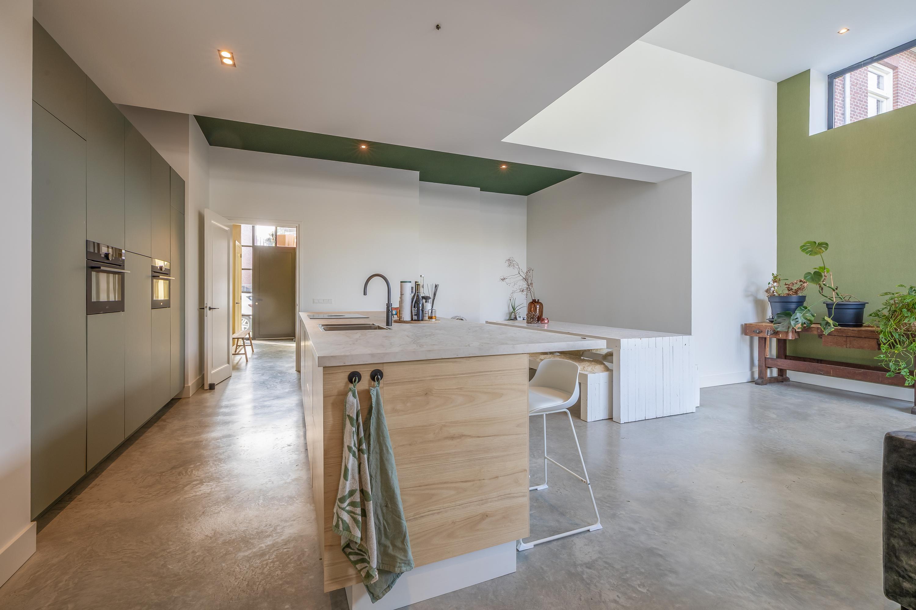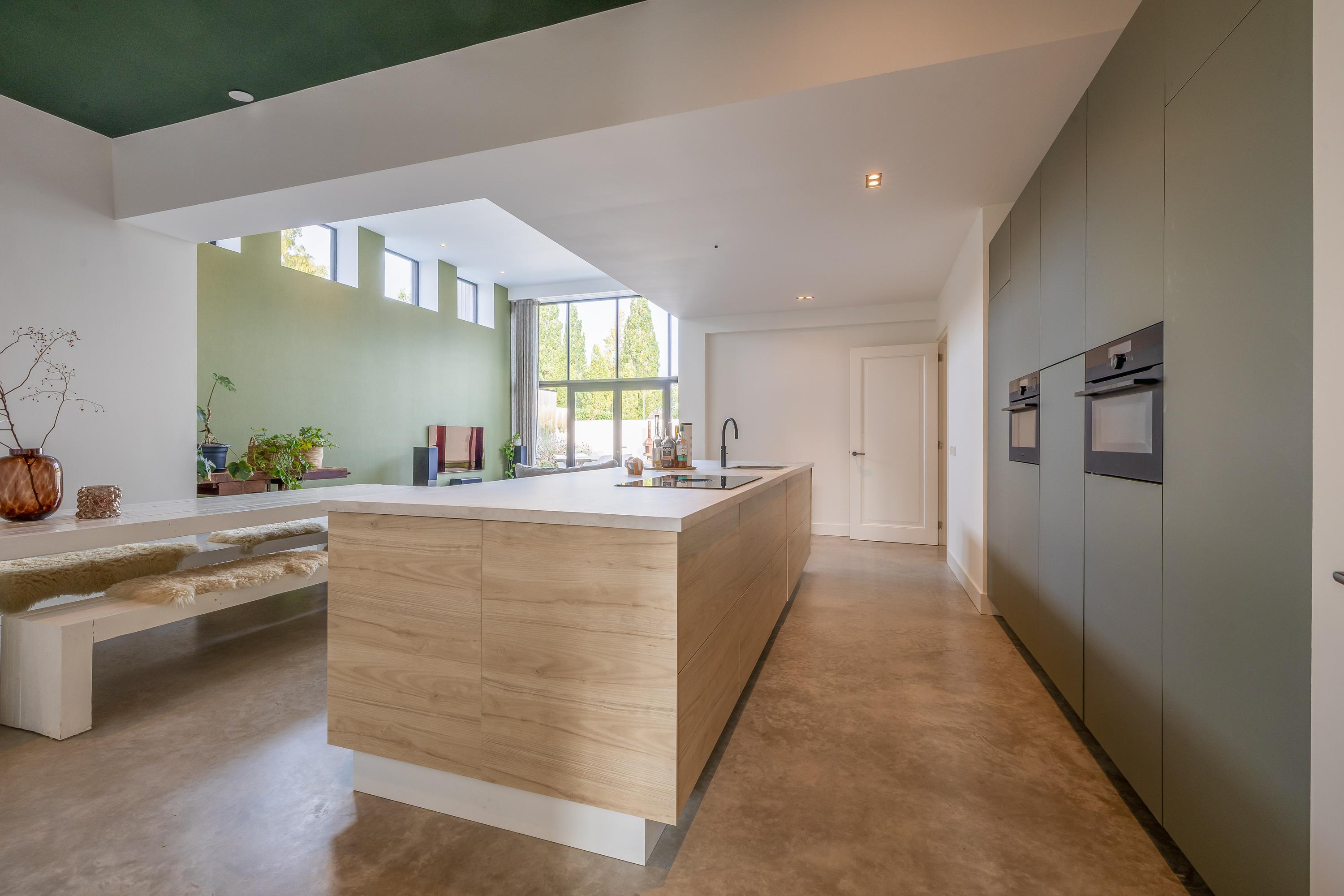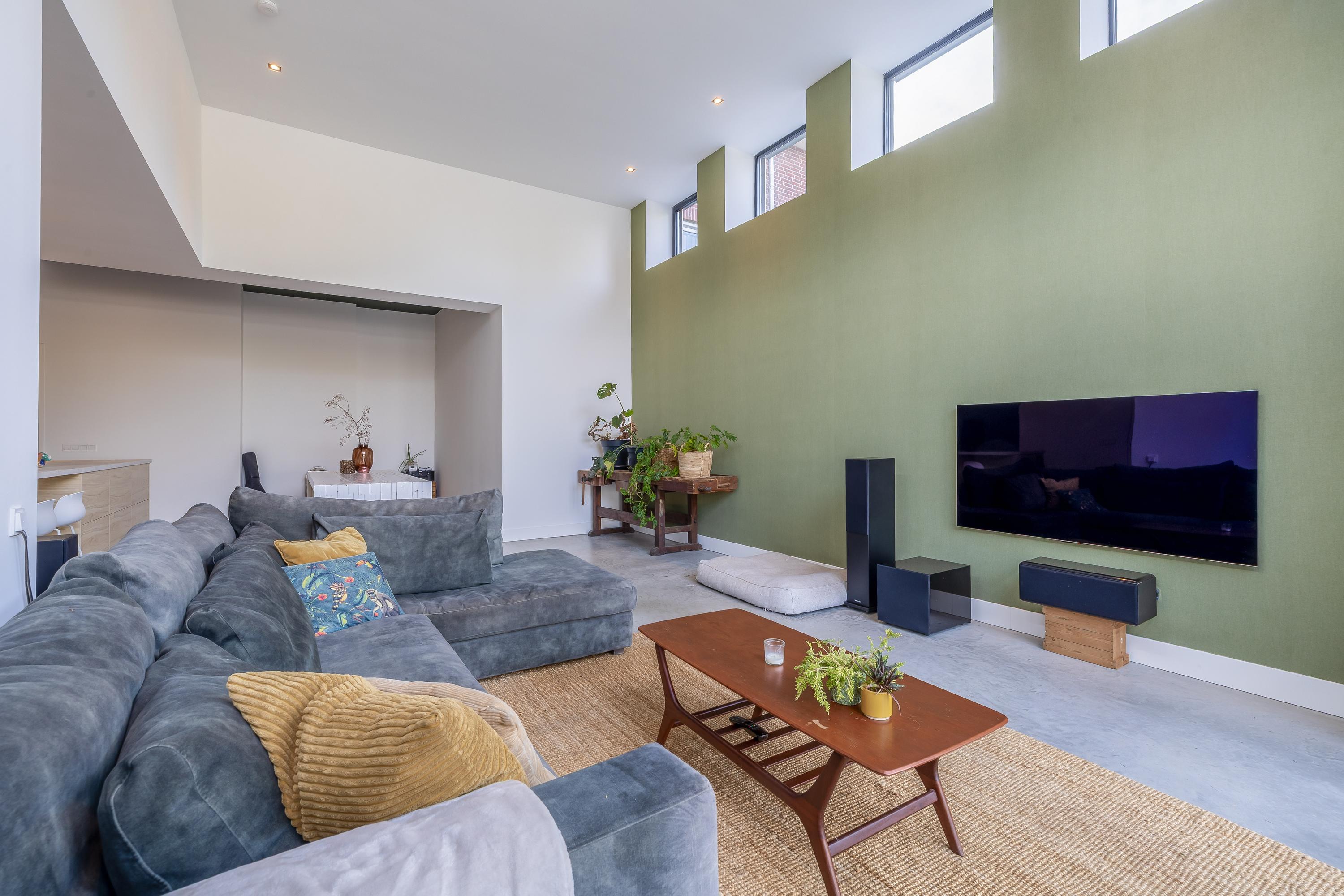 In de riante woonkamer met open keuken is eveneens veel natuurlijke lichtinval door de grote glazen pui aan de achterzijde en de kleinere ramen bovenin. Door de hoogte van de ruimte is het een zeer grote en prettige leefruimte.