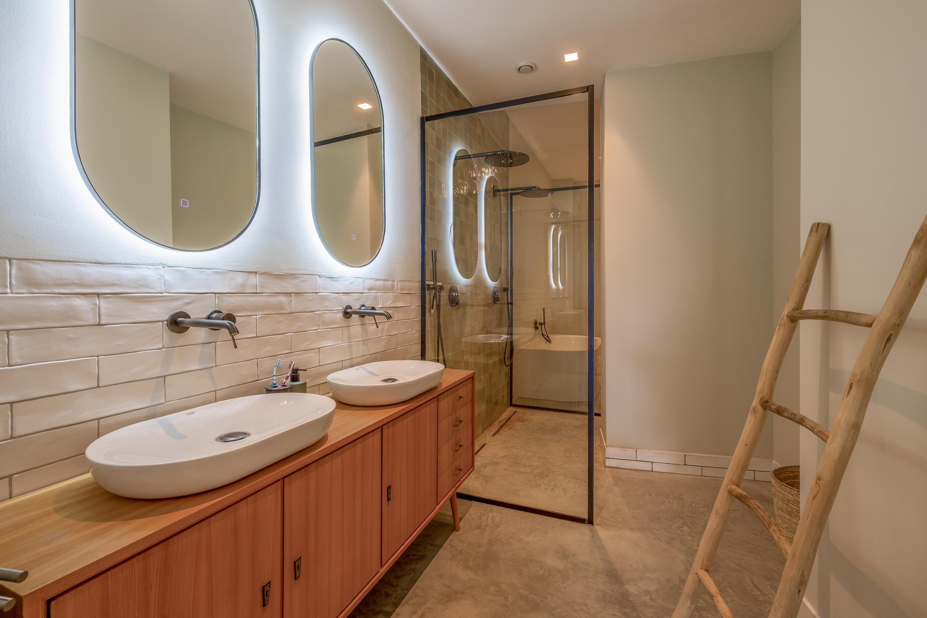 Het toilet is voorzien van een fonteintje. De grote en langwerpige badkamer is bereikbaar vanuit beide hallen. De badkamer is uitgerust met een ligbad, een grote, dubbele inloopdouche, een dubbel wastafelmeubel en nog een losse wastafel.