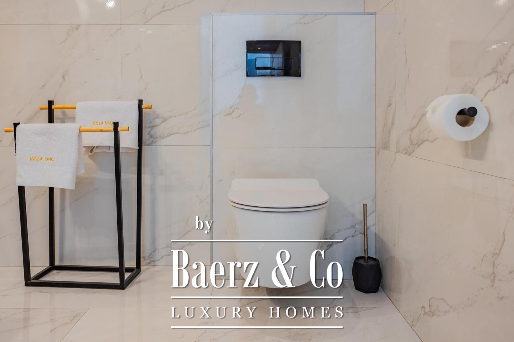 Op een perceel van 531 m² strekt de villa zich uit over drie verdiepingen, verbonden door een interne trap en lift, met circa 250 m² verfijnde leefruimte. De begane grond biedt een kinderkamer, een badkamer en een master suite met en suite badkamer, rondom een open keuken, eetruimte en royale woonkamer. De woonkamer grenst aan een aangelegde terrasvormige tuin, ingericht voor ontspanning en entertainment, compleet met zwembad, zonneterras met ligstoelen, overdekte lounge, bar, barbecue en een kinderspeelplaats.