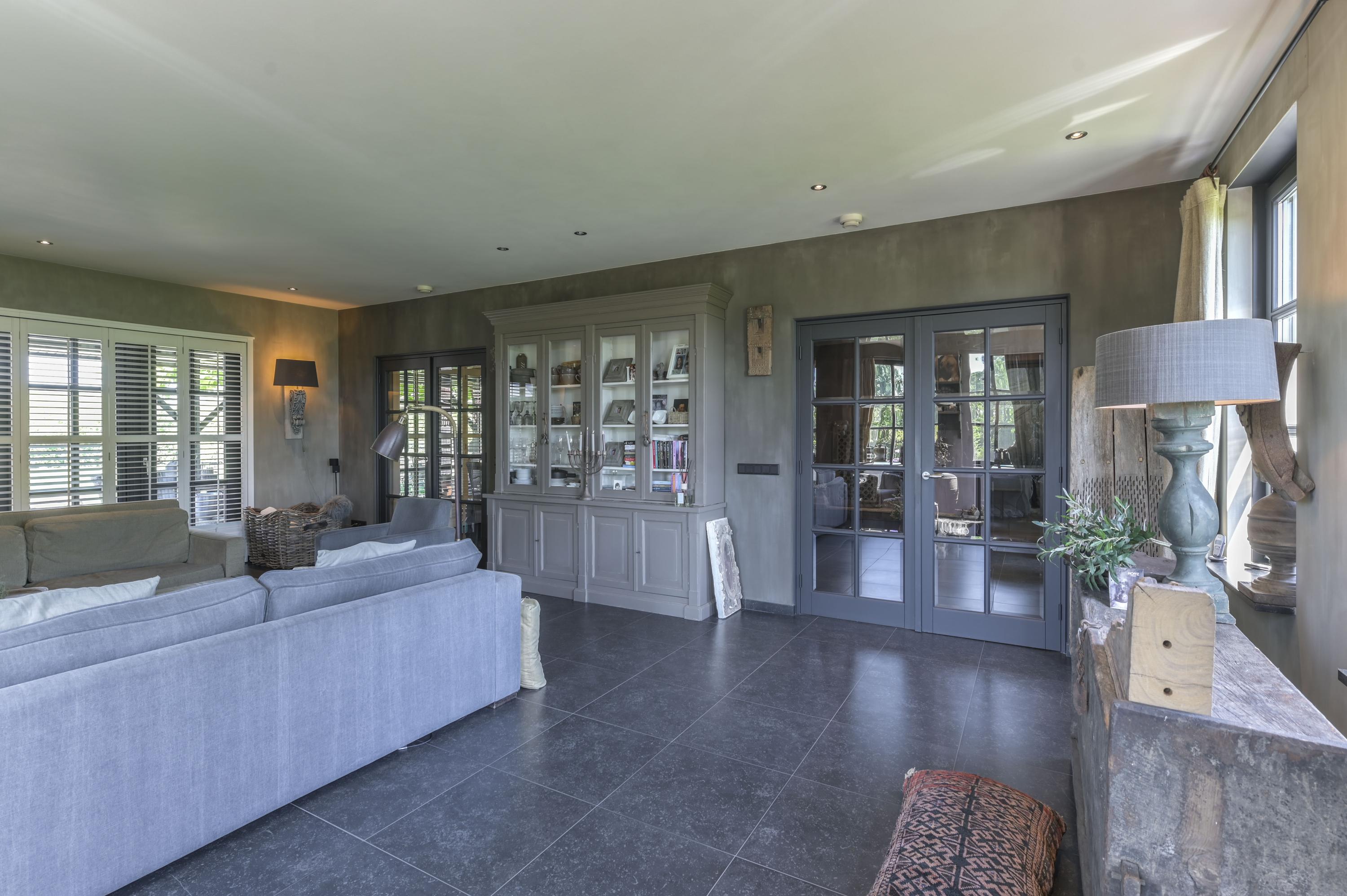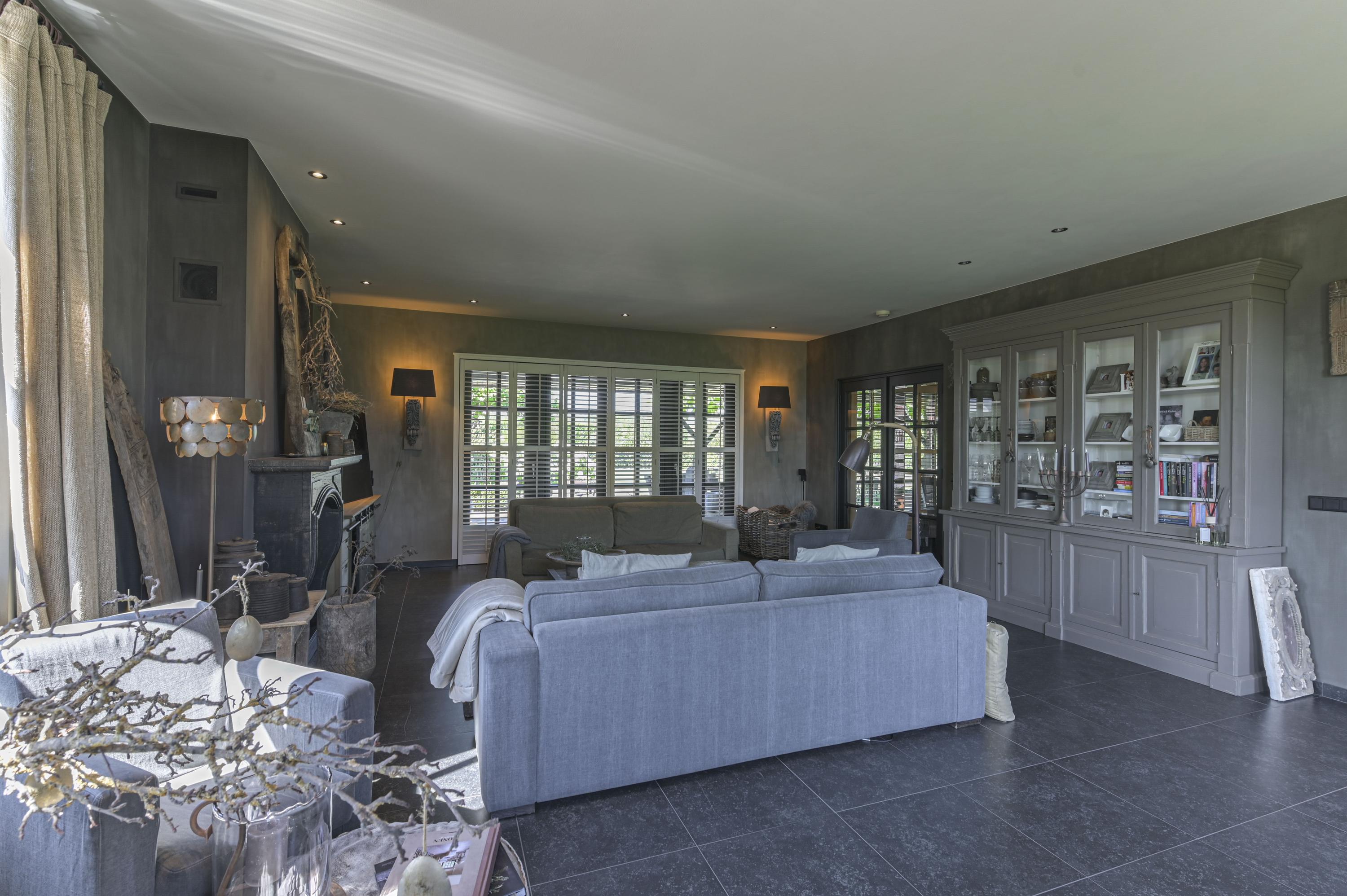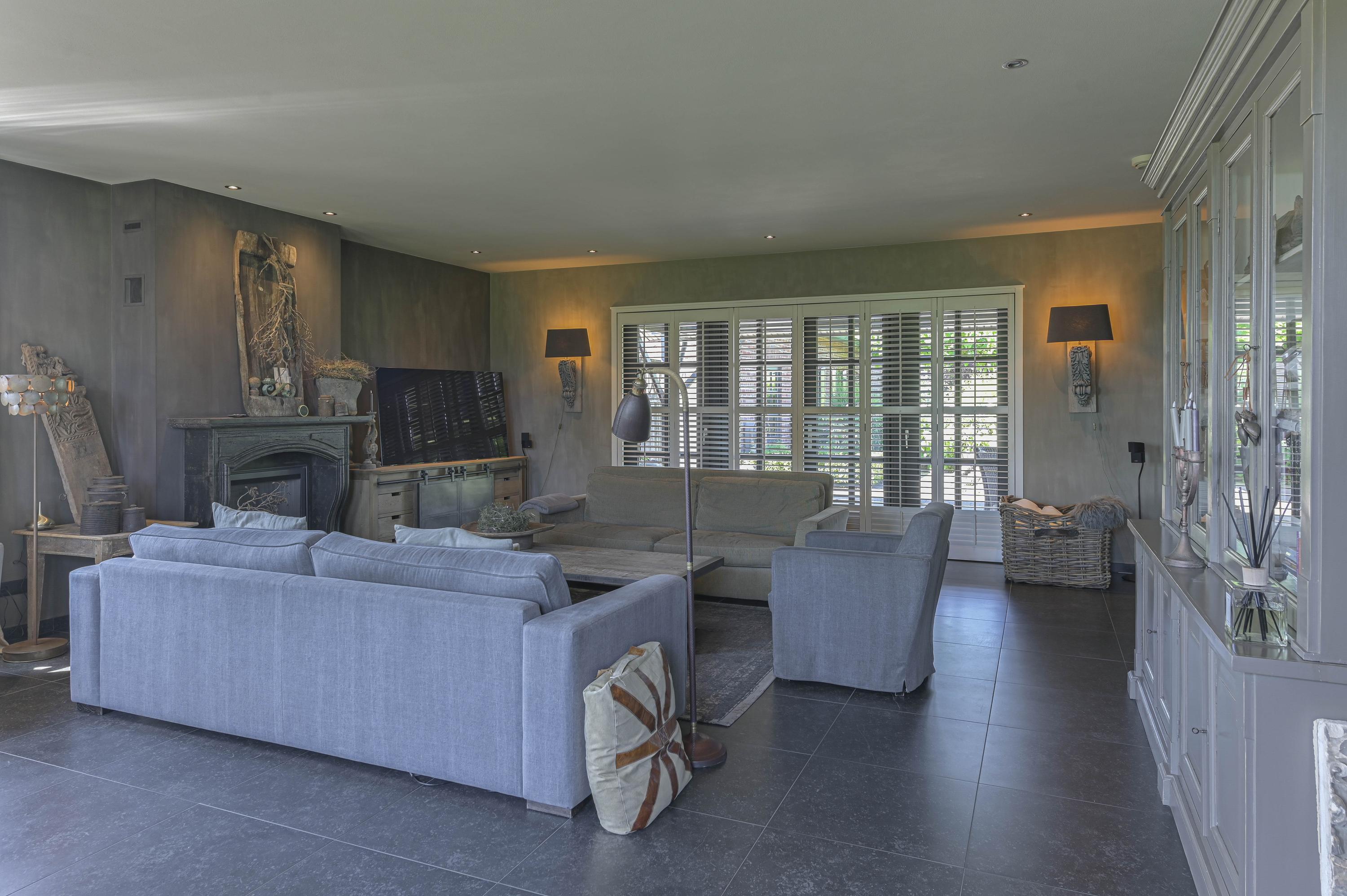 De woonkamer met open keuken en de bijkeuken zijn voorzien van een doorlopende keramische tegelvloer met vloerverwarming. Daarnaast zijn er overal houten shutters aanwezig. De ruimtes zijn hoog en voorzien van spotjes.