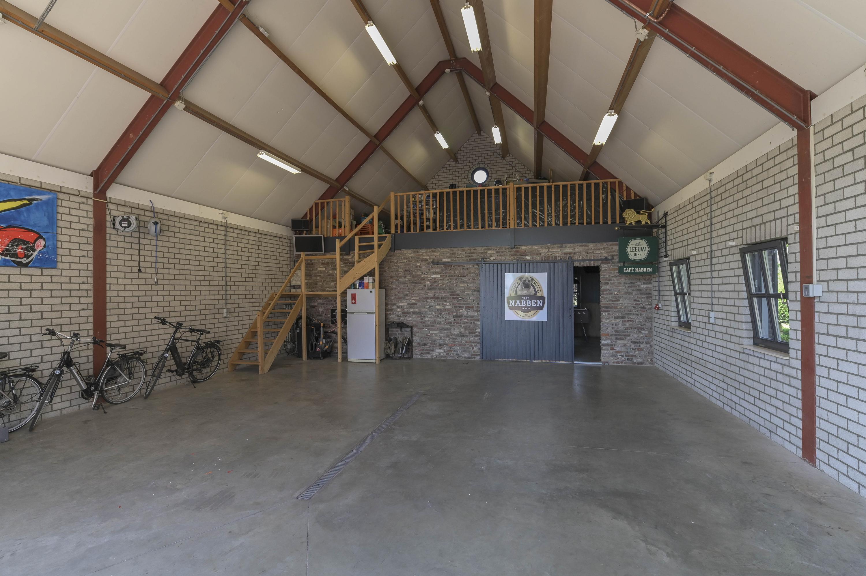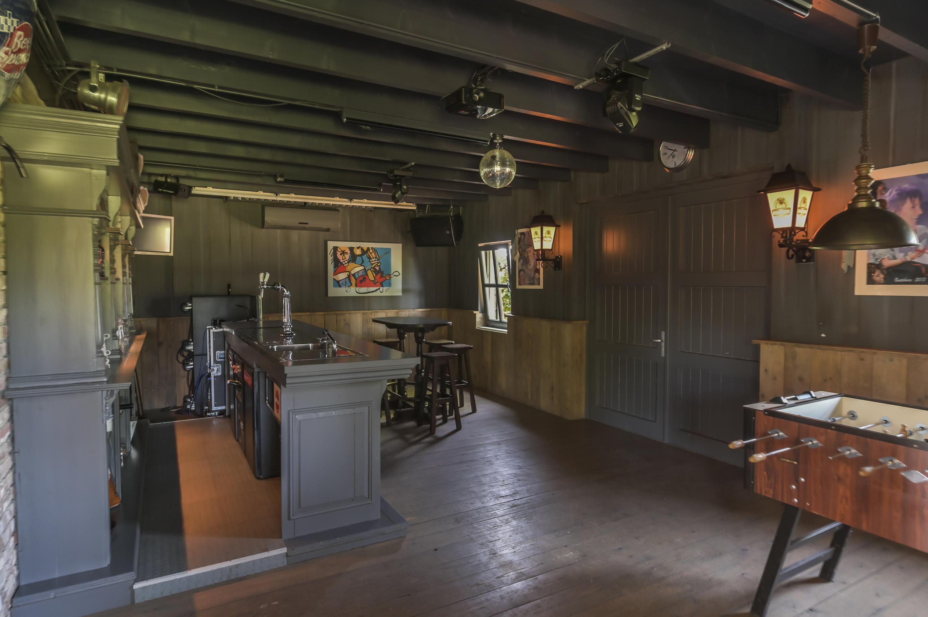 De garage is zeer groot en biedt plek voor meerdere auto's. Deze is volledig geisoleerd en voorzien van een aparte boiler, elektrische poort, loopdeur, toilet en een vide met raampje. De garage is zeer hoog en biedt diverse mogelijkheden. Aan de achterzijde is een gedeelte ingericht met een eigen bar. Hier zijn een houten vloer en airco aanwezig. Openslaande deuren bieden vanuit hier toegang tot de tuin.