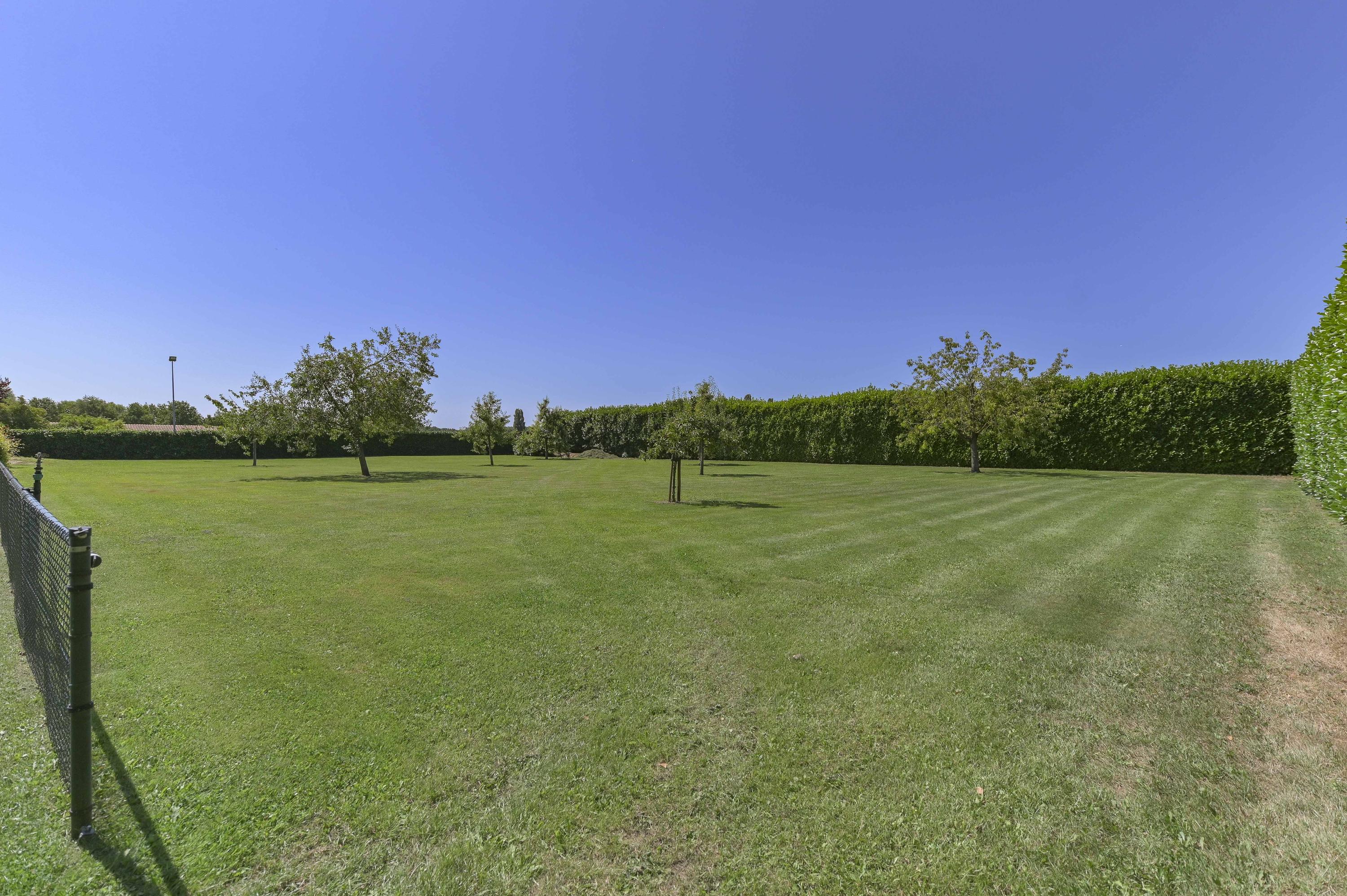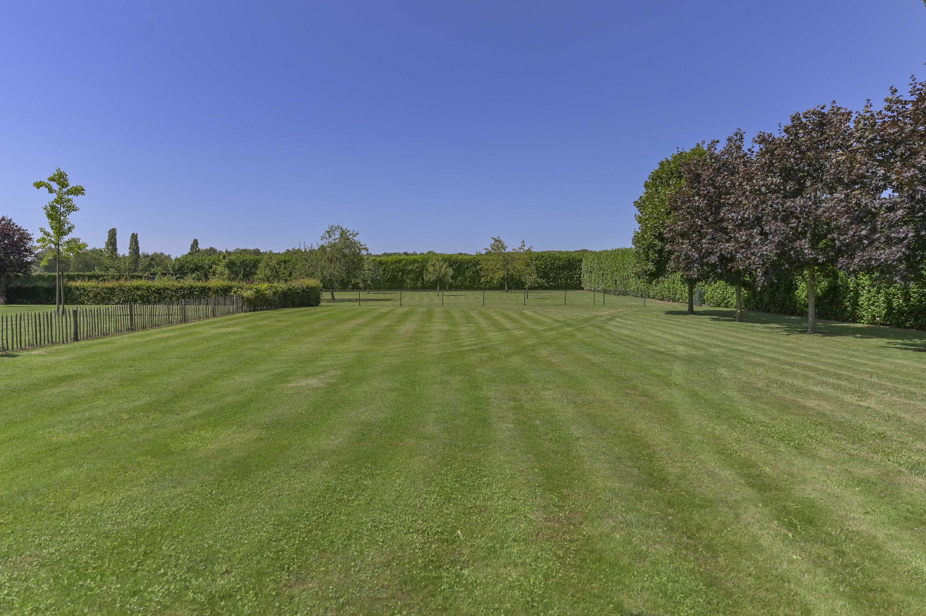 De achtertuin is volledig omheind met een groene haag en voorzien van een sproei installatie en grondwaterput.