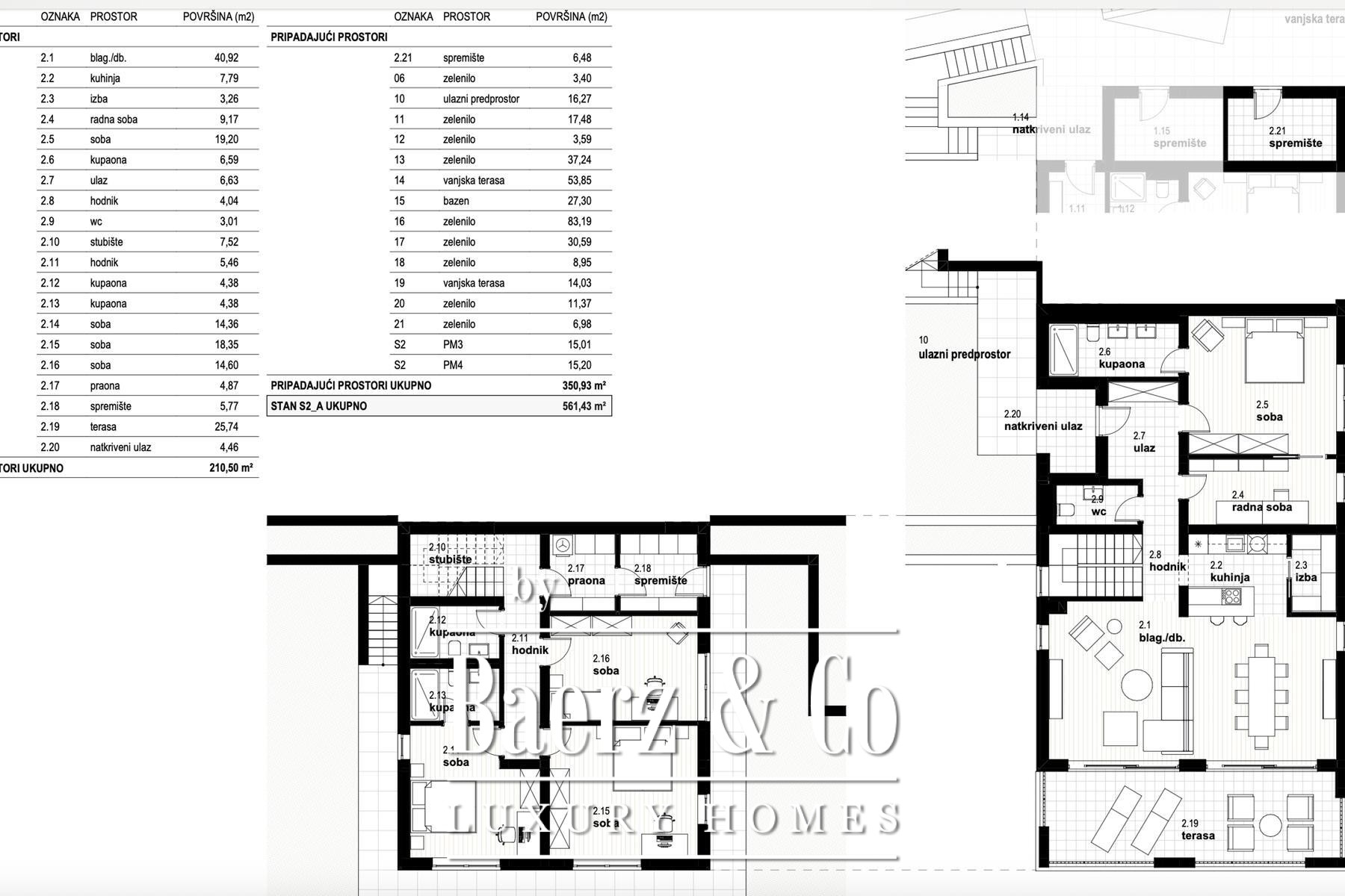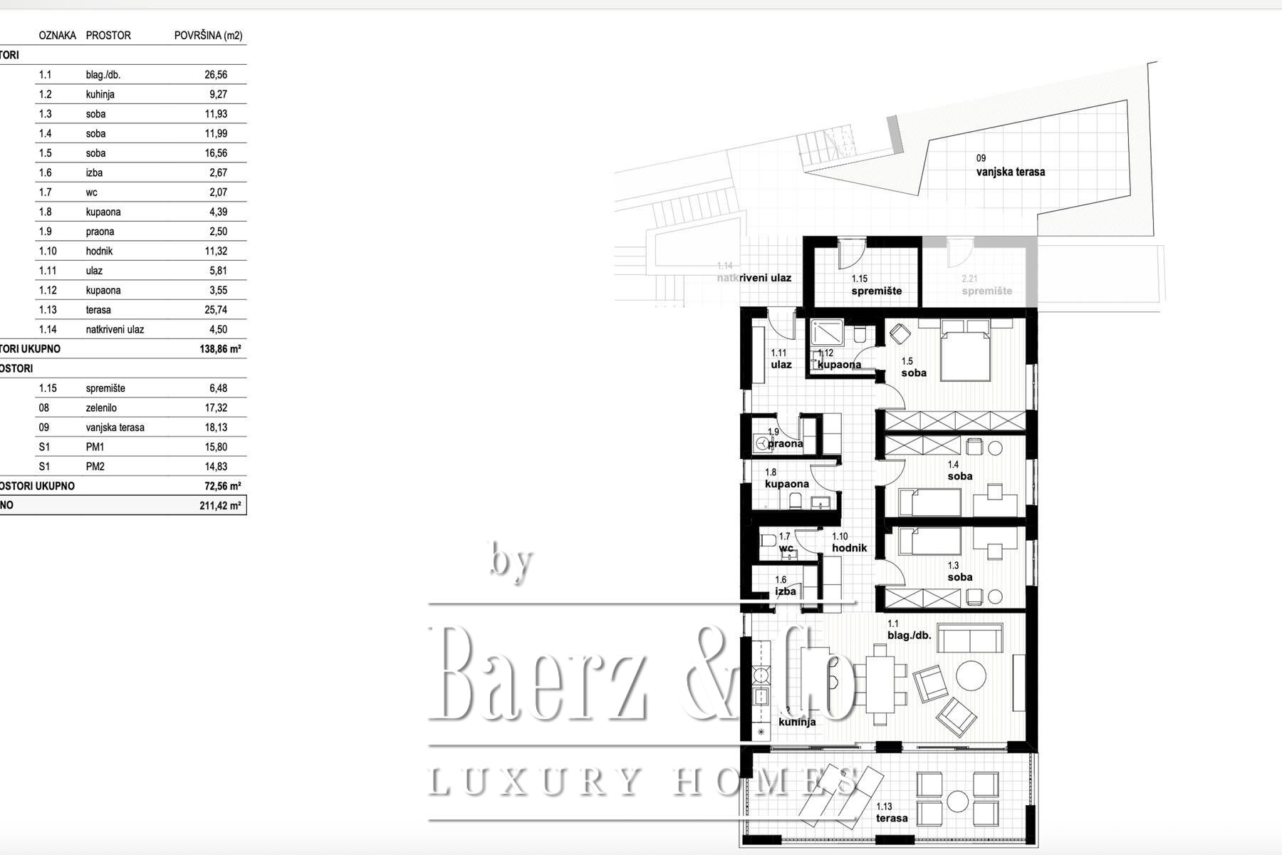 Dit appartement in Kostrena beslaat 251,58 m² in een elegant nieuwbouwcomplex en biedt een zeldzame combinatie van hedendaagse architectuur en ontspannen kustleven. Verspreid over twee niveaus beschikt de woning over vijf discreet vormgegeven slaapkamers en vijf badkamers, waarbij elk vertrek is ontworpen met oog voor licht, privacy en een open verbinding met buiten. De royale woon- en eetkamer van in totaal 40,92 m² sluit naadloos aan op een moderne keuken van 7,79 m² en vormt zo het hart van het huis voor zowel samenzijn als rustige avonden.