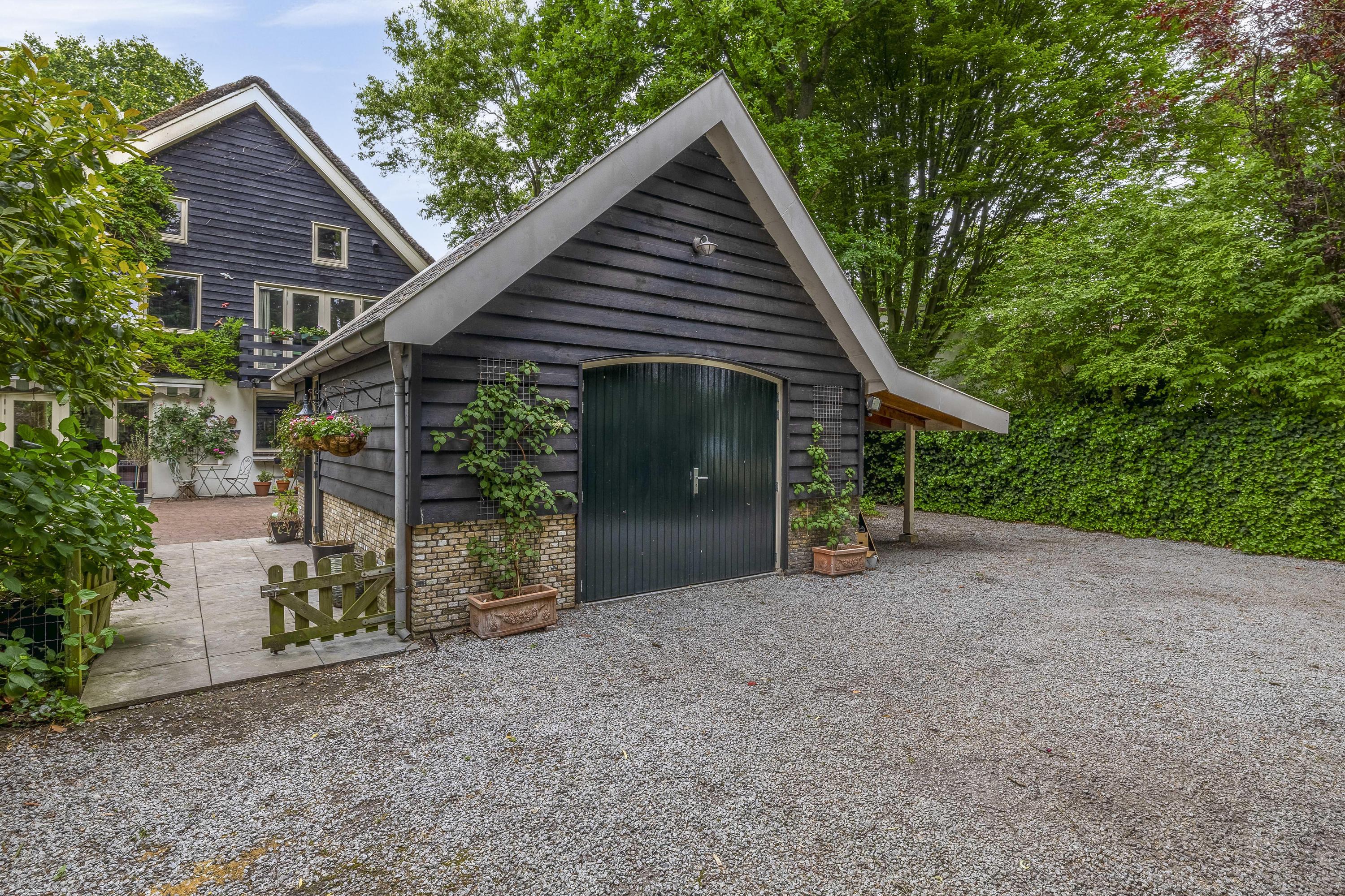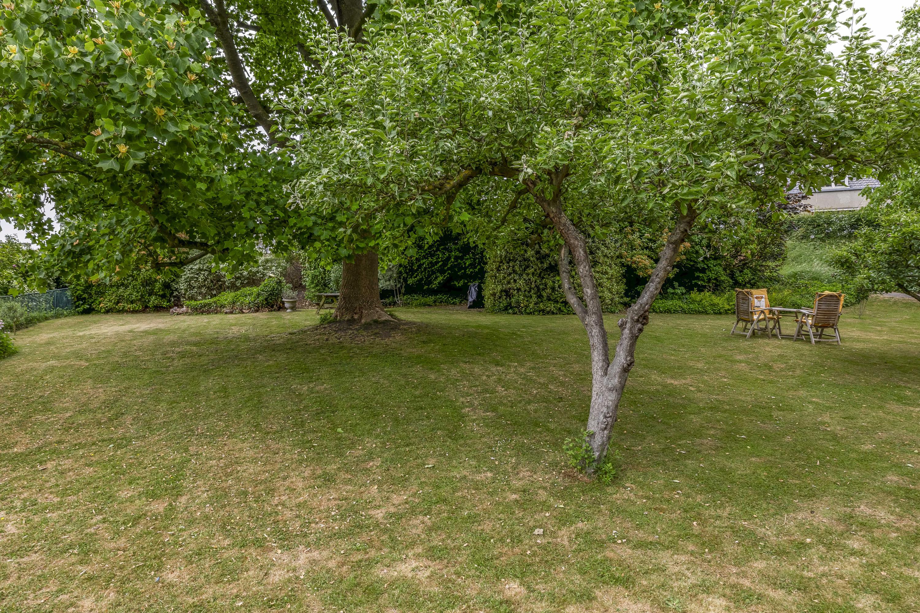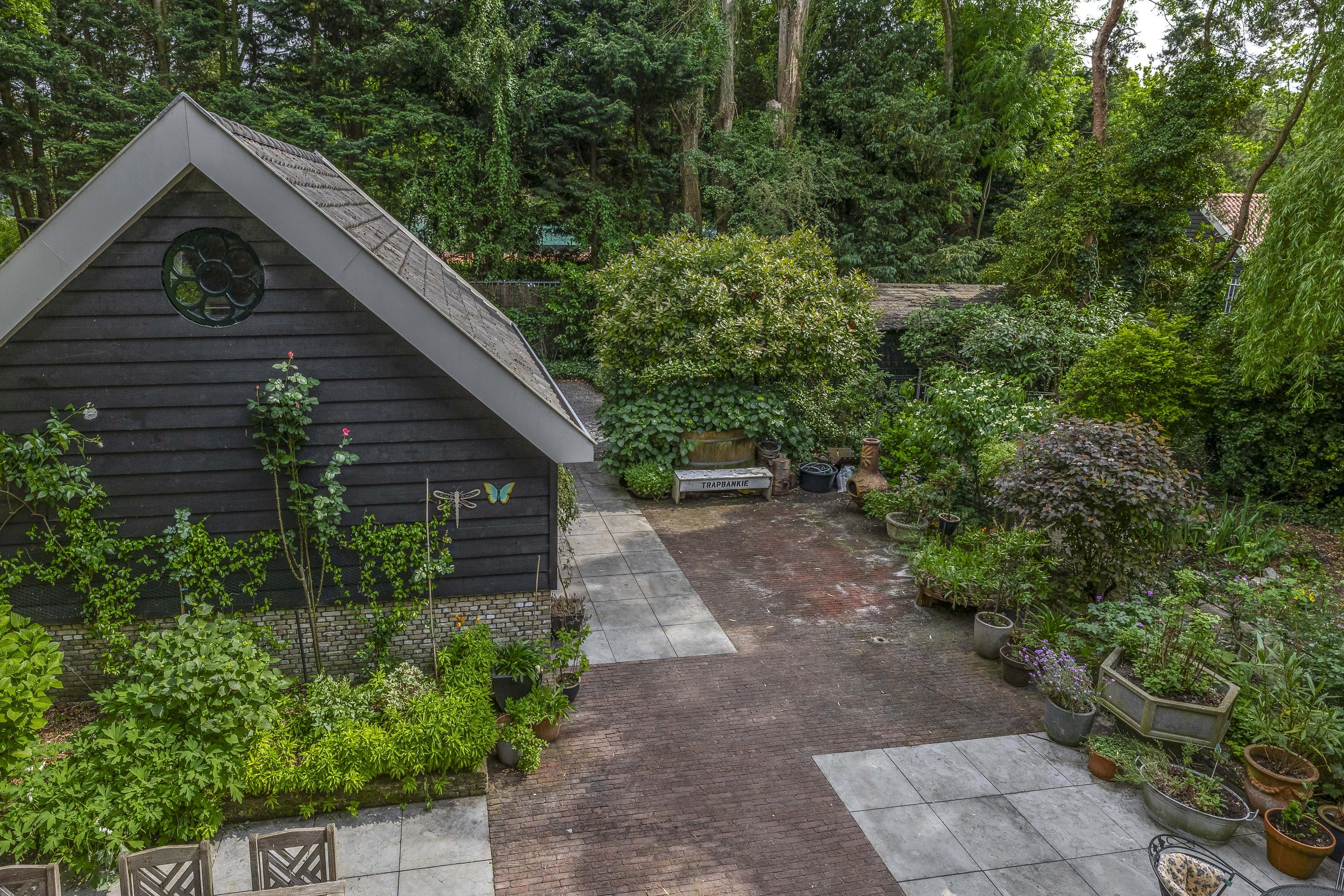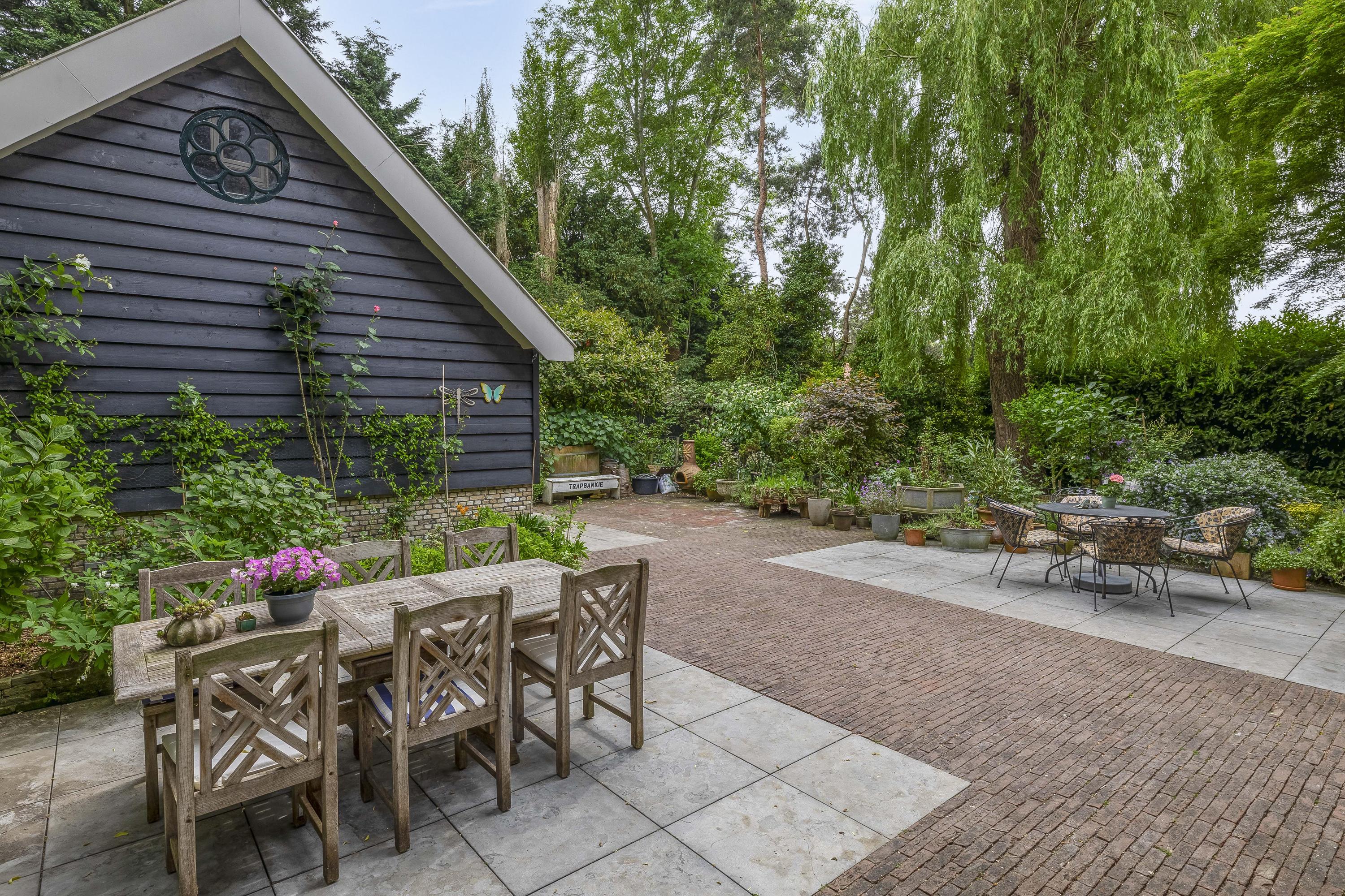 Het perceel van ruim 1.800 m² biedt volledige privacy en heeft rondom volwassen beplanting, een boomgaardachtig gazon en meerdere terrassen. Het zonneterras ligt op het zuiden en is aangelegd op een betonnen plaat van de voormalige schuur. De huidige garage is in 2008 gebouwd, goed geïsoleerd, verwarmd en heeft een grote bergvliering.