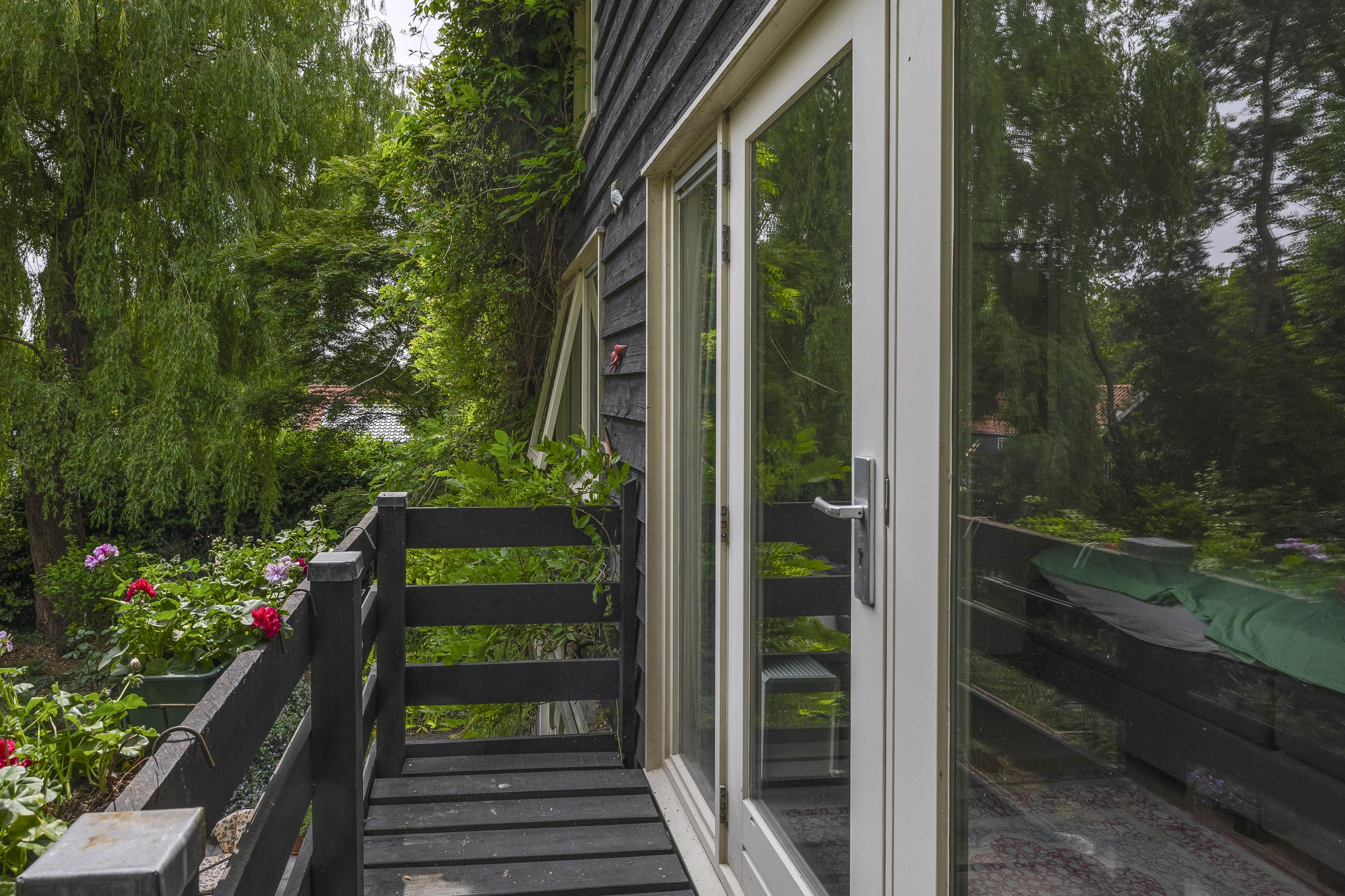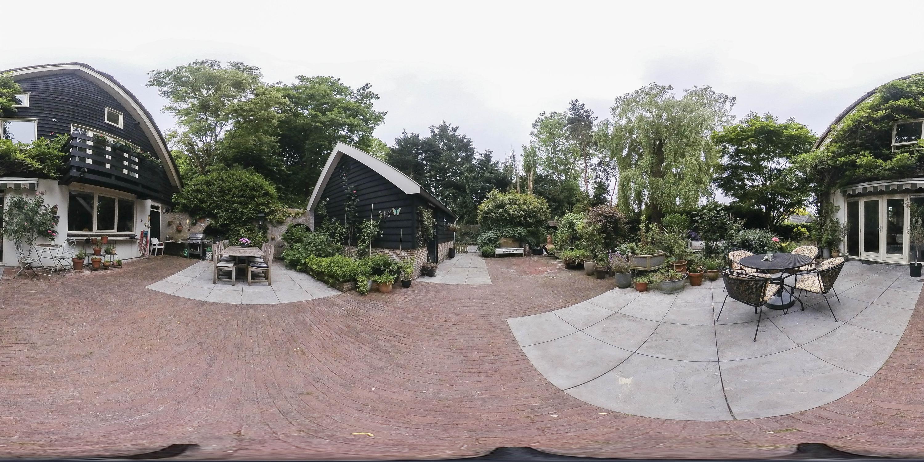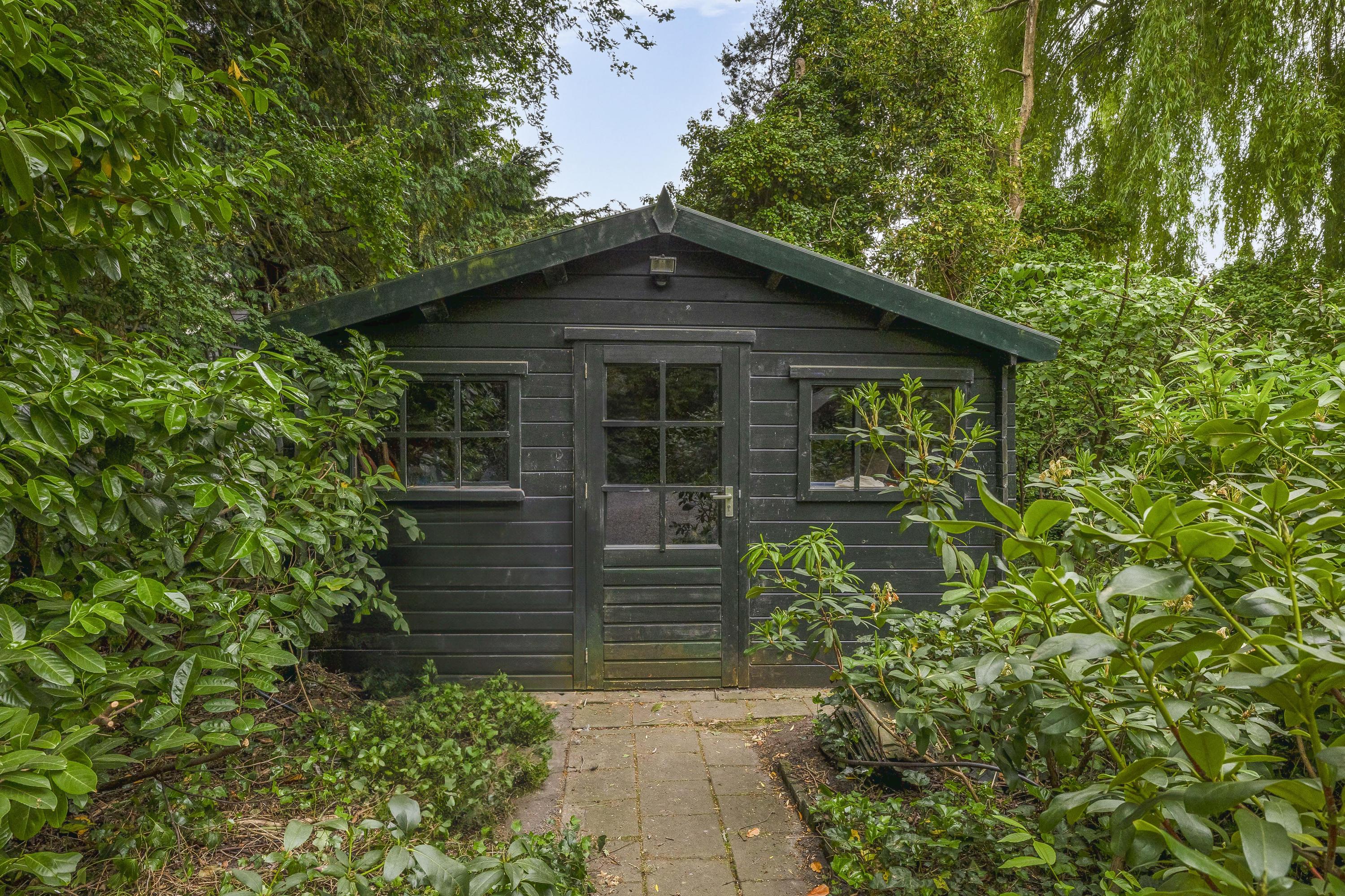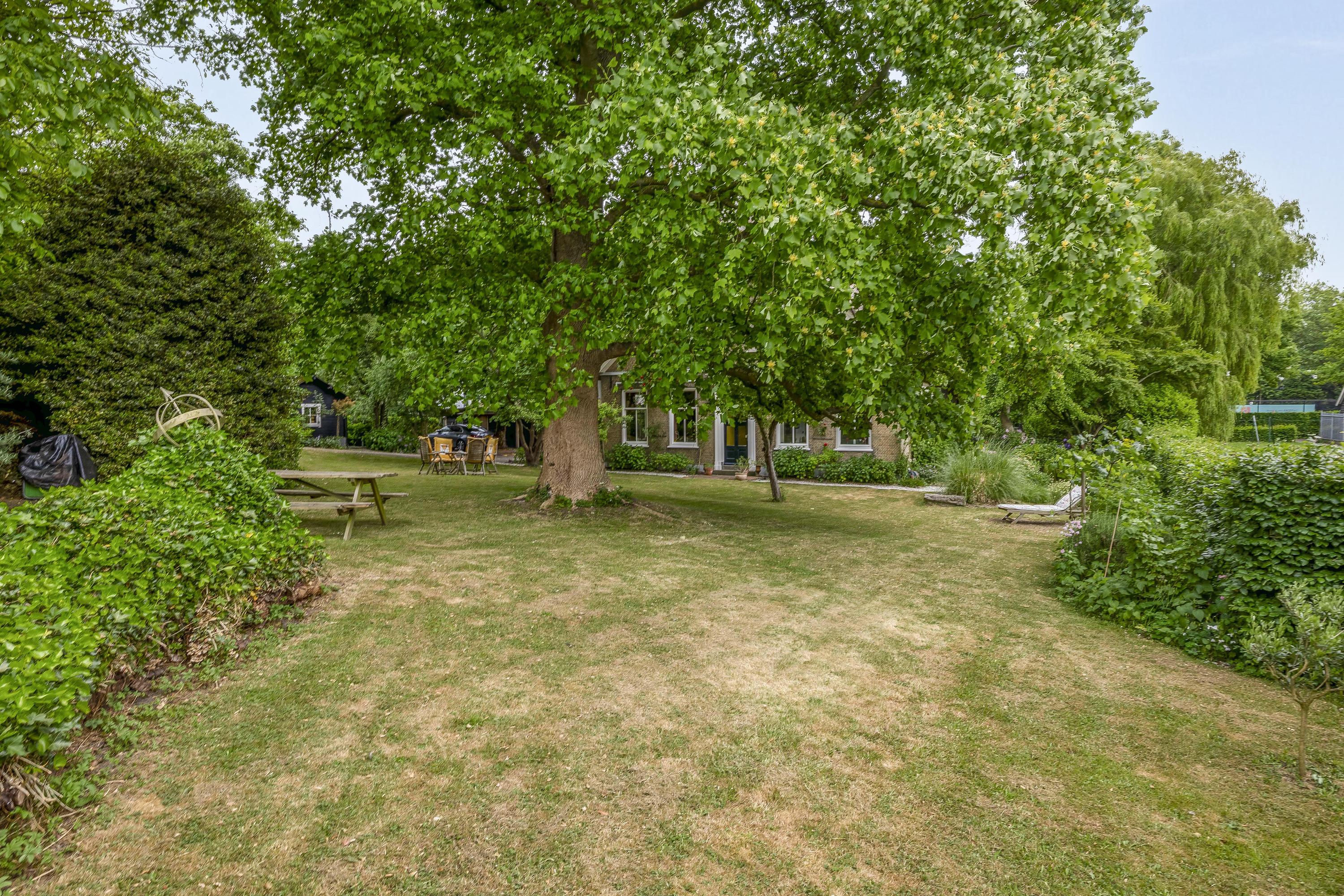 Het perceel van ruim 1.800 m² biedt volledige privacy en heeft rondom volwassen beplanting, een boomgaardachtig gazon en meerdere terrassen. Het zonneterras ligt op het zuiden en is aangelegd op een betonnen plaat van de voormalige schuur. De huidige garage is in 2008 gebouwd, goed geïsoleerd, verwarmd en heeft een grote bergvliering.