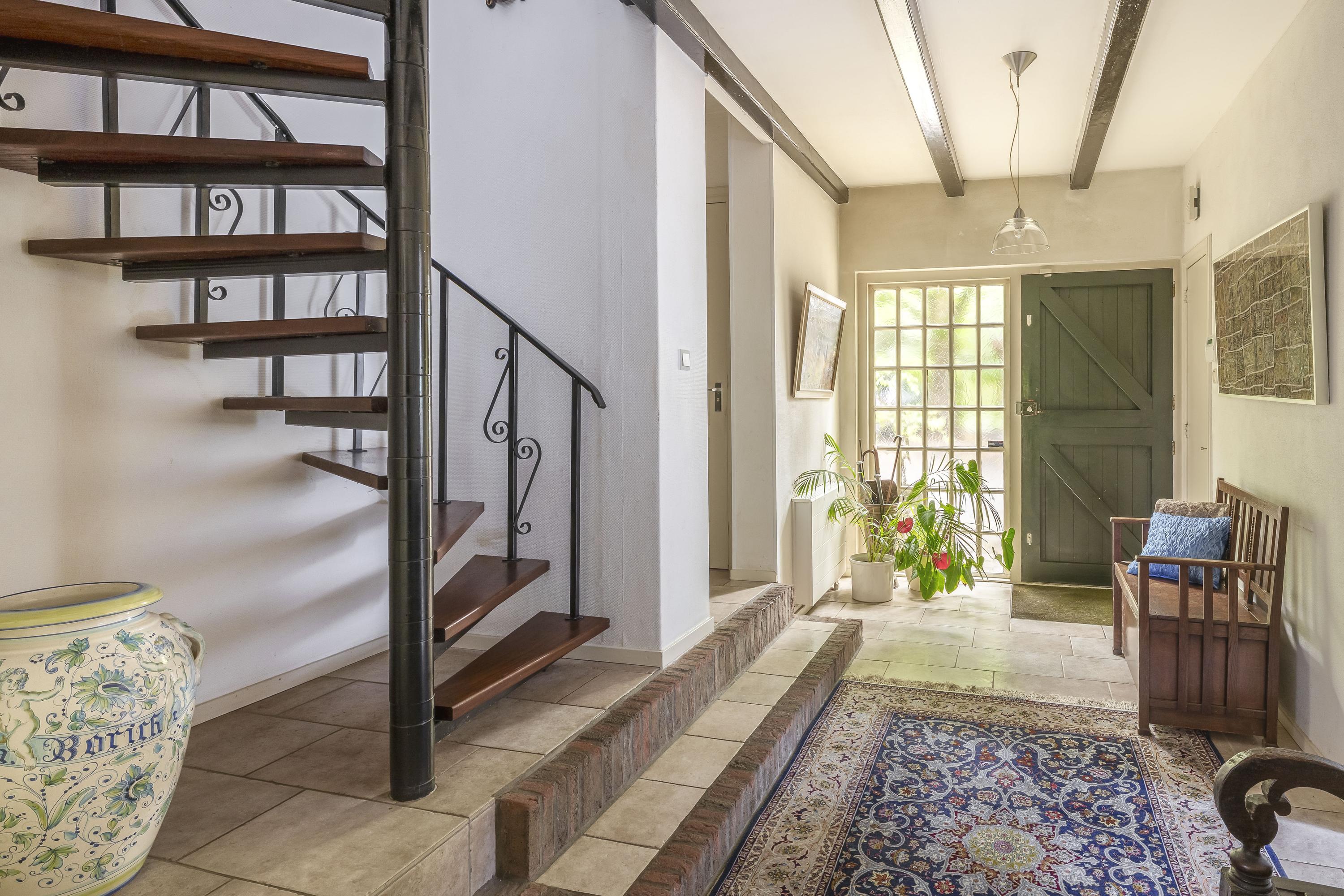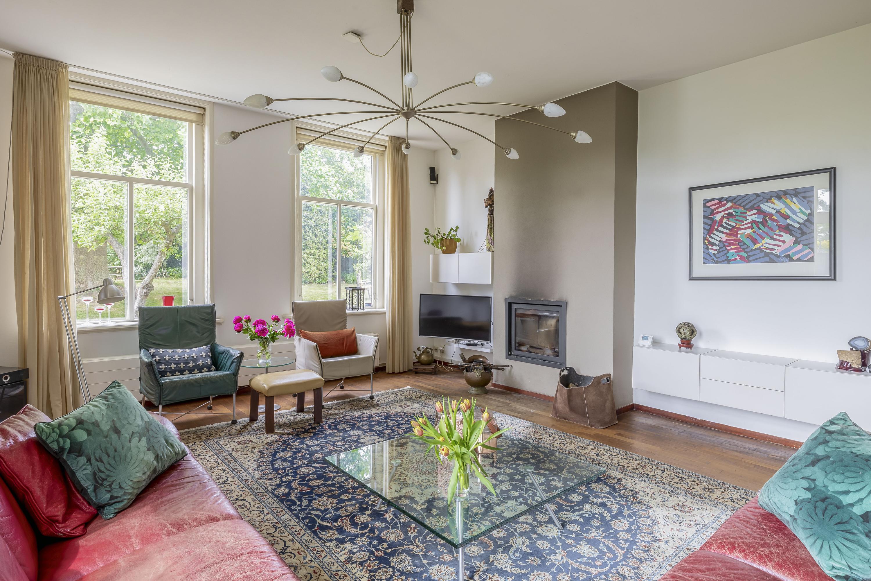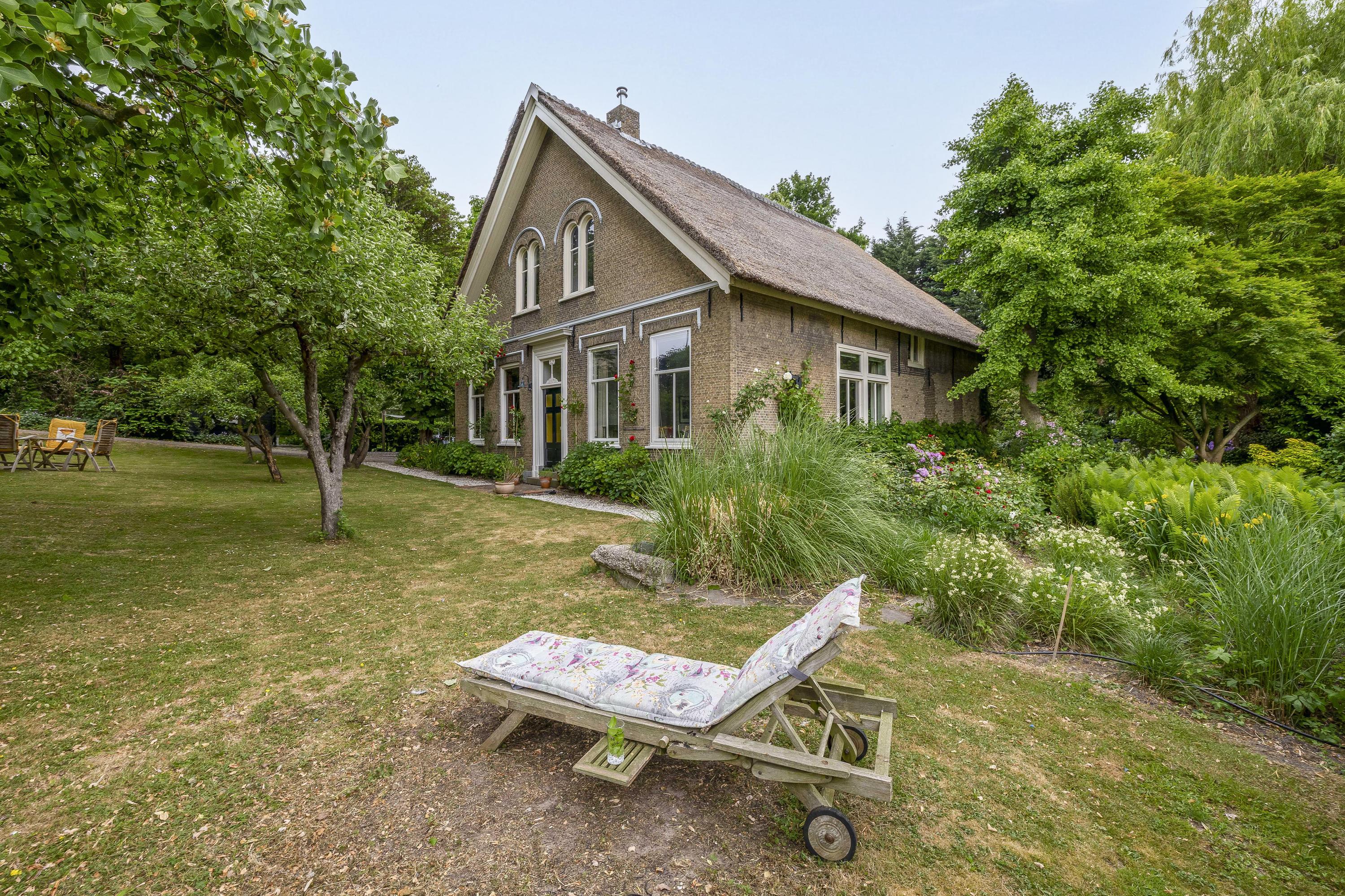 De boerderij heeft een charmante zijentree en een aparte entree aan de voorzijde. Vanuit de hal met garderobe en toilet loop je door naar de werkkamer – een fijne plek met veel daglicht, originele schuiframen en vloerbedekking. De royale woonkamer is voorzien van een sfeervolle open haard (een bakkachel met vernieuwd rookkanaal) en staat in open verbinding met het eetgedeelte, waar dubbele openslaande deuren toegang geven tot de zonnige tuin.