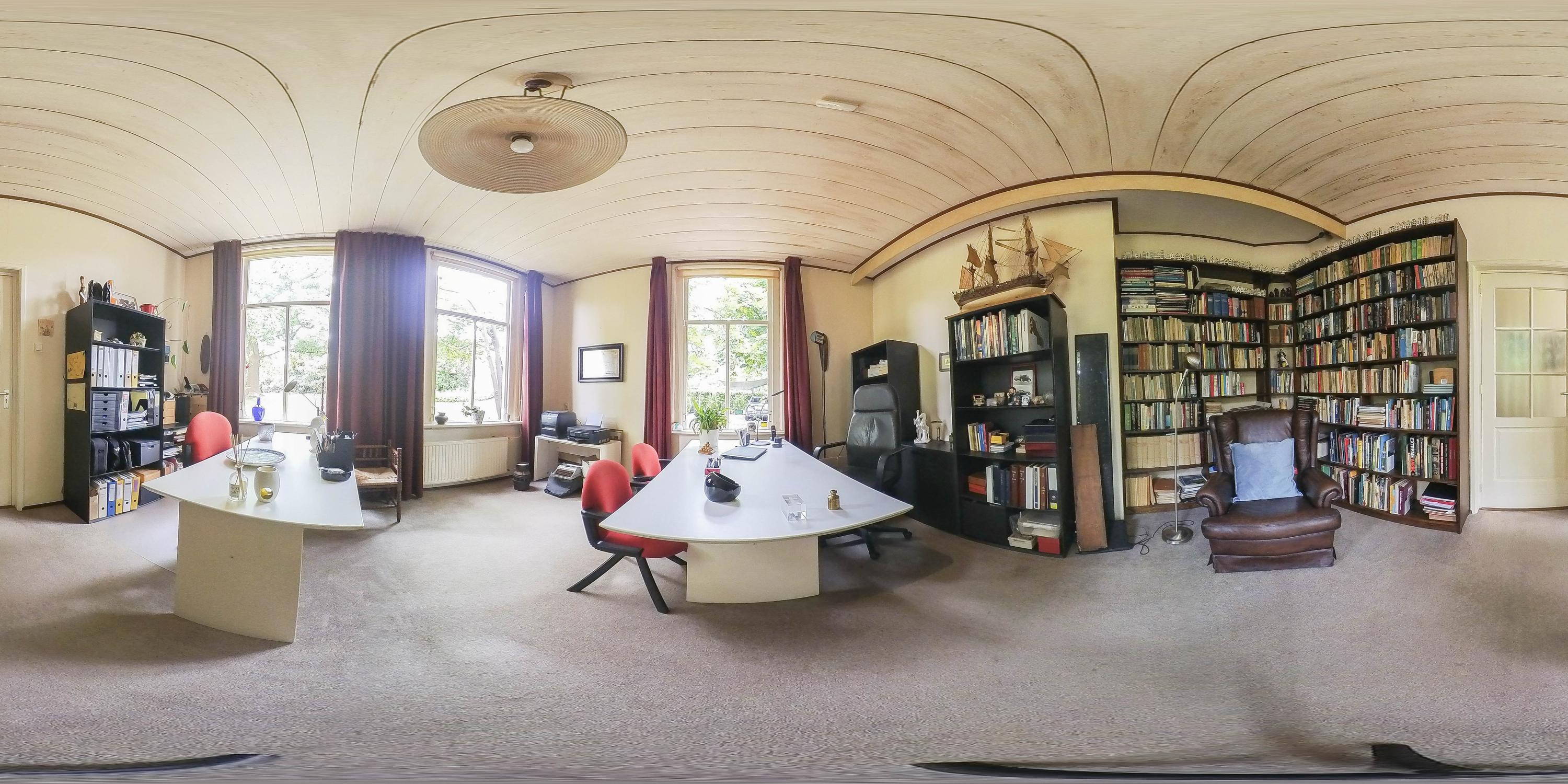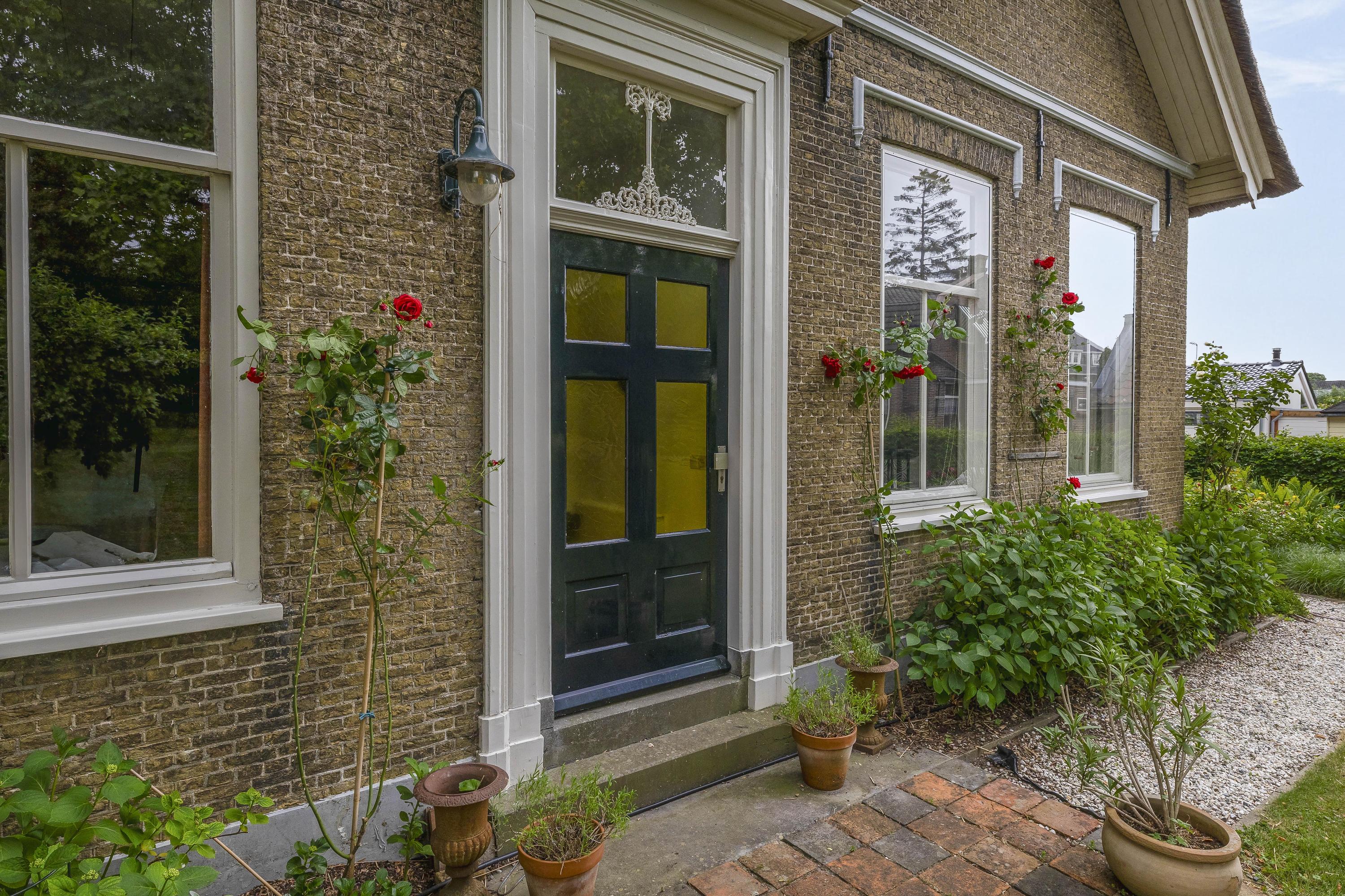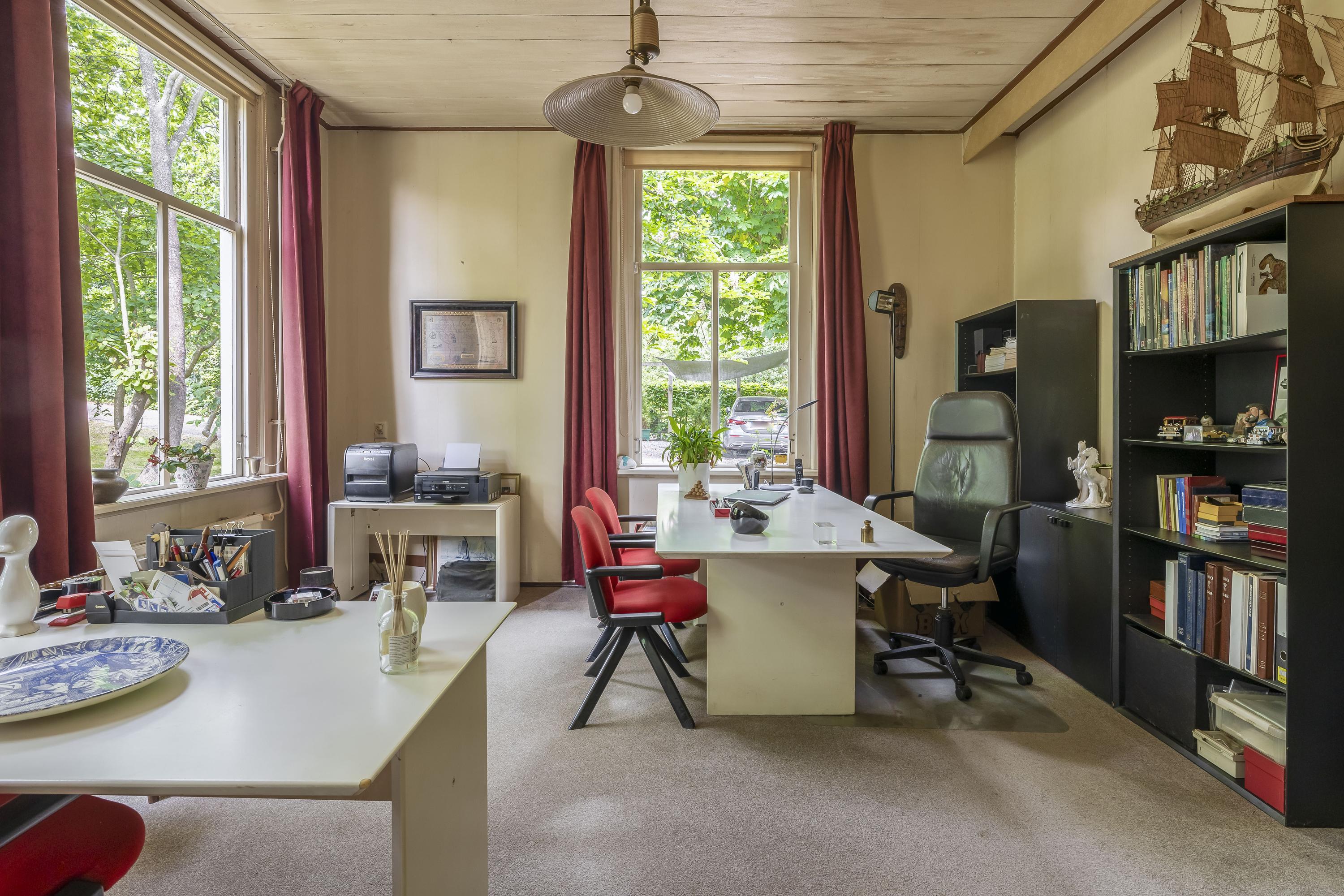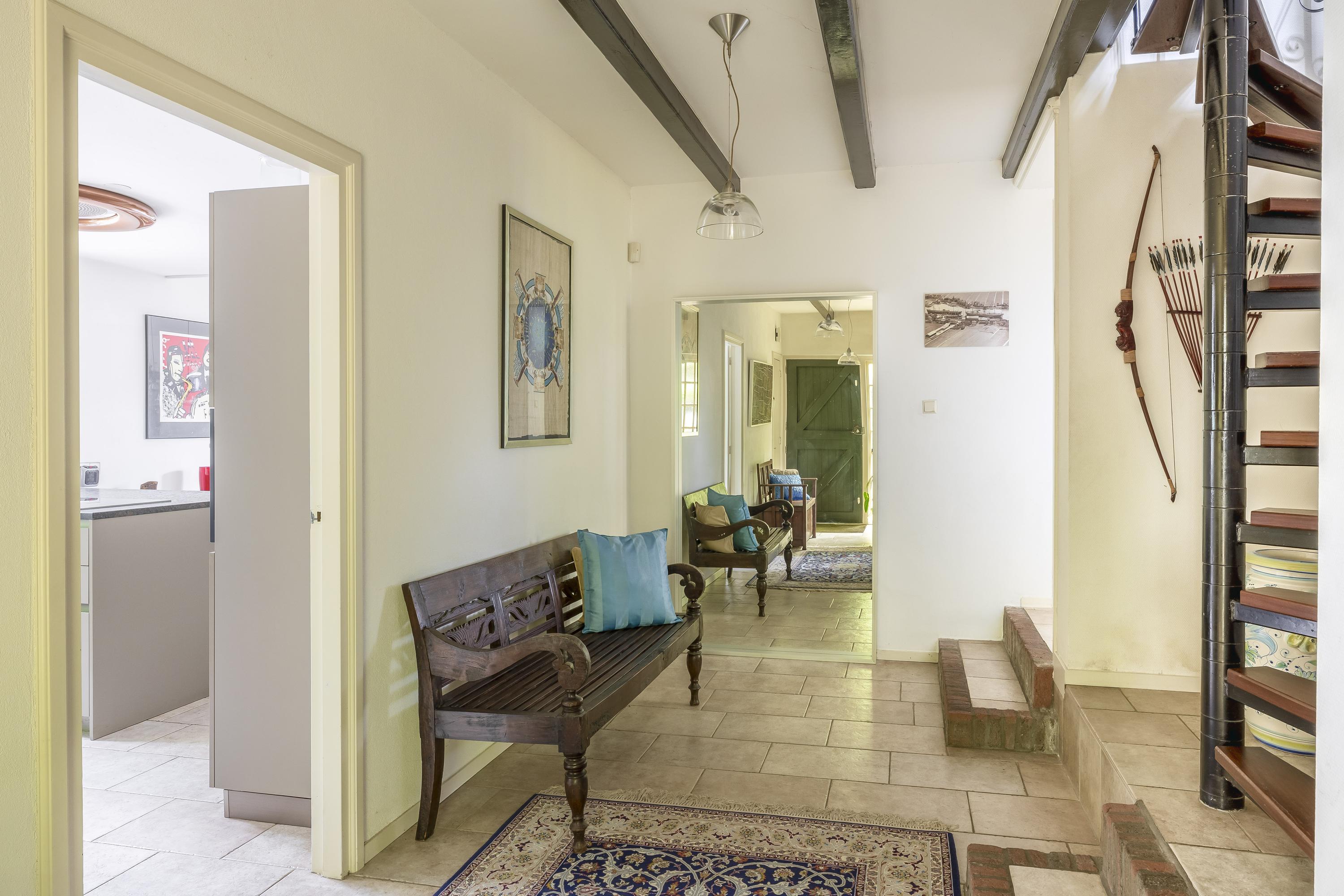 De boerderij heeft een charmante zijentree en een aparte entree aan de voorzijde. Vanuit de hal met garderobe en toilet loop je door naar de werkkamer – een fijne plek met veel daglicht, originele schuiframen en vloerbedekking. De royale woonkamer is voorzien van een sfeervolle open haard (een bakkachel met vernieuwd rookkanaal) en staat in open verbinding met het eetgedeelte, waar dubbele openslaande deuren toegang geven tot de zonnige tuin.