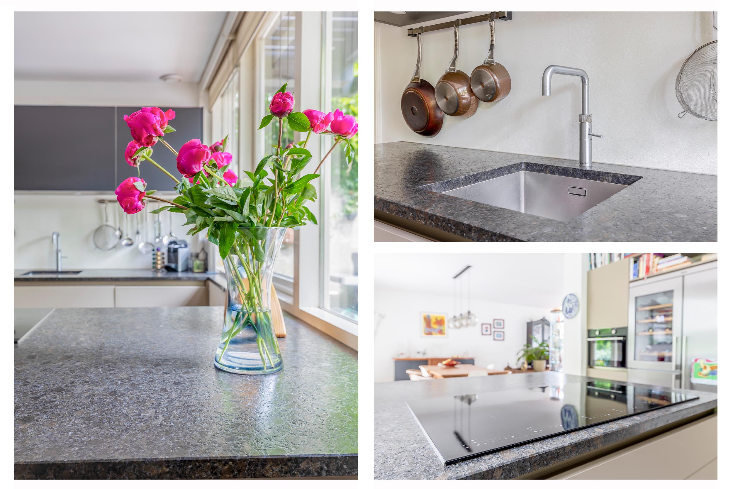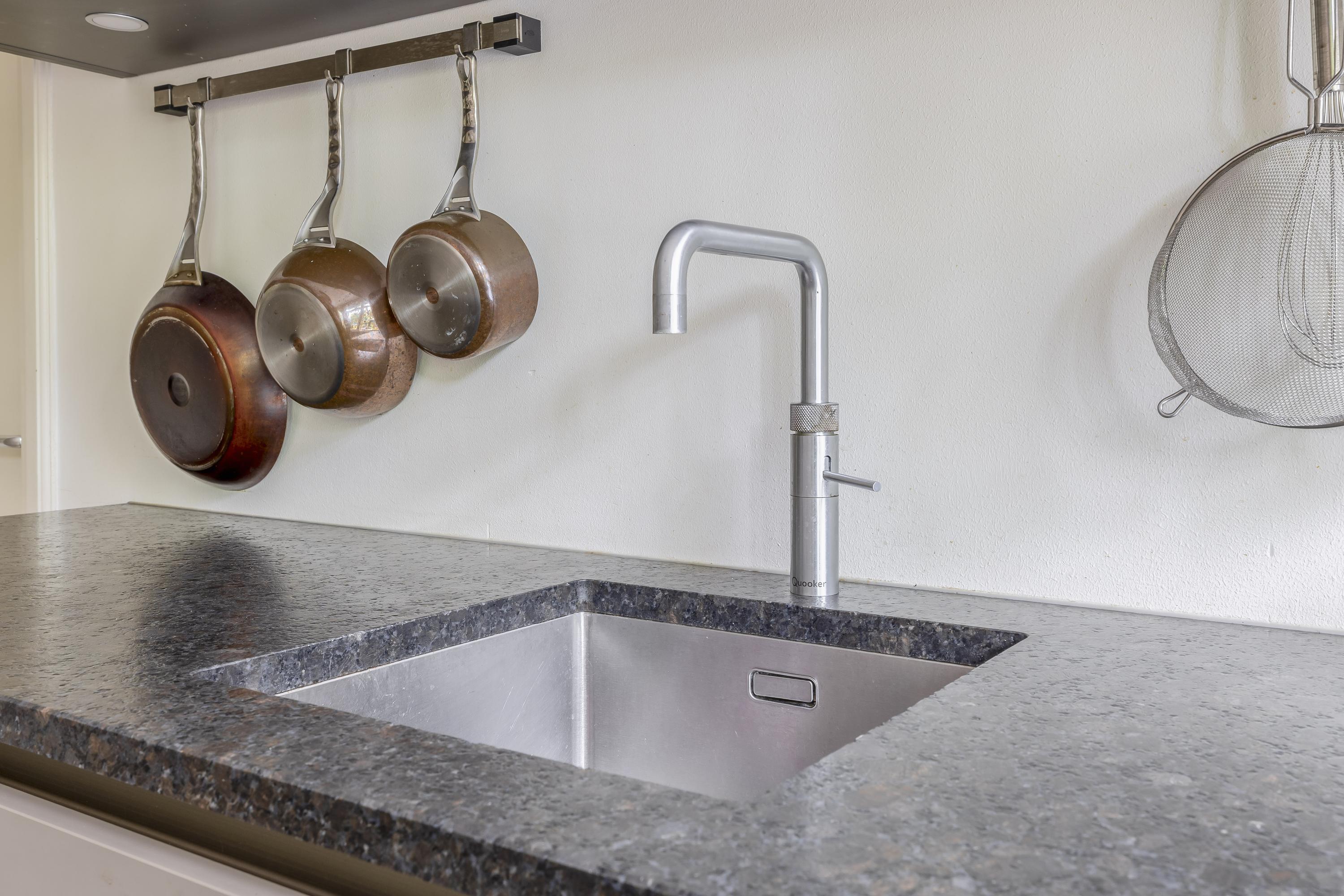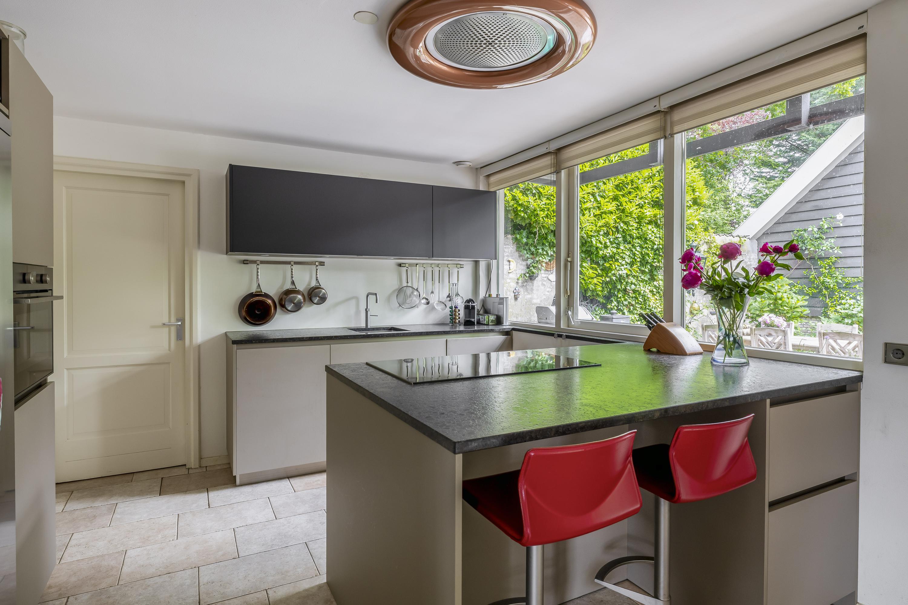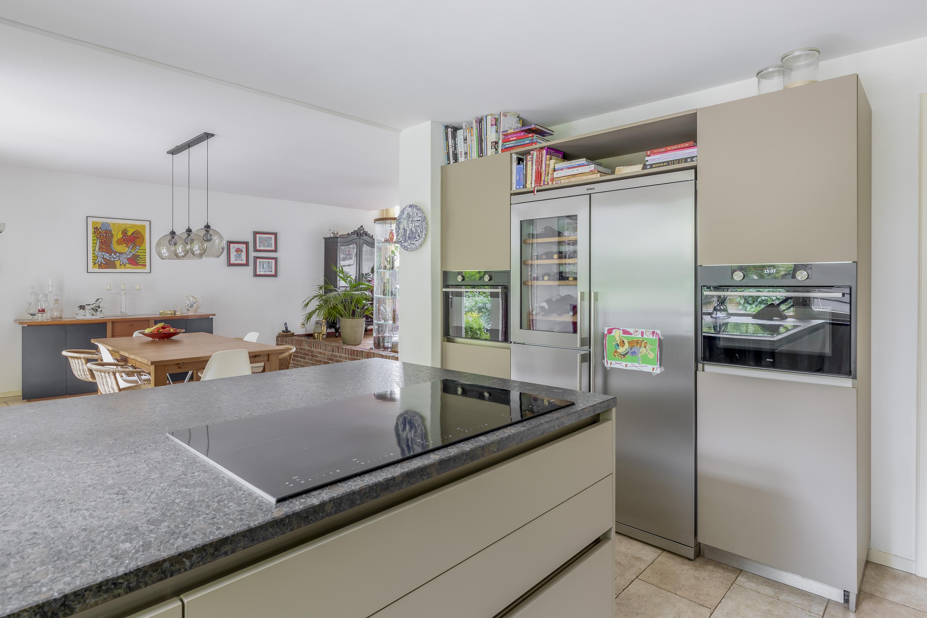 Achterin in het huis ligt de ruime leefkeuken, die ongeveer acht jaar geleden is vernieuwd. Een luxe opstelling en moderne uitstraling met stenen blad, kookeiland met inductiekookplaat en afzuigkap, combioven, stoomoven, wijnklimaatkast, koelkast, vriezer en vaatwasser zorgen ervoor dat elke kookliefhebber hier z’n hart kan ophalen. Vanuit de keuken kijk je uit op het terras en de groene tuin rondom. In de aangrenzende bijkeuken vind je onder meer de wasmachine- en drogeraansluiting, extra bergruimte en de cv-installatie (ca. 2019).