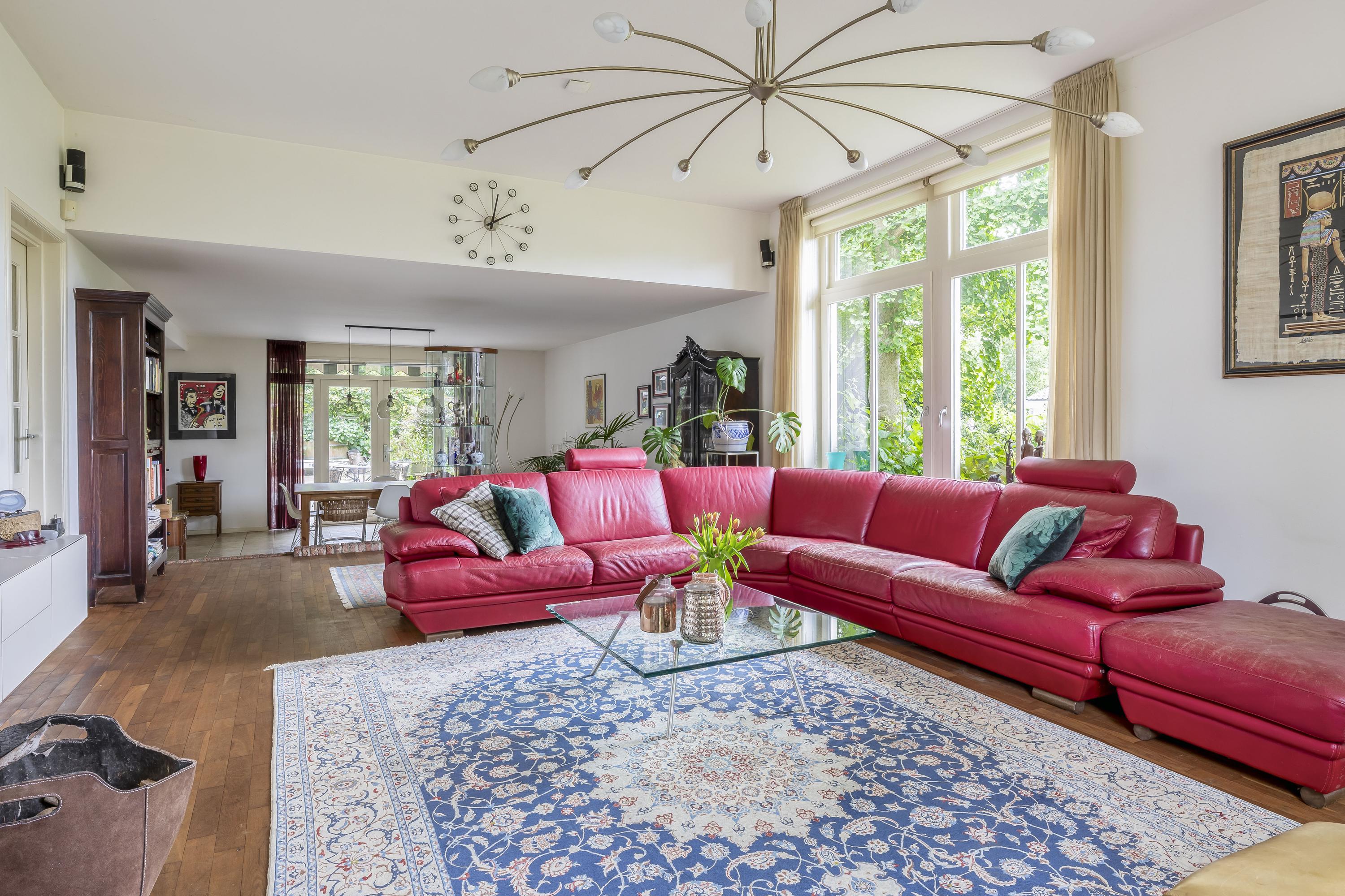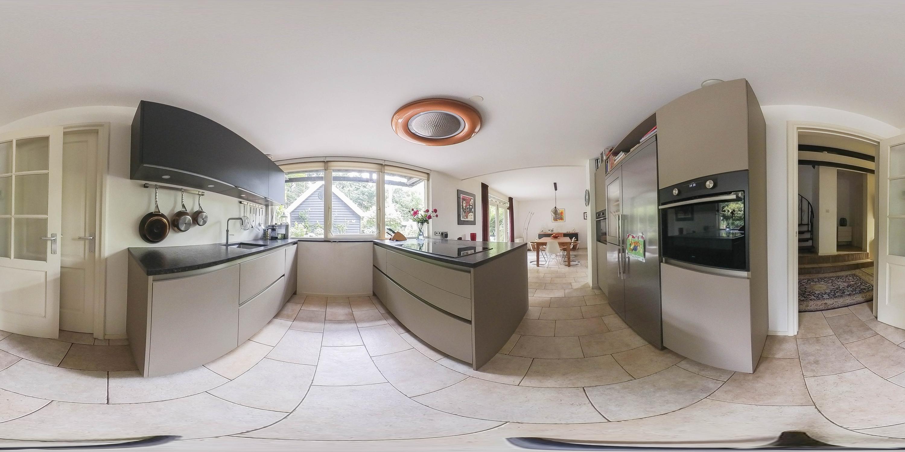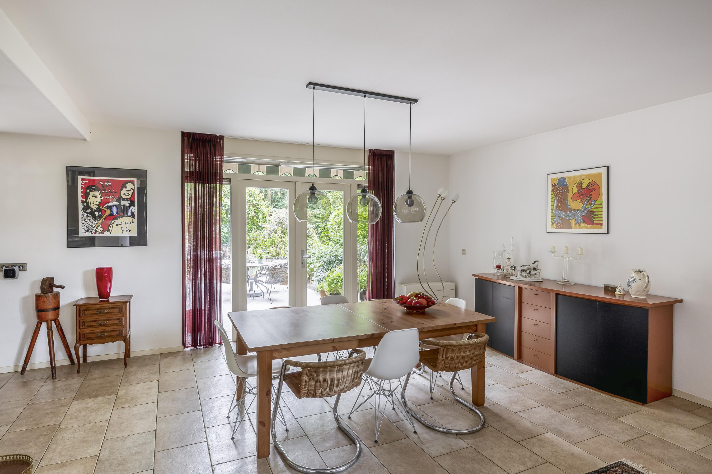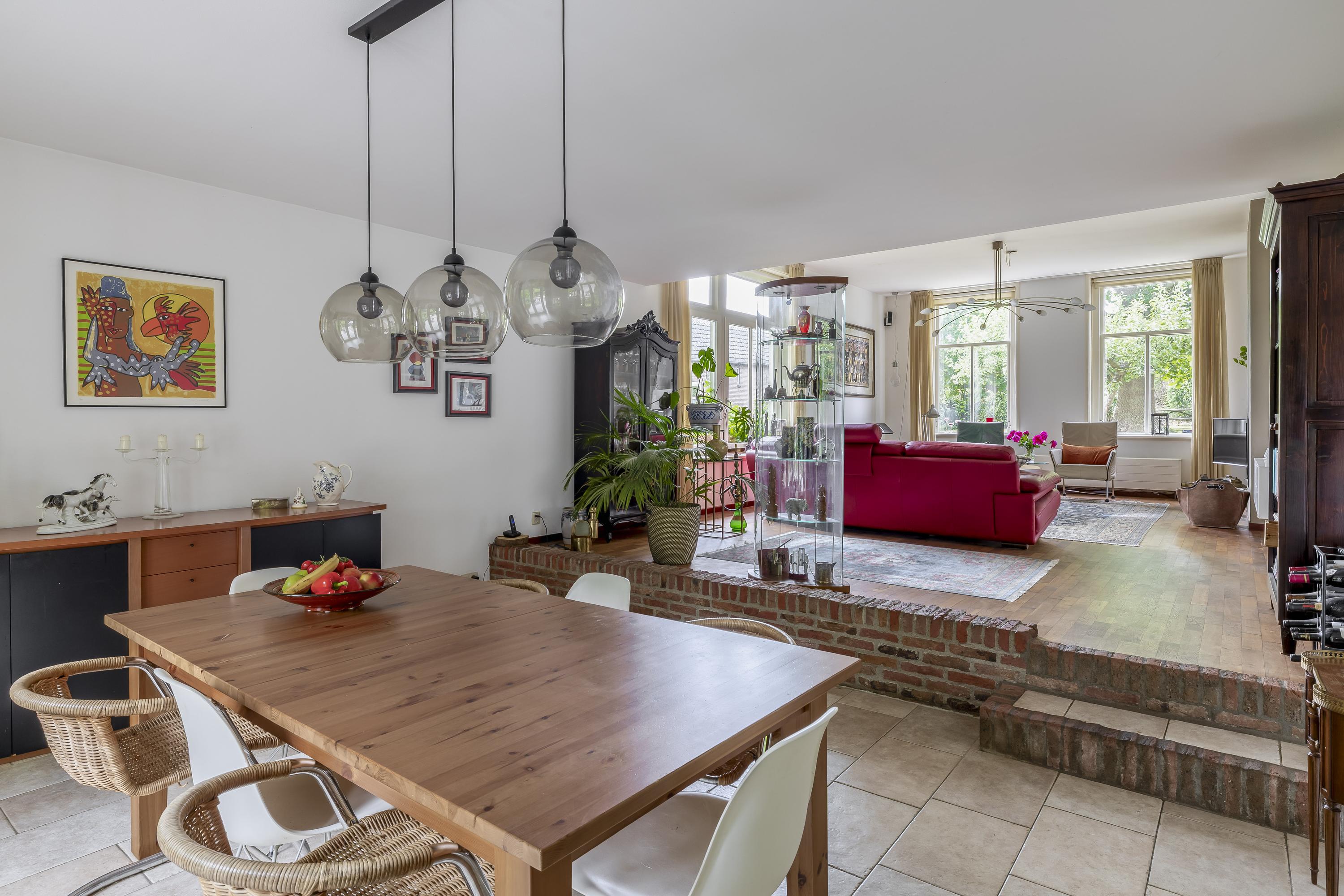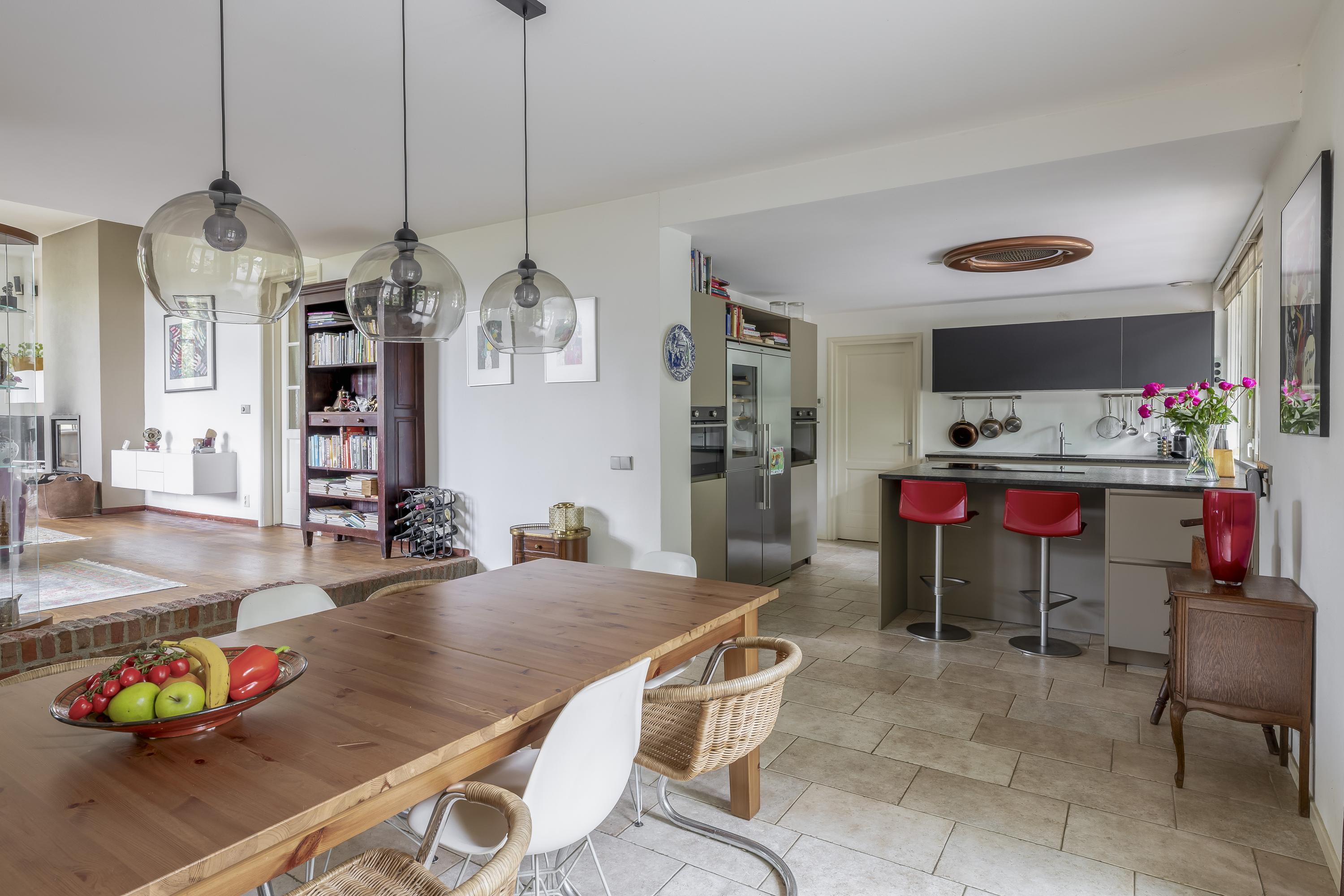 Achterin in het huis ligt de ruime leefkeuken, die ongeveer acht jaar geleden is vernieuwd. Een luxe opstelling en moderne uitstraling met stenen blad, kookeiland met inductiekookplaat en afzuigkap, combioven, stoomoven, wijnklimaatkast, koelkast, vriezer en vaatwasser zorgen ervoor dat elke kookliefhebber hier z’n hart kan ophalen. Vanuit de keuken kijk je uit op het terras en de groene tuin rondom. In de aangrenzende bijkeuken vind je onder meer de wasmachine- en drogeraansluiting, extra bergruimte en de cv-installatie (ca. 2019).