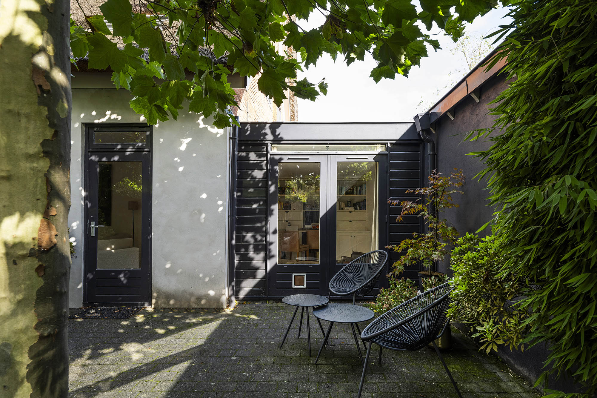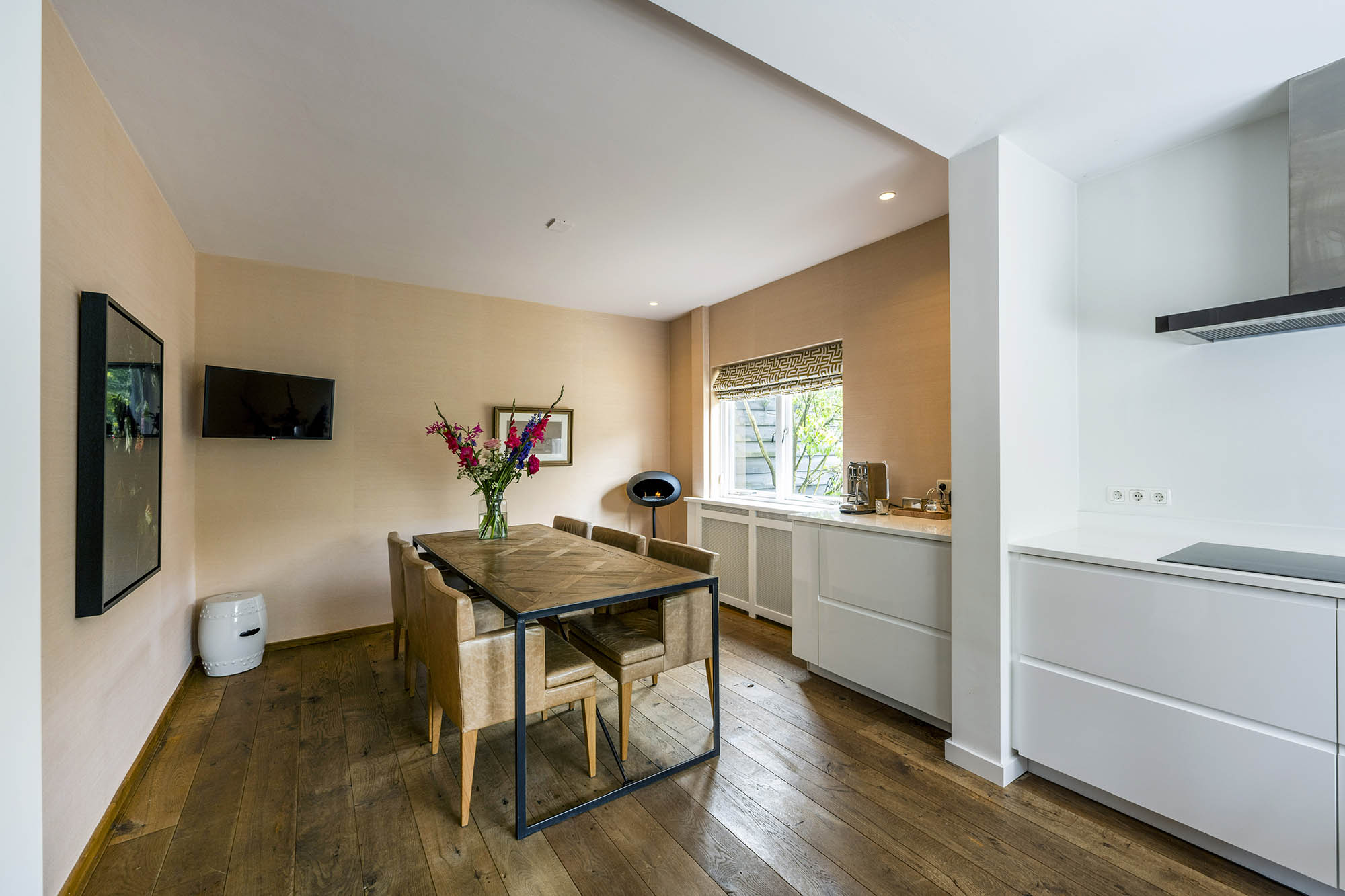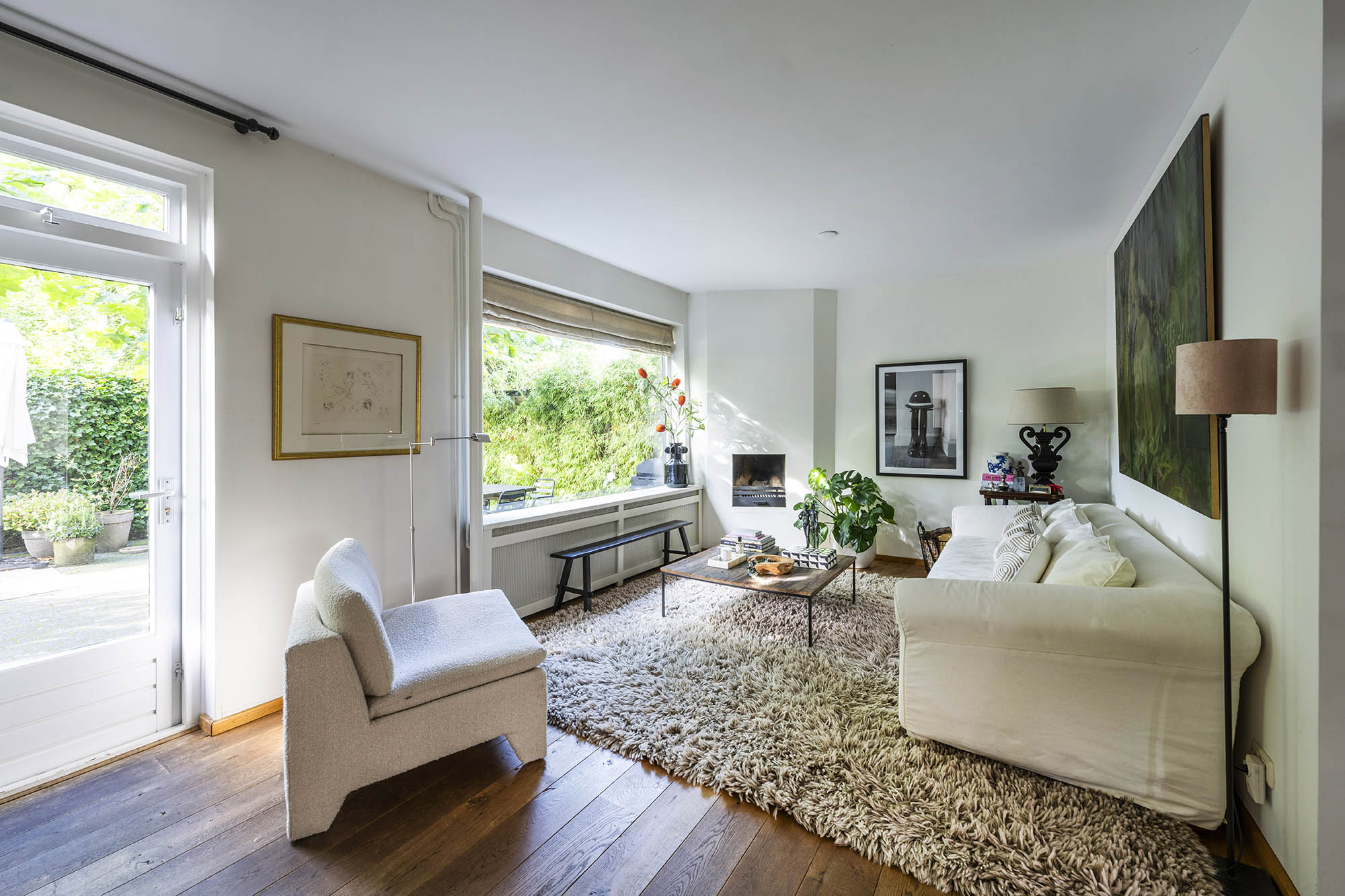 Binnen biedt de woning verrassend veel ruimte en een prettige indeling. De royale woonkamer met open haard strekt zich uit over de gehele breedte en beschikt over een gezellige werkhoek en openslaande deur naar de zonnige tuin met dakplatanen – een plek die direct een vakantiegevoel oproept. De moderne, volledig uitgeruste woonkeuken en de aparte tv-kamer maken de begane grond compleet.