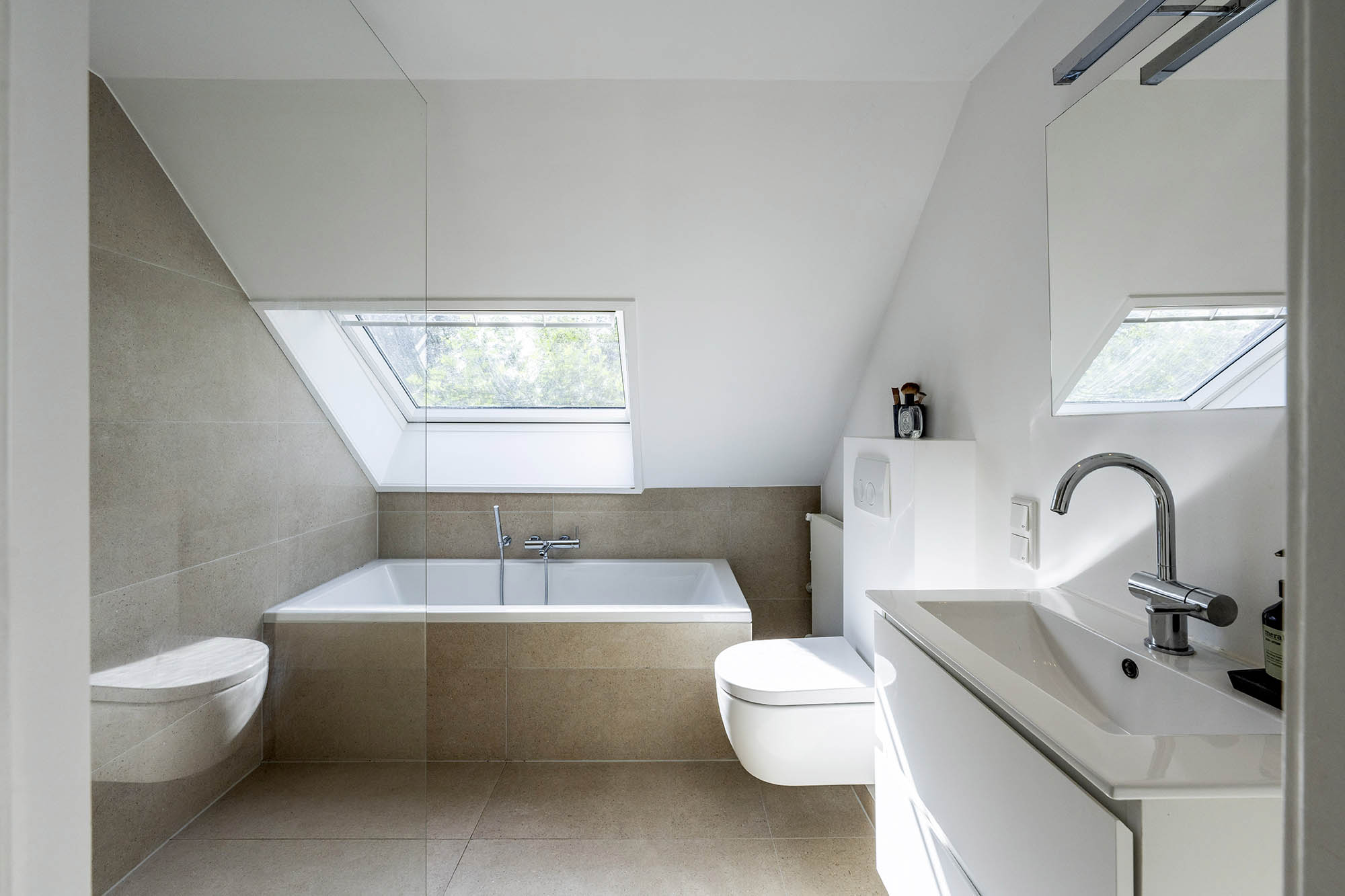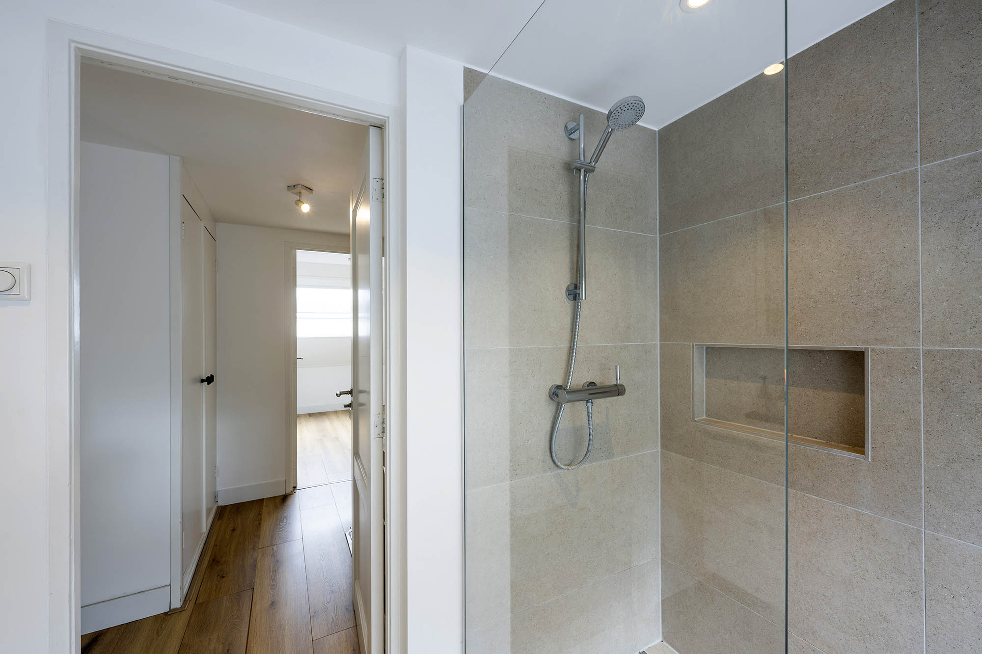 Op de eerste verdieping bevinden zich drie ruime slaapkamers waarvan één wordt gebruikt als waskamer, een moderne badkamer met bad, wastafelmeubel en toilet. Via een vaste trap bereik je de tweede verdieping, waar de ouderslaapkamer met vaste kasten en eigen badkamer een heerlijke privéverdieping vormt.