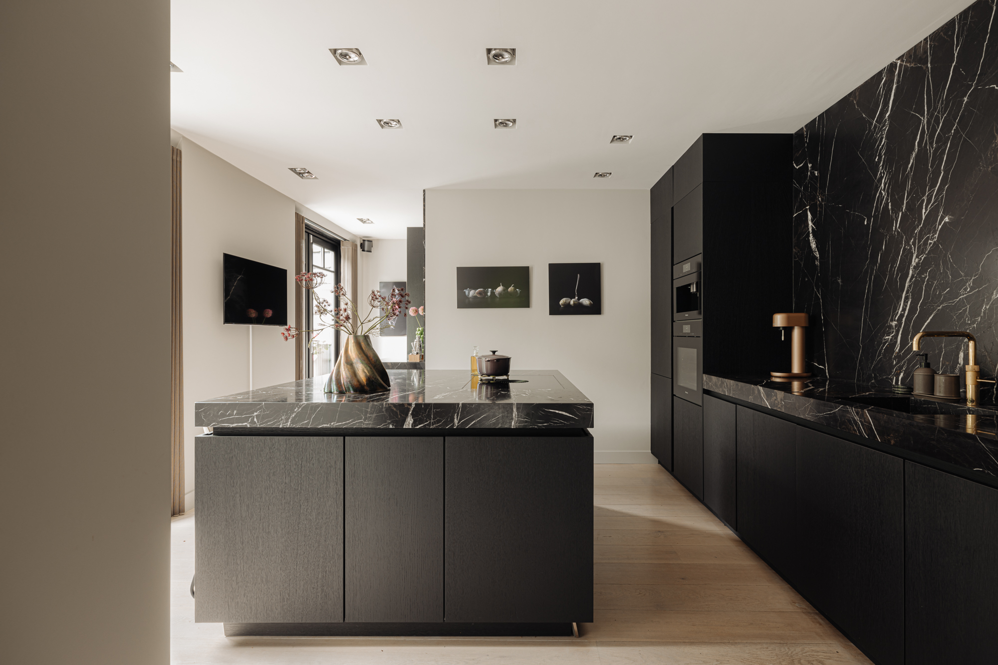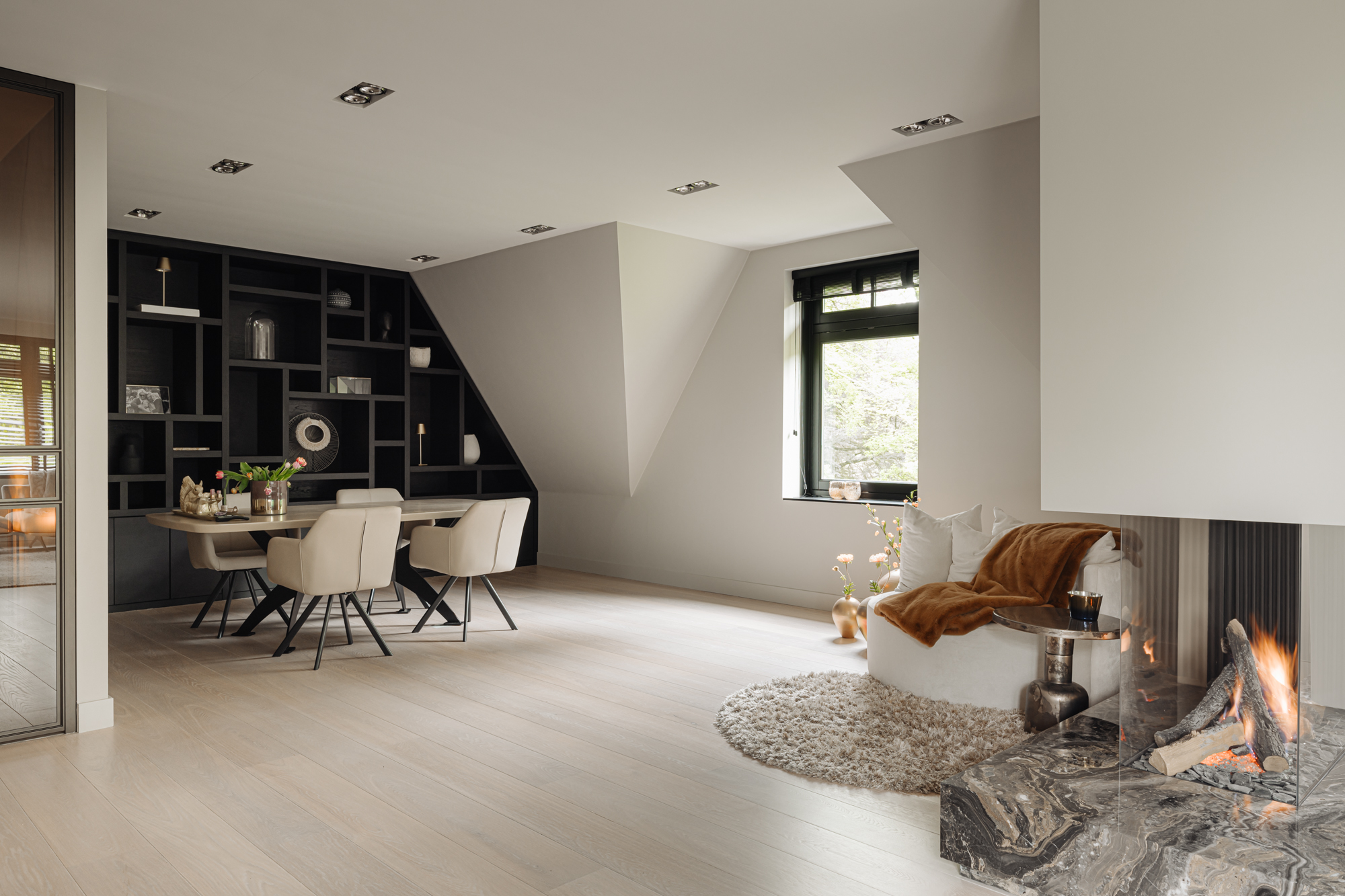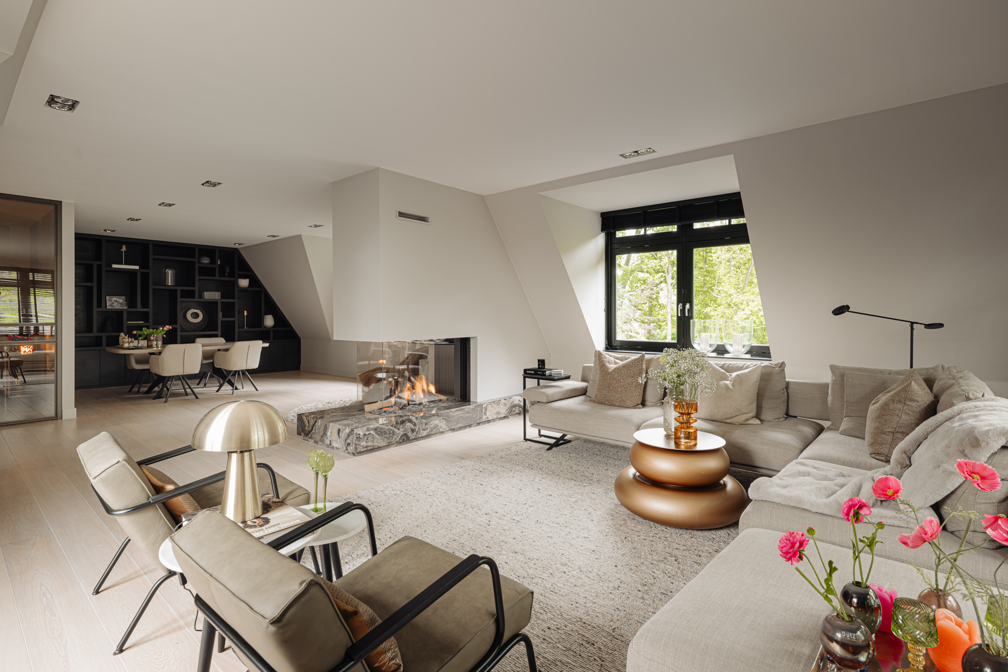 Via de dubbele openslaande deuren, volledig op maat gemaakt en uitgevoerd in brons, betreedt u de living van dit penthouse. Direct valt het licht, dat via de openslaande deuren vanaf het terras de woonkamer binnenkomt, op. De riante zithoek is gericht op de gashaard die is omlijst met marmer. Aan de andere zijde van de gashaard bevindt zich de sfeervolle eethoek. Hier is de prachtige maatwerkkast en het prachtige zicht naar buiten een geweldige achtergrond voor lange avonden tafelen met familie en vrienden.