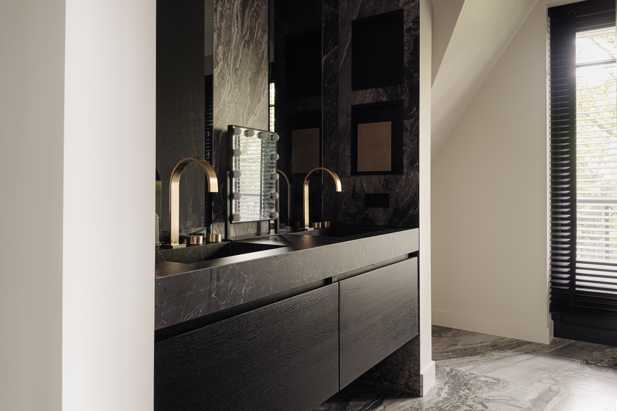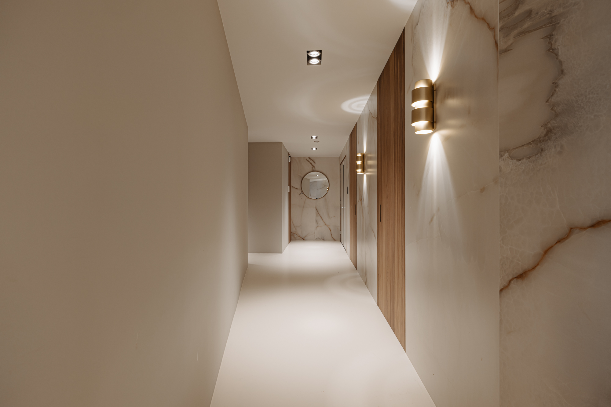 De hal is voorzien van een gietvloer en een prachtig samenspel van Onyx wandbekleding en stucwerk in zachte aardse tinten.