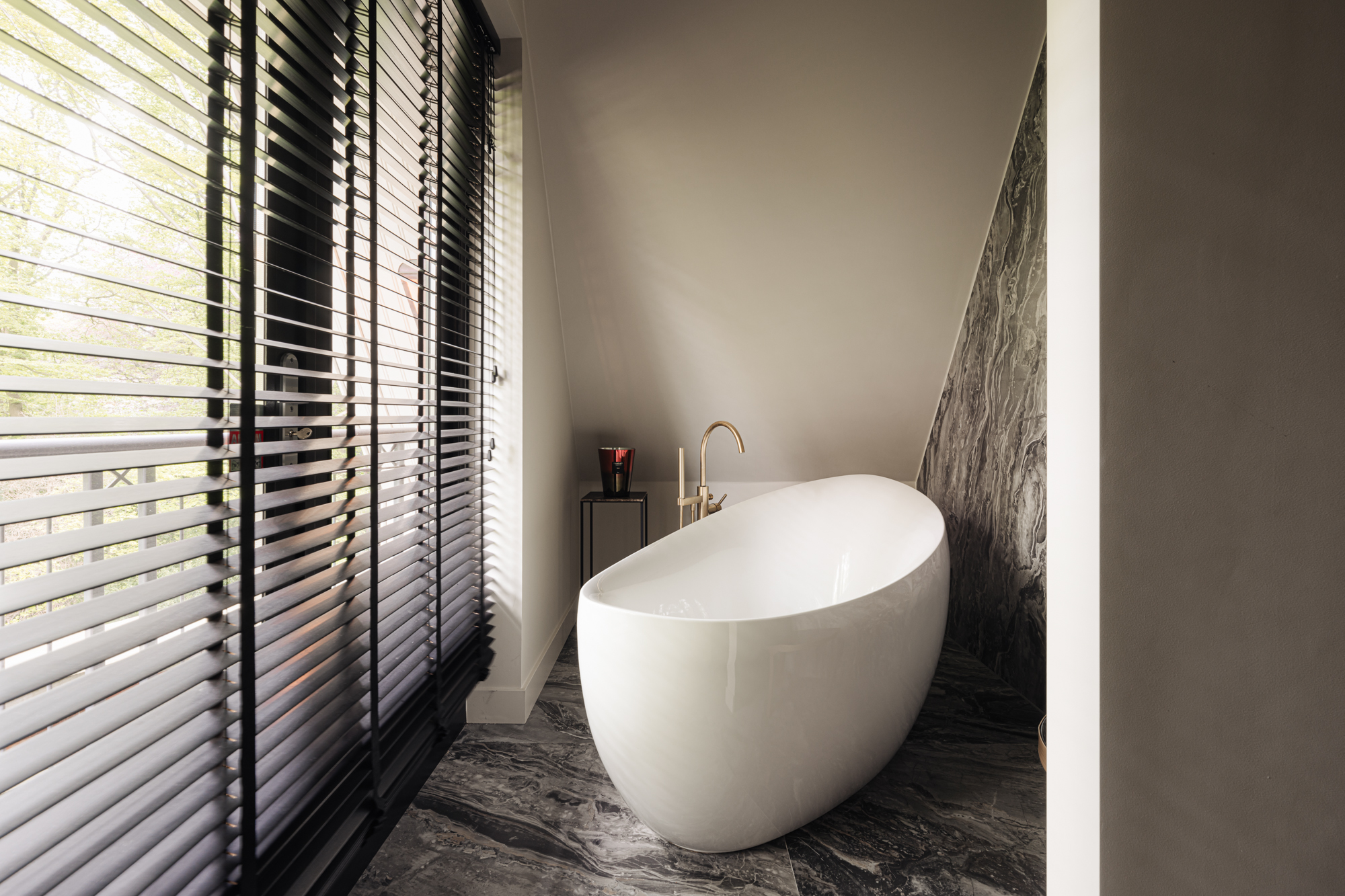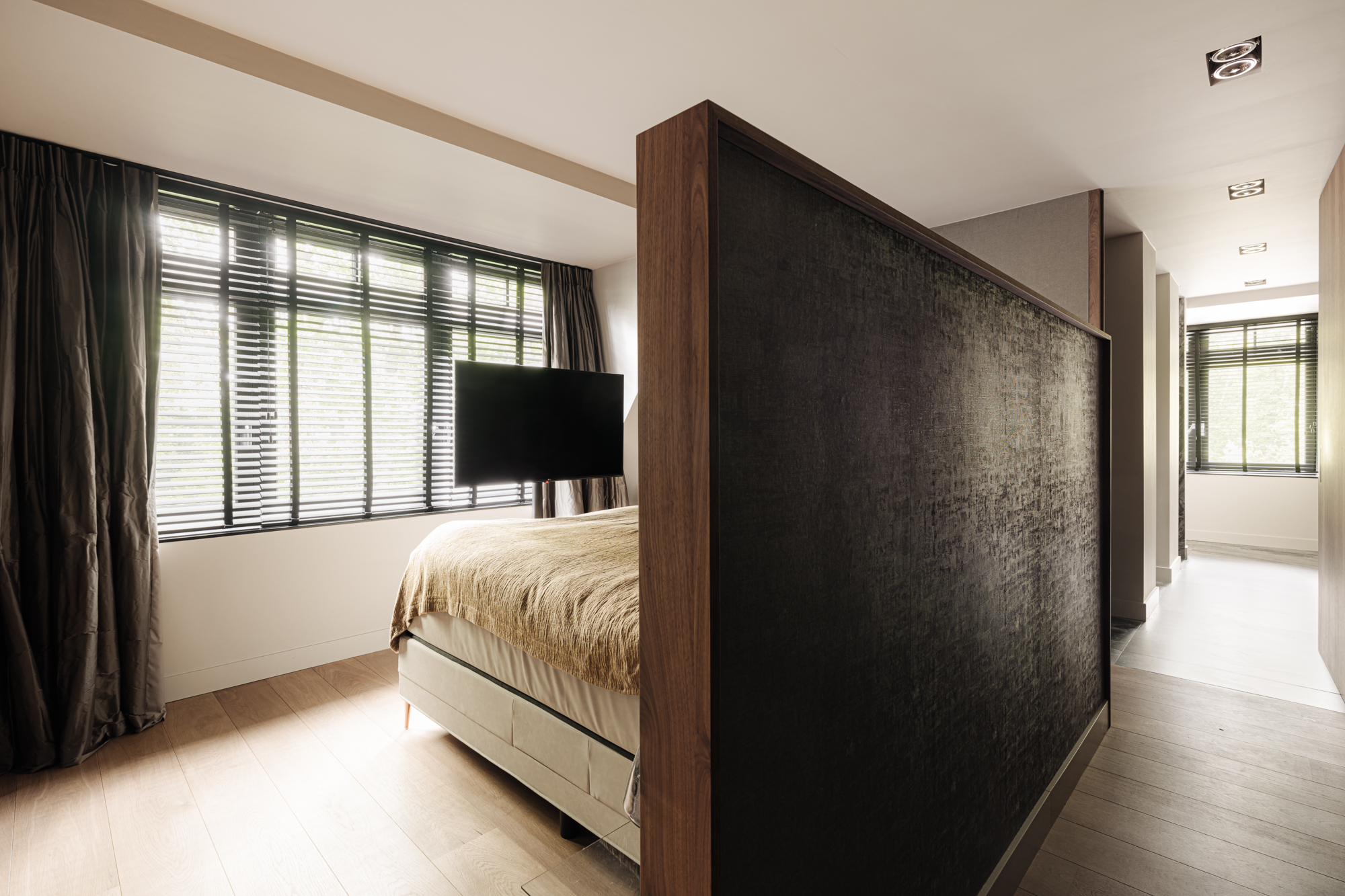 De hoofdslaapkamer is meer dan royaal te noemen met een eigen walk-in closet voorzien van maatwerkkasten, van het Italiaanse merk Porro, en een stijlvolle badkamer voorzien van inloopdouche, dubbele wastafel, toilet met douche functie en ligbad met toegang tot een klein balkon en zicht op prachtige volgroeide bomen. Kortom, de spa kunt u voortaan overslaan.