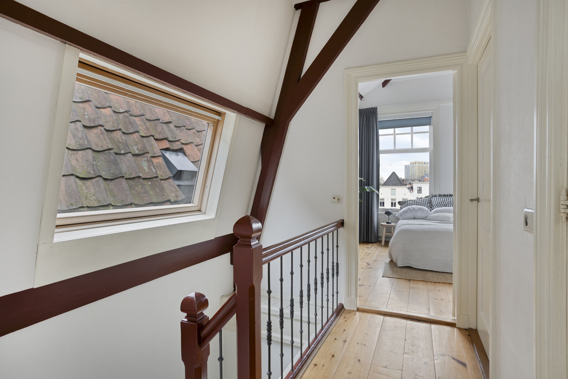 Overloop met trap naar de 2e etage. Voorkamer met hoge balkenplafonds en prachtig uitzicht over het Galgewater. Achterkamer met openslaande deuren naar het dakterras.