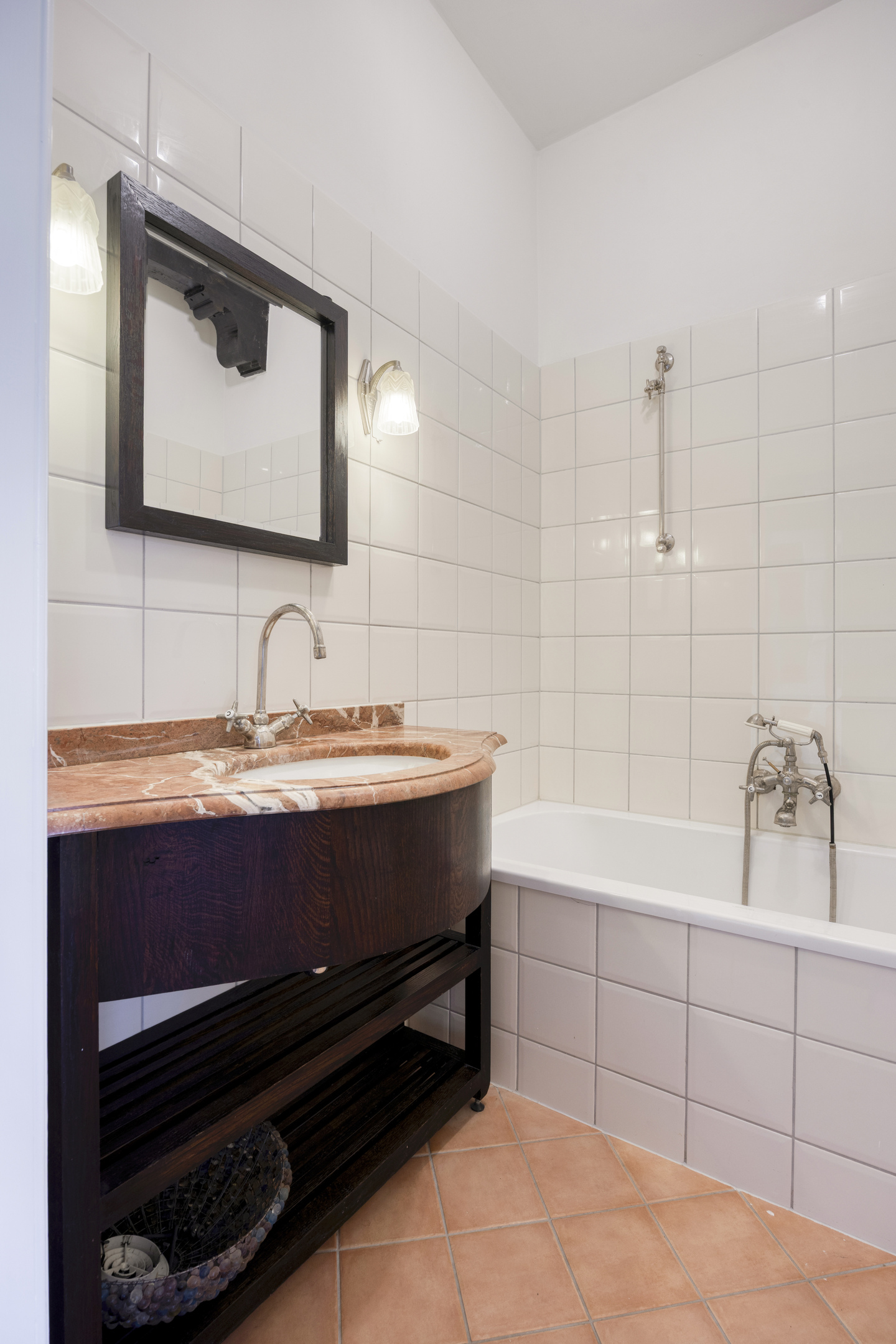 Kamer voorzijde met authentieke details en tuinkamer met openslaande deuren en binnendoor naar nr. 11. Keuken met inbouwapparatuur en badkamer met ligbad. wastafel en wc.