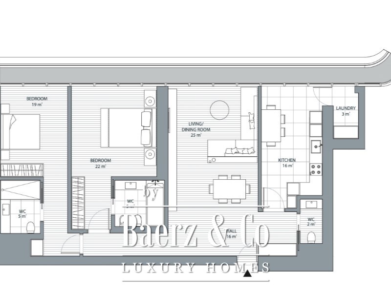 Beide slaapkamers met eigen badkamer zijn zorgvuldig geproportioneerd, de eerste meet 22 m², de tweede 19 m², elk voorzien van een badkamer van 5 m² en inbouwkasten voor discrete opslag. De volledig uitgeruste keuken van 16 m² wordt aangevuld door een aparte wasruimte en een gastentoilet en combineert functionaliteit met hedendaags ontwerp.
