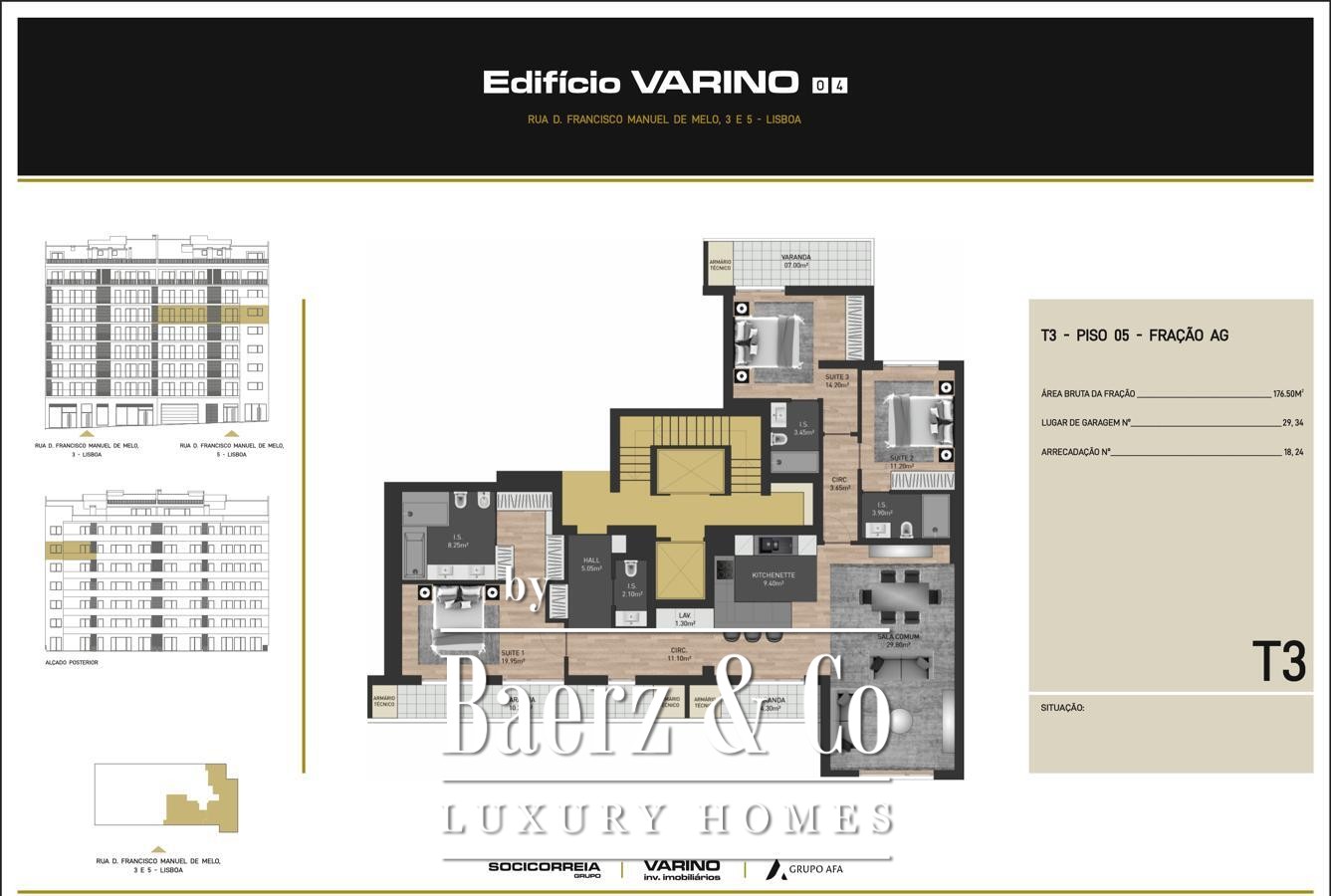 Appartement Avenidas Novas Lissabon beschikt over een uitzonderlijk adres in het hart van de stad, direct grenzend aan de rustige uitgestrektheid van het Eduardo VII Park. Deze in 2024 opgeleverde woning biedt een unieke indeling met drie slaapkamers, waarbij elke suite is ontworpen voor comfort en privacy, met een bruto privaat woonoppervlak van 176,5 m². De plattegrond getuigt van een doordacht ontwerp met een royale open woon- en keukenruimte, vier badkamers en vloeiende overgangen tussen de verschillende vertrekken die uitnodigen tot ontspanning en sociale bijeenkomsten.